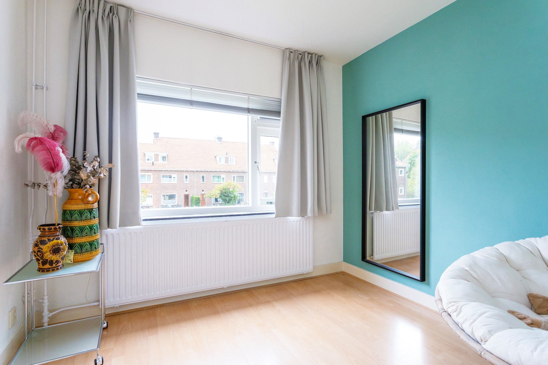 Op de eerste verdieping vindt u de overloop en twee slaapkamers. De overloop is v.v. ramen met mooie lichtinval. De achterste slaapkamer is royaal (ca. 20m2) en heeft toegang tot het dakterras. De vloeren van de slaapkamers zijn afgewerkt met laminaat of planken, de plafonds en de wanden zijn v.v. stucwerk.