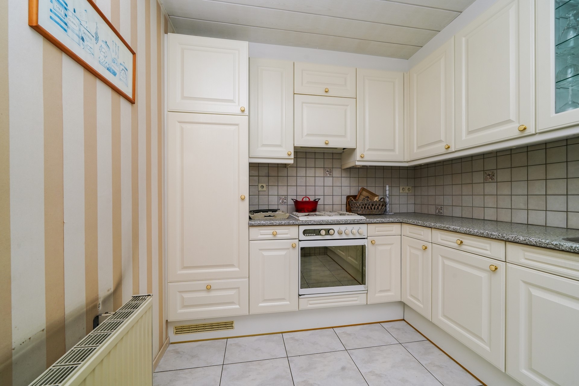 Aan de achterzijde bevindt zich de gesloten keuken, die dankzij de hoek indeling prettig en ruim aanvoelt. Het keukenblok is eenvoudig maar compleet uitgevoerd met kookplaat, spoelgedeelte en voldoende werk- en opbergruimte. De keuken isafsluitbaar met een deur richting de woonkamer, wat rust en overzicht biedt tijdens het koken. Daarnaast beschikt de keuken over een deur naar de achtertuin.