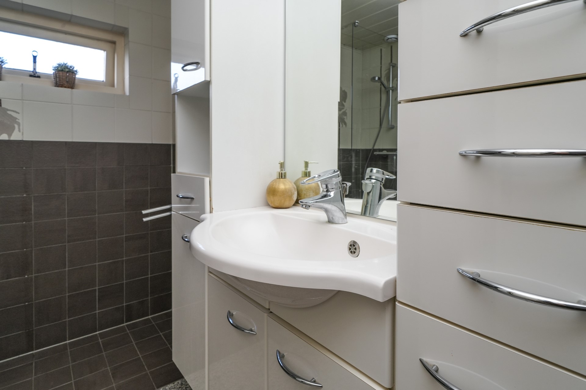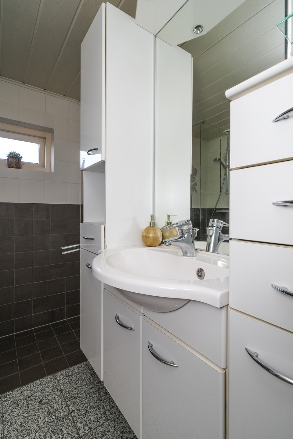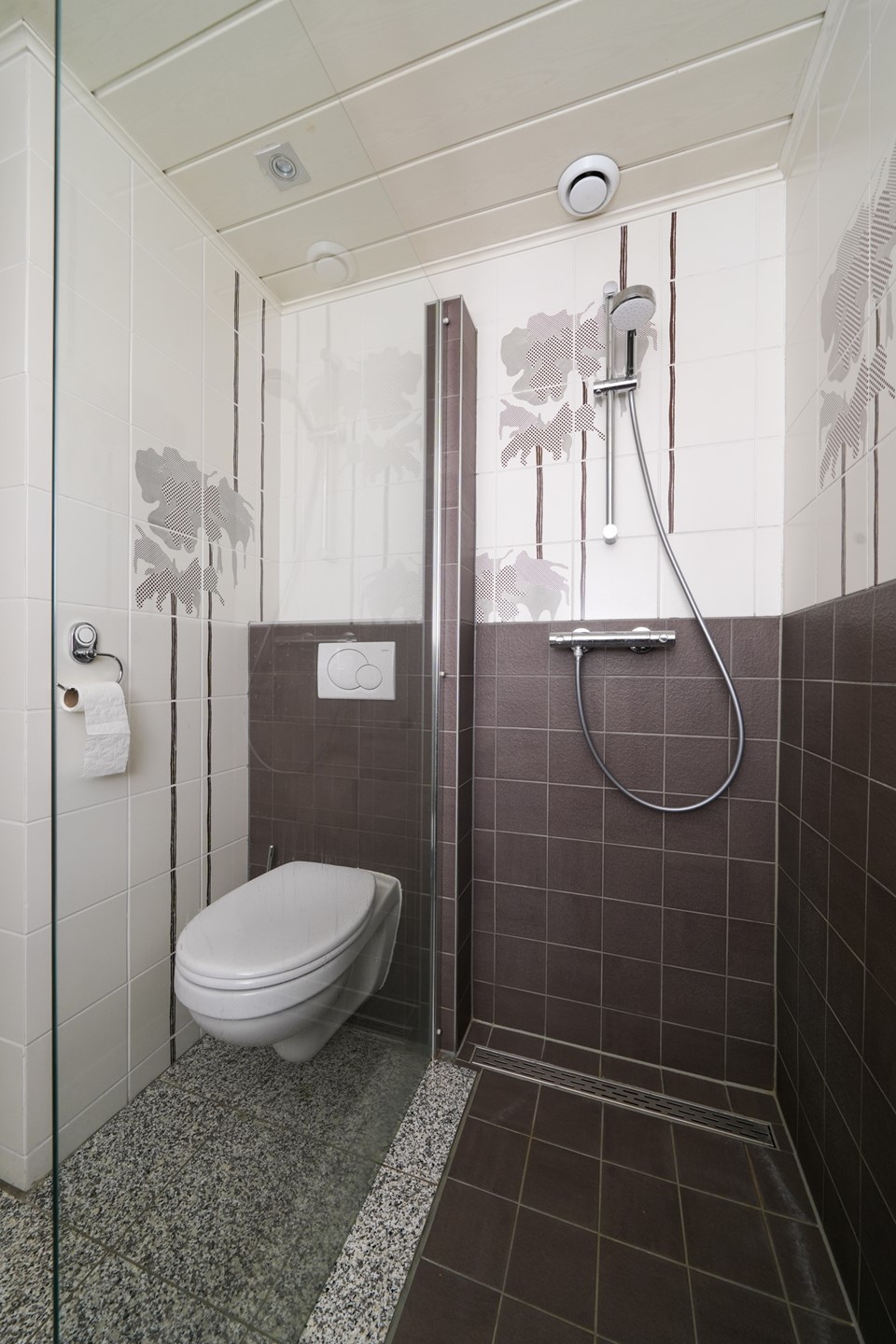 De badkamer is compact maar efficiënt ingedeeld, voorzien van een inloopdouche, wastafelmeubel en toilet. Tevens mogelijkheid voor opstelling van wasmachine en droger.