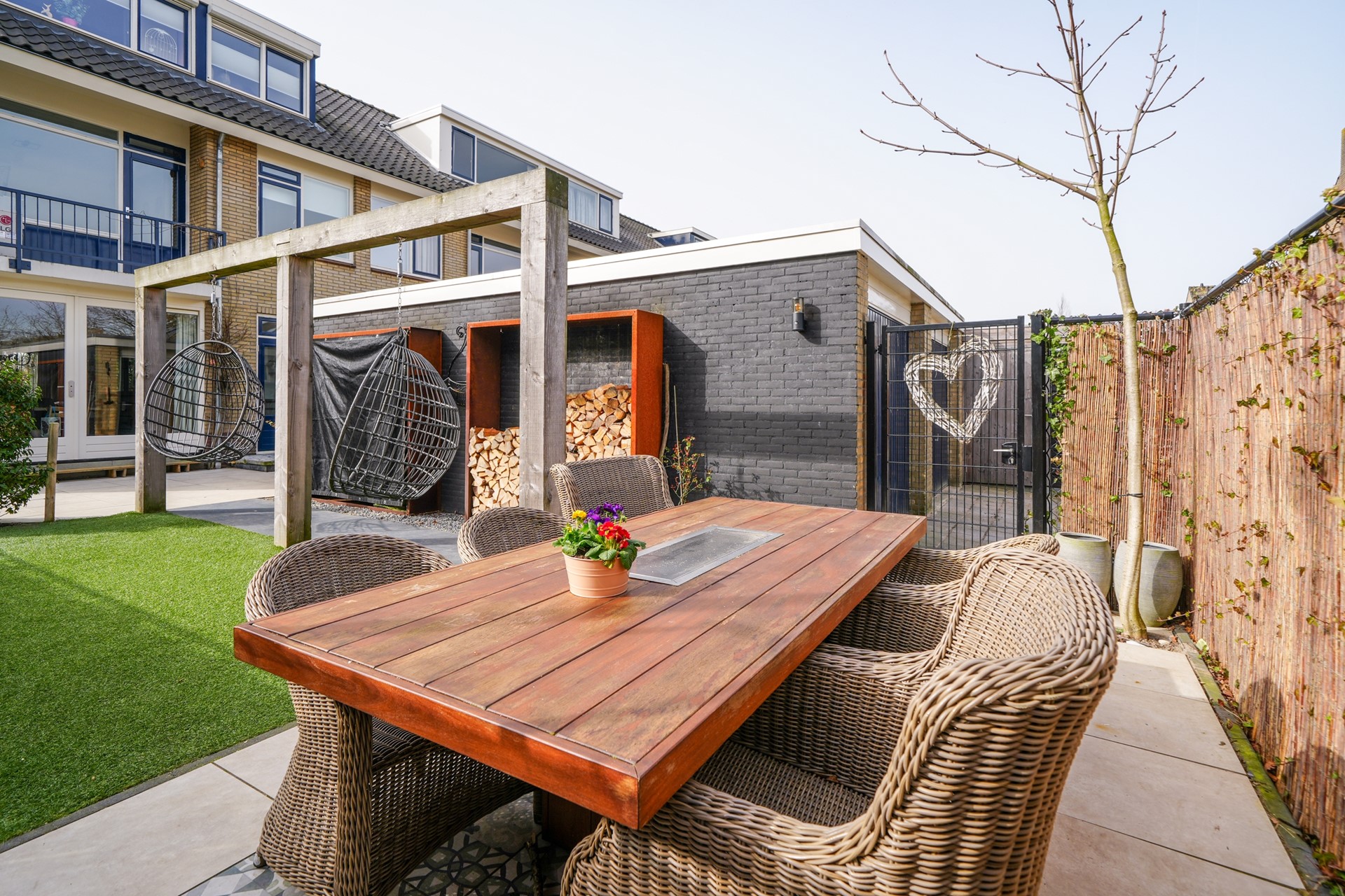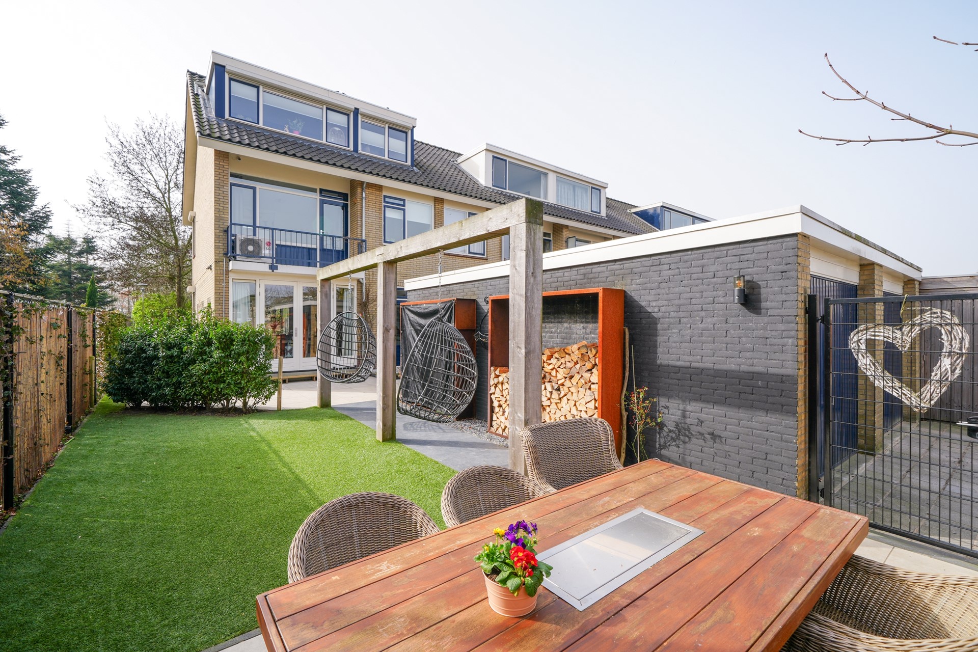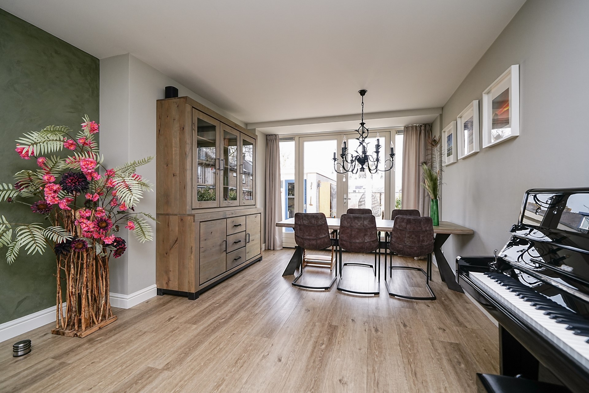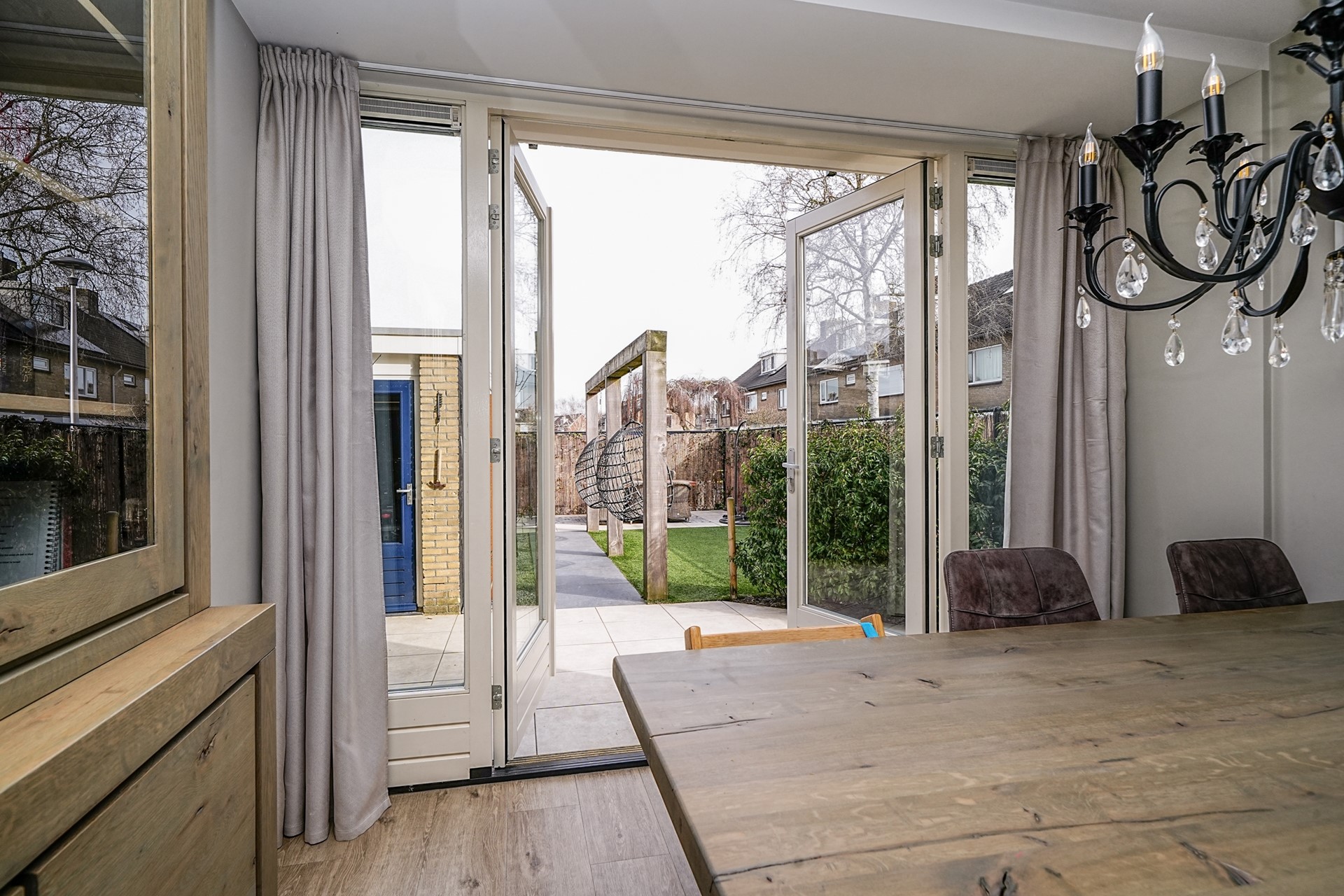 De openslaande deuren zorgen bovendien voor een mooie verbinding met de achtertuin, waardoor binnen en buiten naadloos in elkaar overlopen op zonnige dagen.