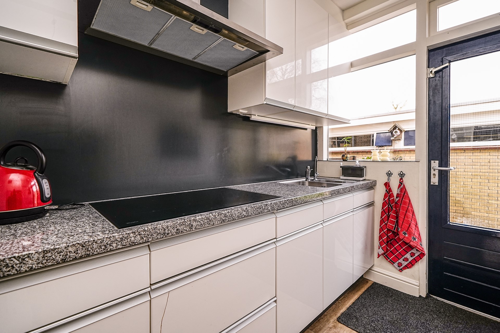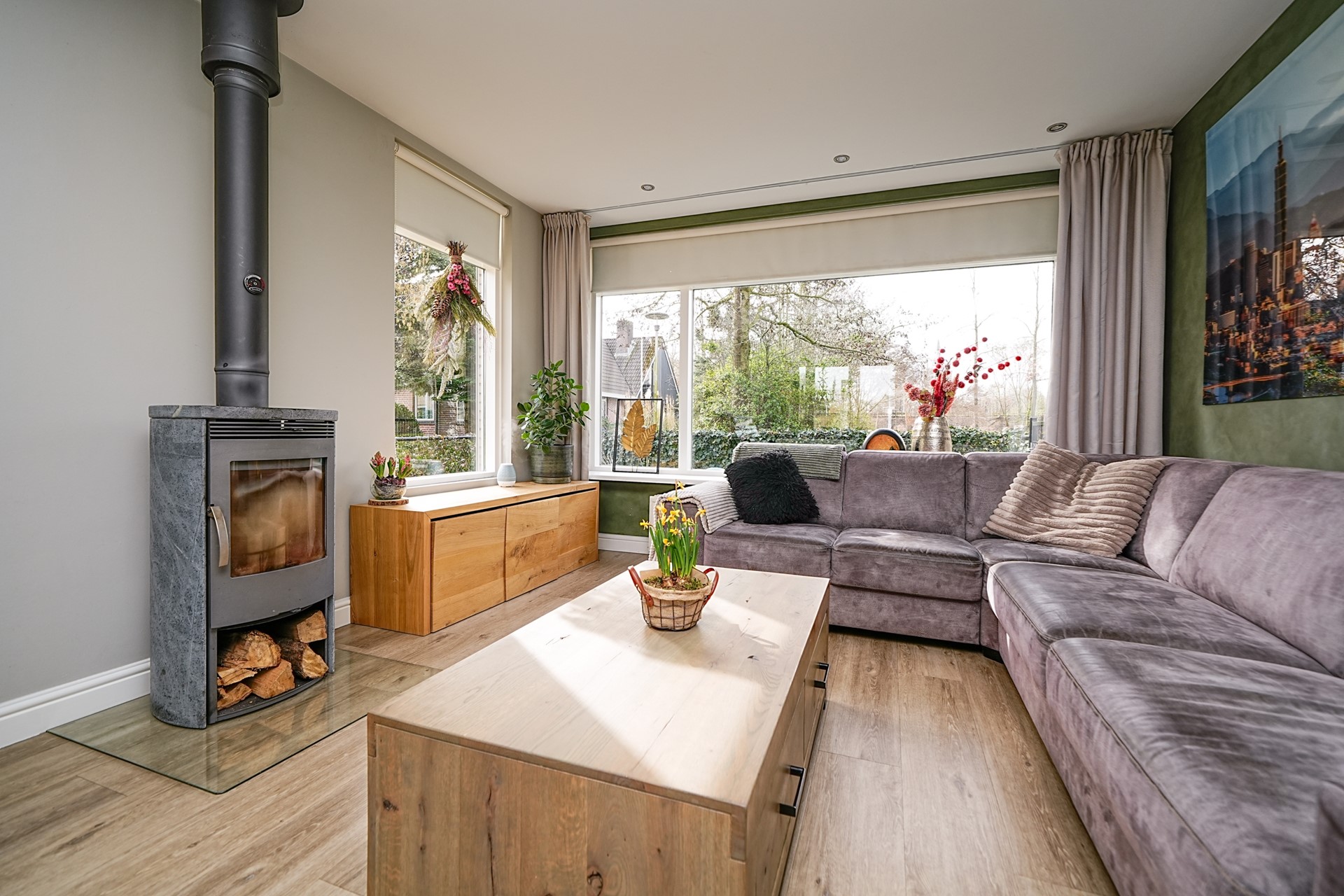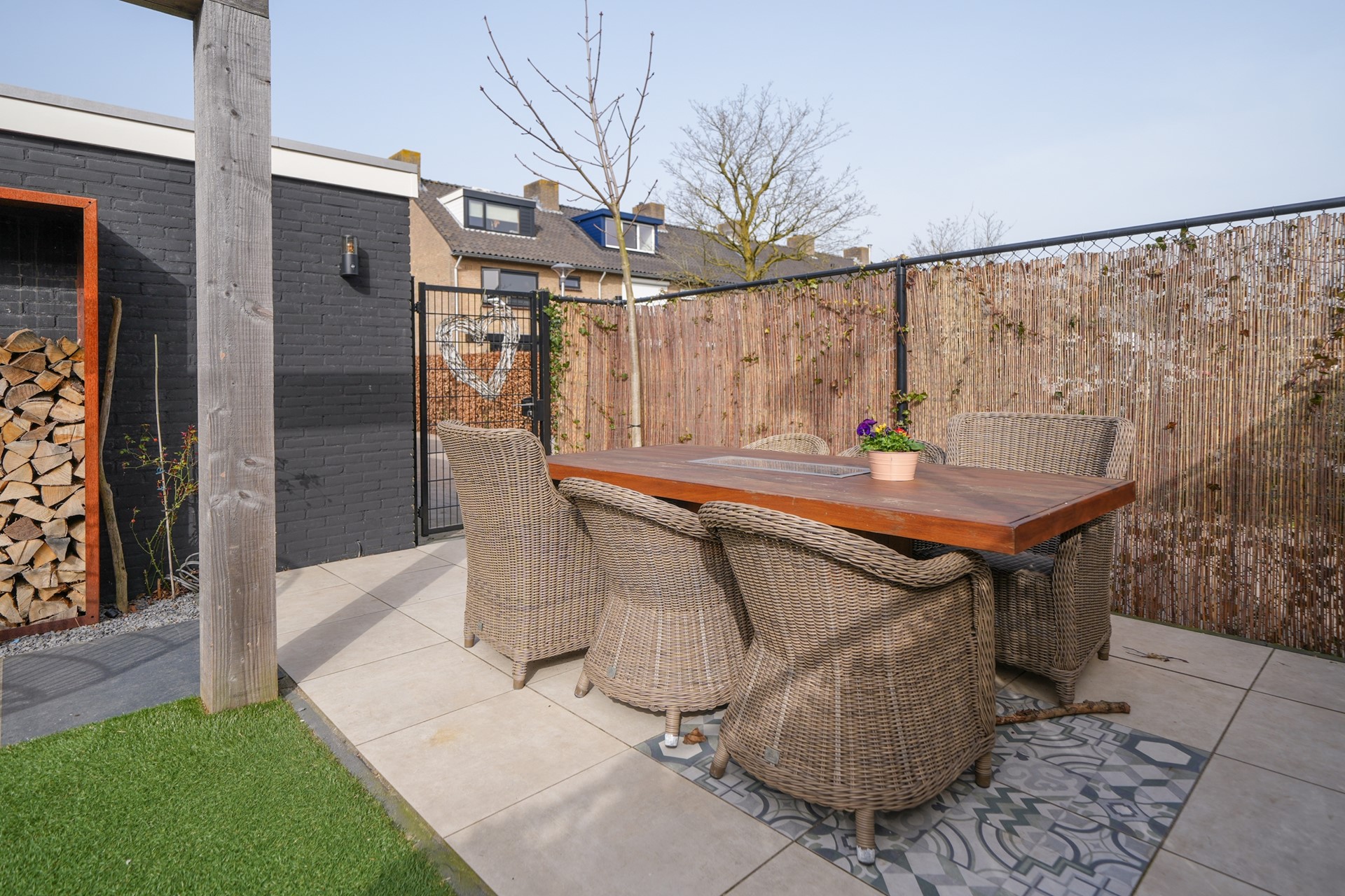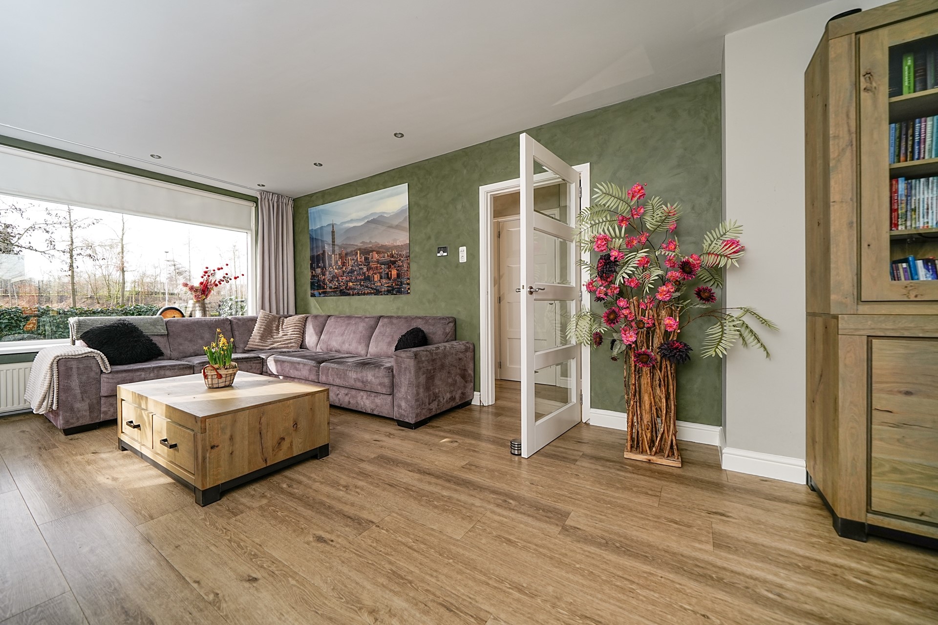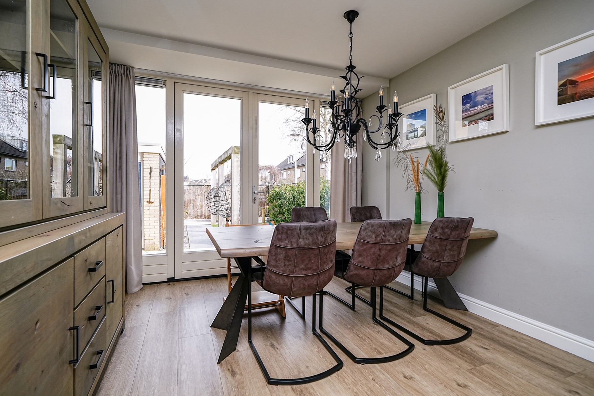 De openslaande deuren zorgen bovendien voor een mooie verbinding met de achtertuin, waardoor binnen en buiten naadloos in elkaar overlopen op zonnige dagen.