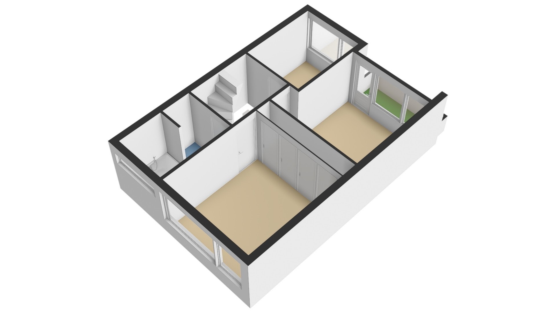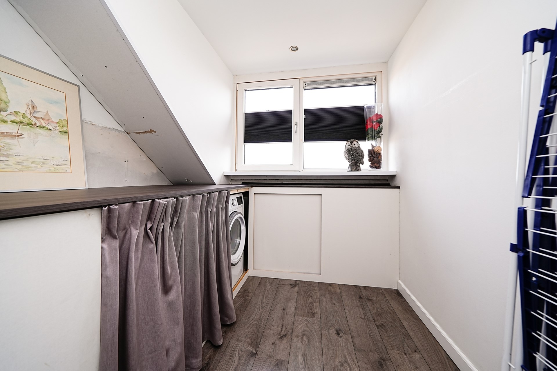 Aan de achterzijde van deze verdieping is aandacht besteed aan praktisch wooncomfort. Hier bevindt zich namelijk een aparte wasruimte, ideaal voor het plaatsen van een wasmachine en droger. Hierdoor blijft het netjes uit het zicht van de overige woonruimtes. Daarnaast is er een handige berging, perfect voor het opbergen van koffers of seizoensspullen.