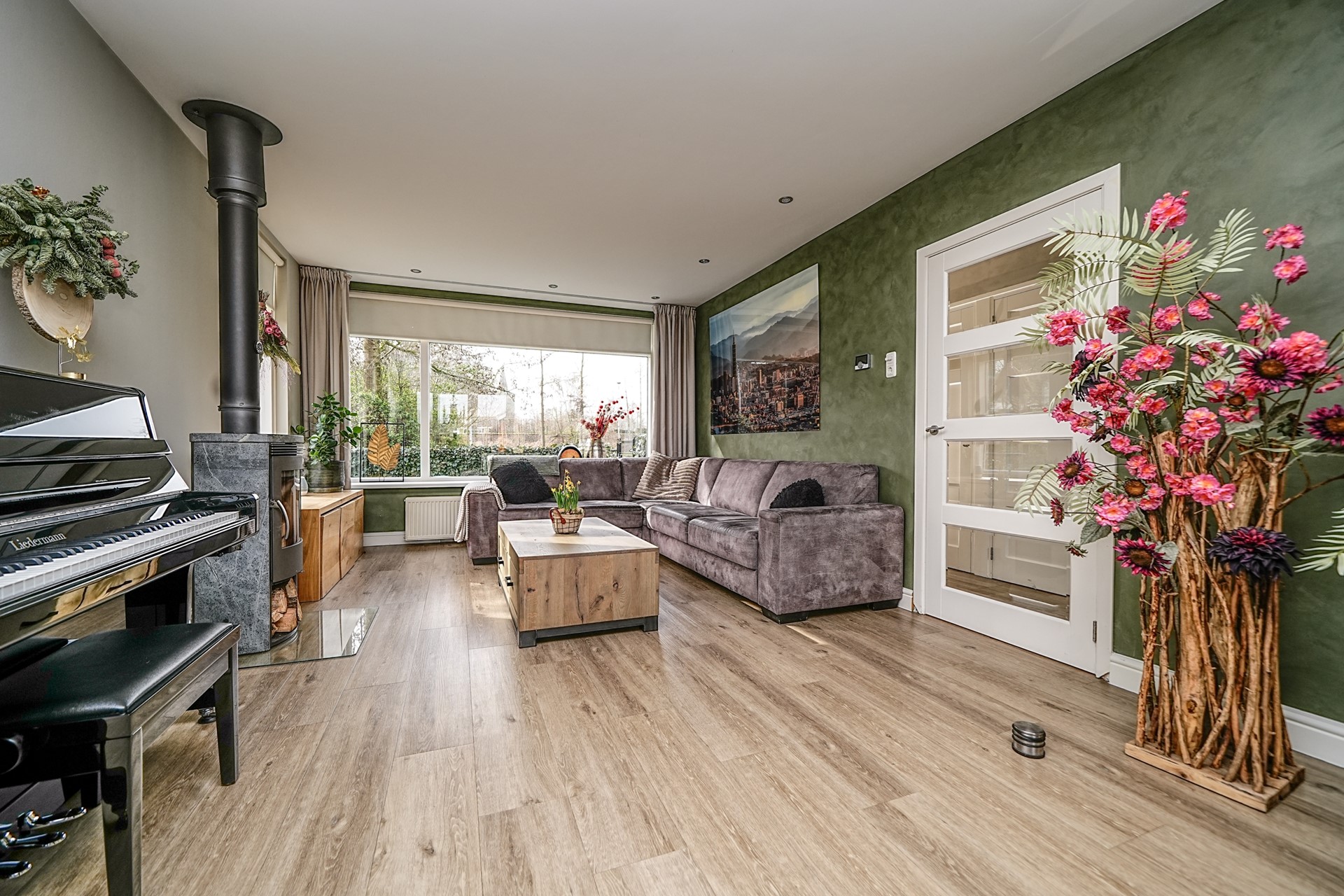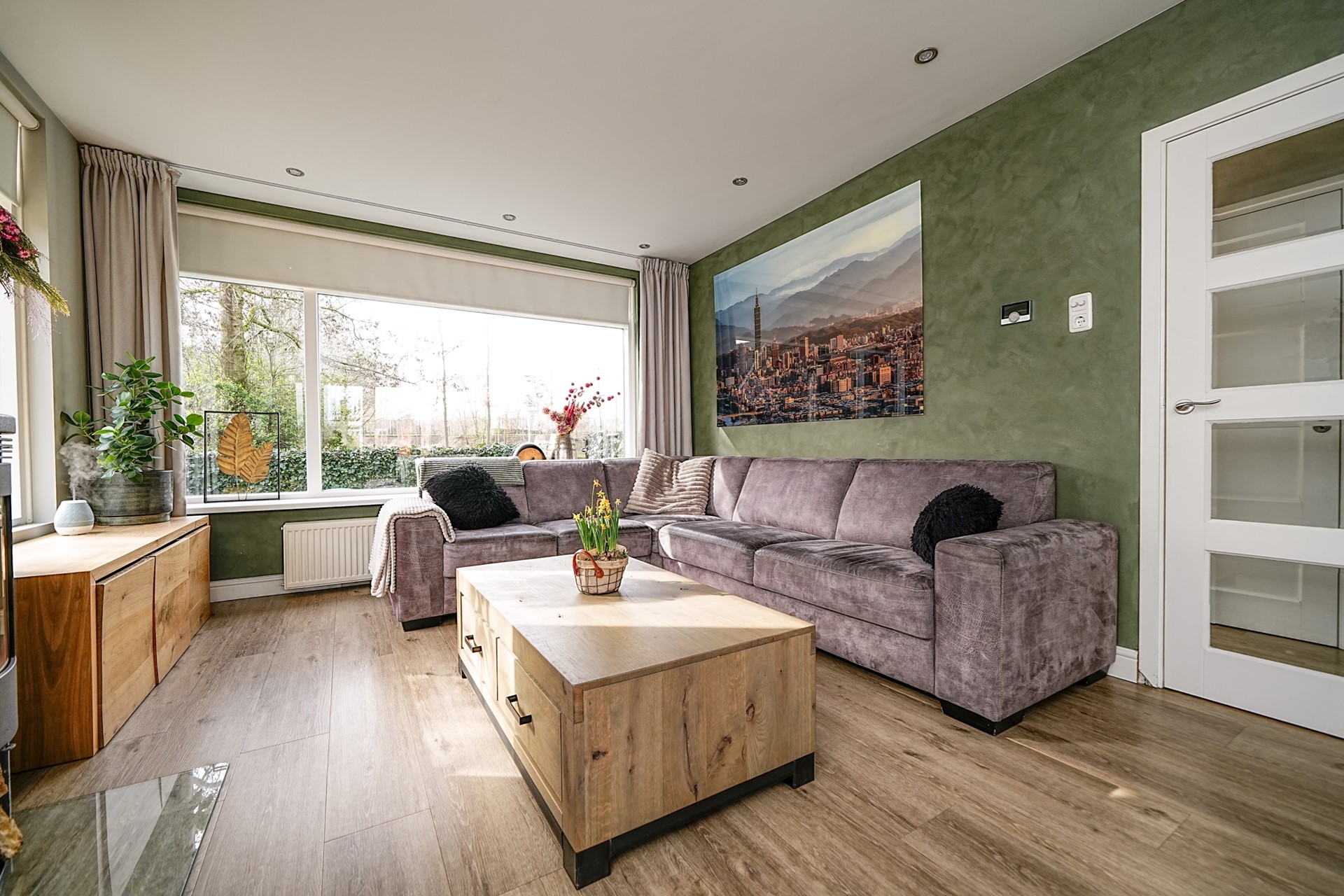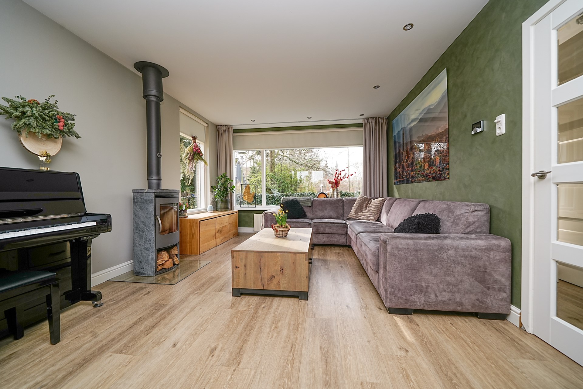 Door de grote raampartijen en dubbele openslaande deuren aan de achterzijde kunt u optimaal profiteren van deze ruimte met veel natuurlijk licht. Dit maakt de woonkamer bijzonder aangenaam en biedt volop mogelijkheden voor een ruime zit- en eethoek.