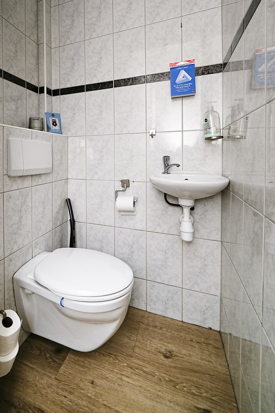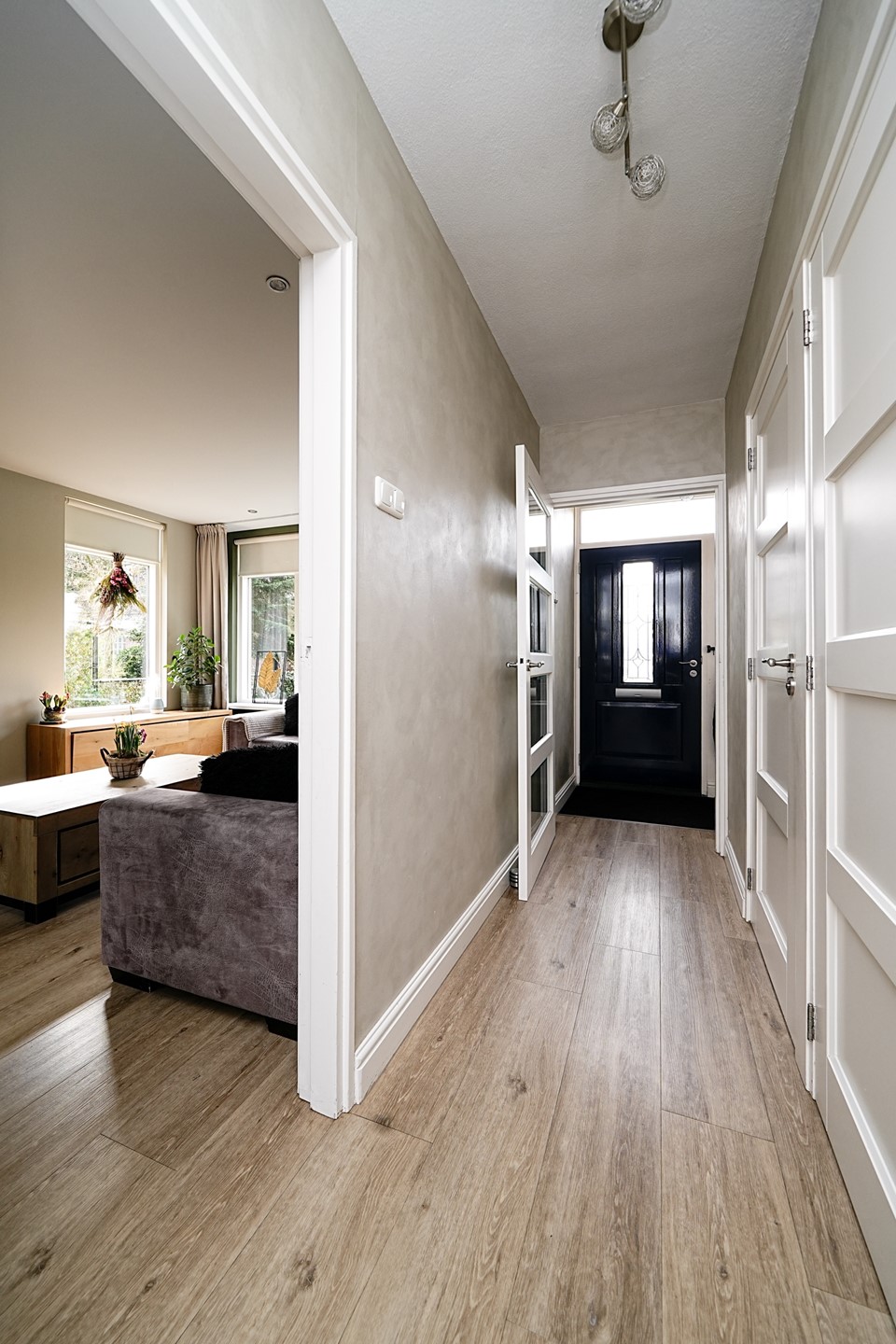 Via de entree aan de voorzijde komt u binnen in de hal, waar zich direct de meterkast en iets verderop de toegang tot het aparte toilet bevindt. De hal vormt het centrale punt van de woning en geeft tevens toegang tot een handige bergkast onder de trap, ideaal voor het opbergen van jassen, schoenen en huishoudelijke spullen.