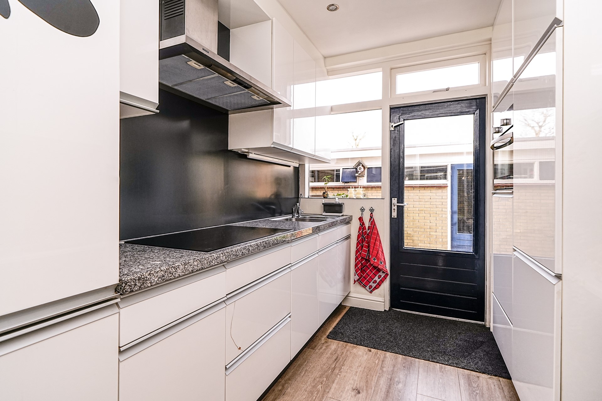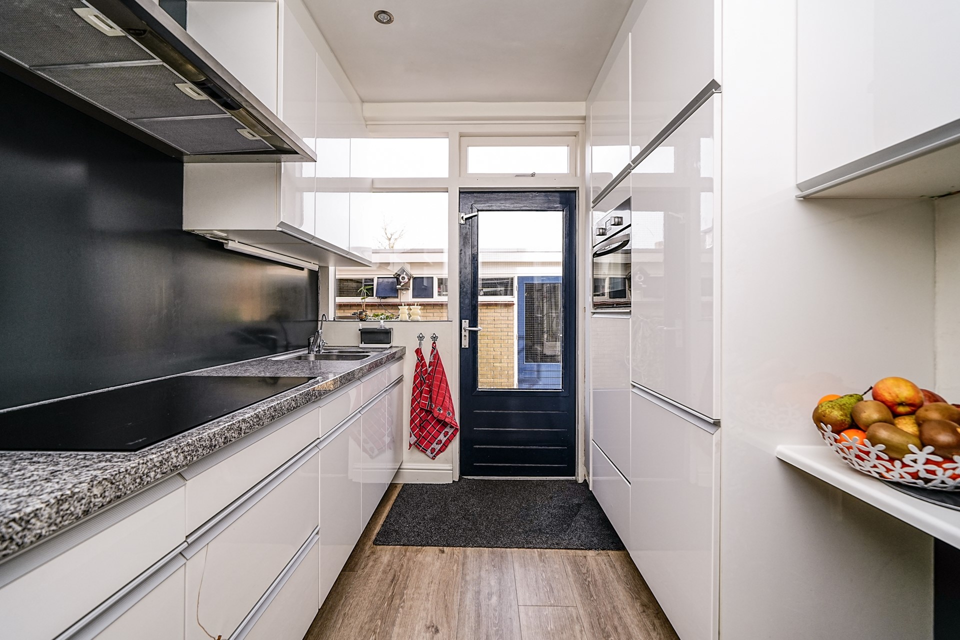 Aan de achterzijde van de woning bevindt zich de keuken, uitgevoerd in een praktische opstelling. De keuken beschikt over een kookplaat, spoelbak en voldoende werk- en kastruimte. Vanuit de keuken is via de achterdeur toegang tot de achtertuin. Vanuit de hal loopt u ook door naar de royale woonkamer.