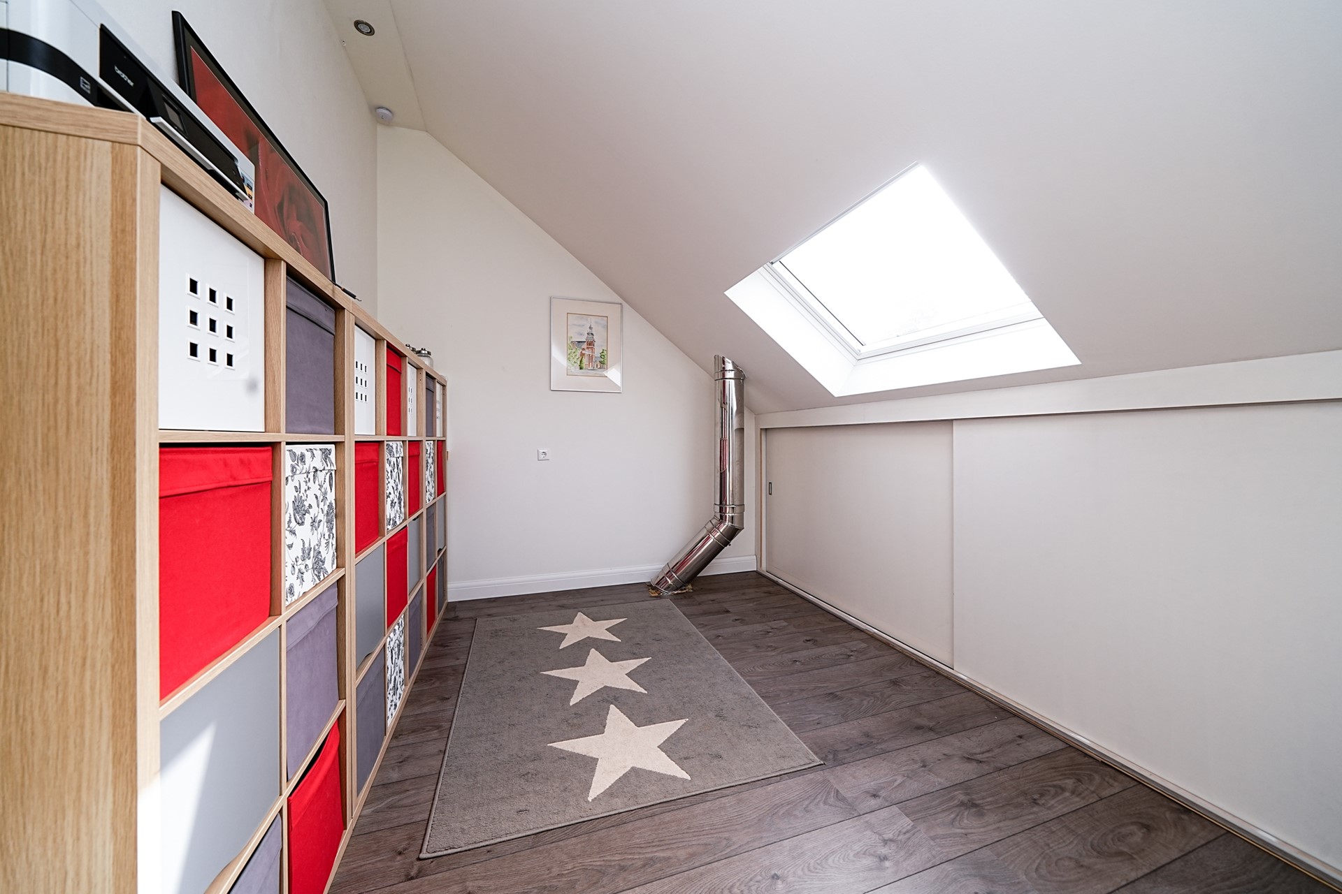 Bij aankomst op de zolderverdieping komt u op de overloop, waar direct opvalt hoe efficiënt de beschikbare ruimte op deze verdieping wordt benut. De indeling is logisch en praktisch.