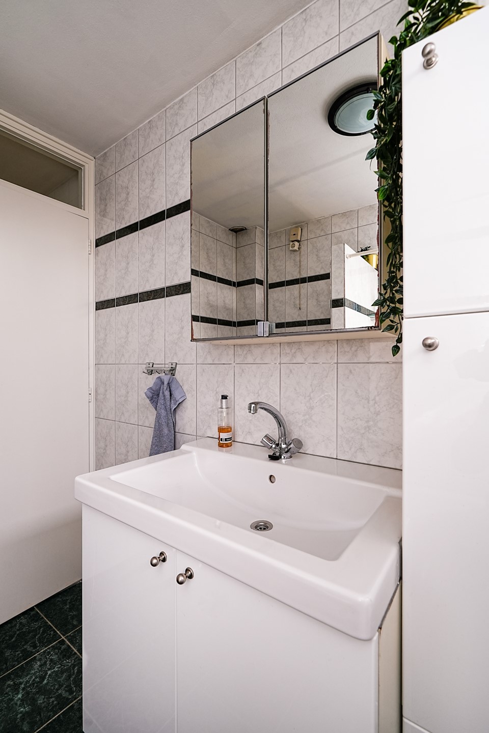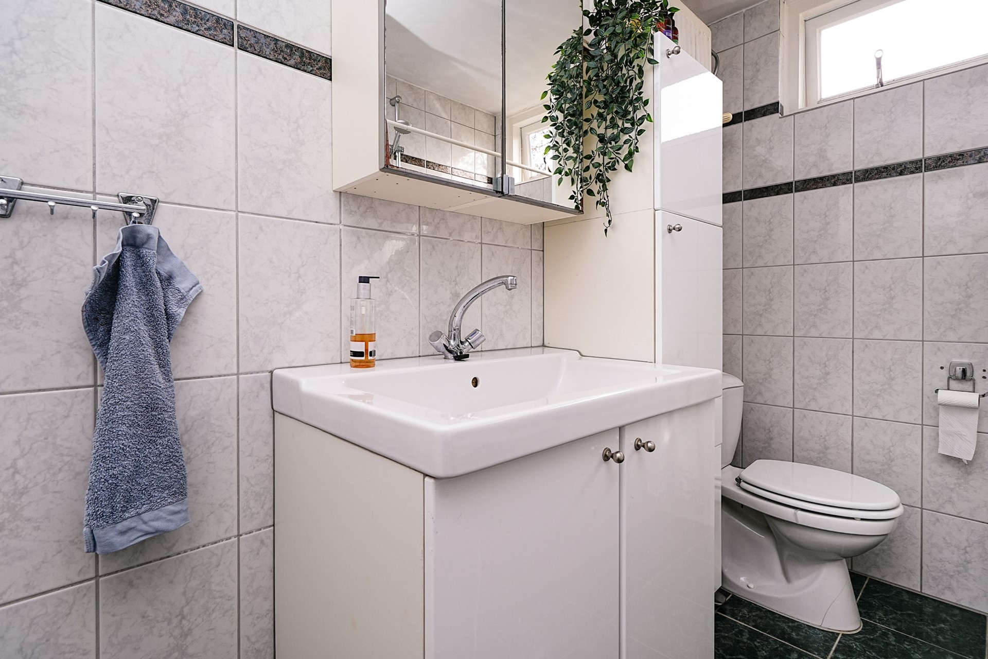 De badkamer bevindt zich aan de voorzijde van de woning en is praktisch ingericht met een ligbad, wastafel en toilet. Dankzij het raam is er sprake van natuurlijke ventilatie, wat zorgt voor extra comfort.