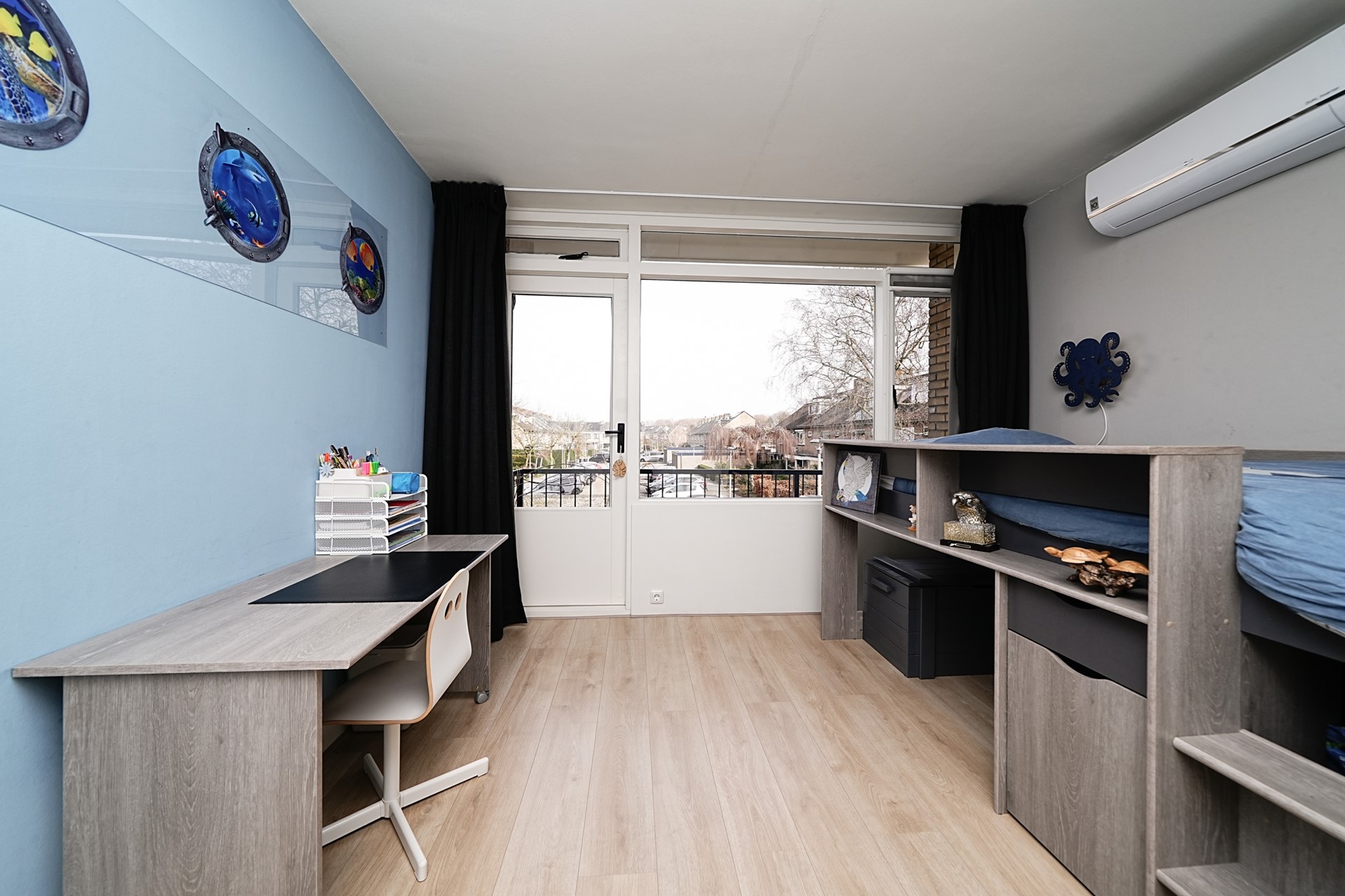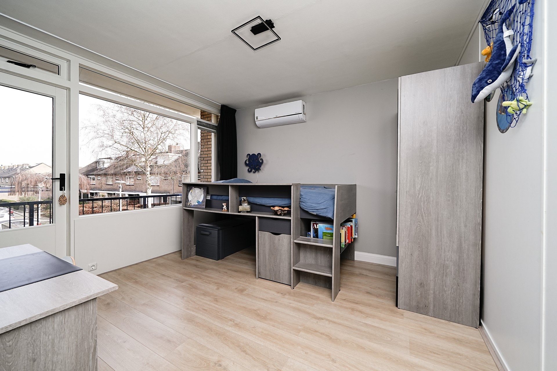 Aan de achterzijde ligt de tweede slaapkamer, parallel, van goed formaat en ook voorzien van airconditioning. Vanuit deze kamer heeft u toegang tot het balkon. De derde slaapkamer bevindt zich gelijk aan de achterzijde van de woning en is een kamer die zich uitstekend leent als werkkamer of kinderkamer.