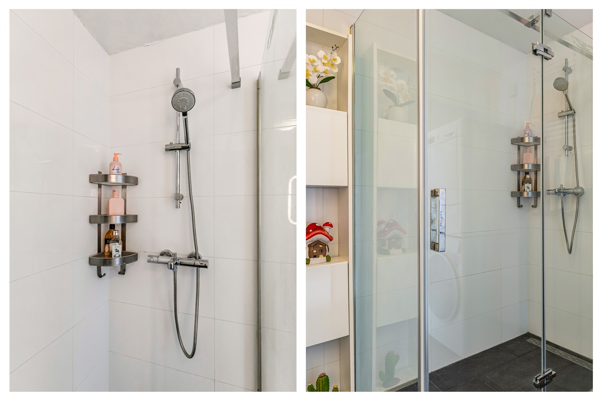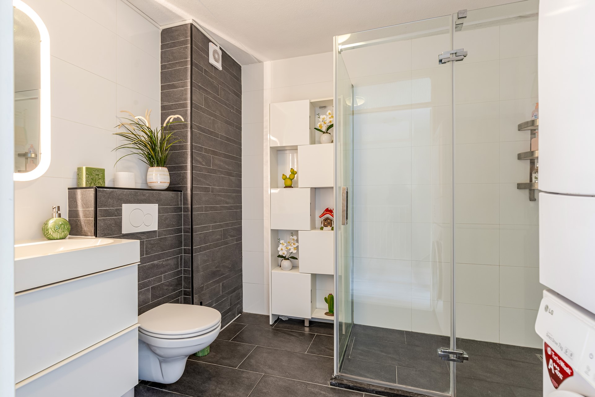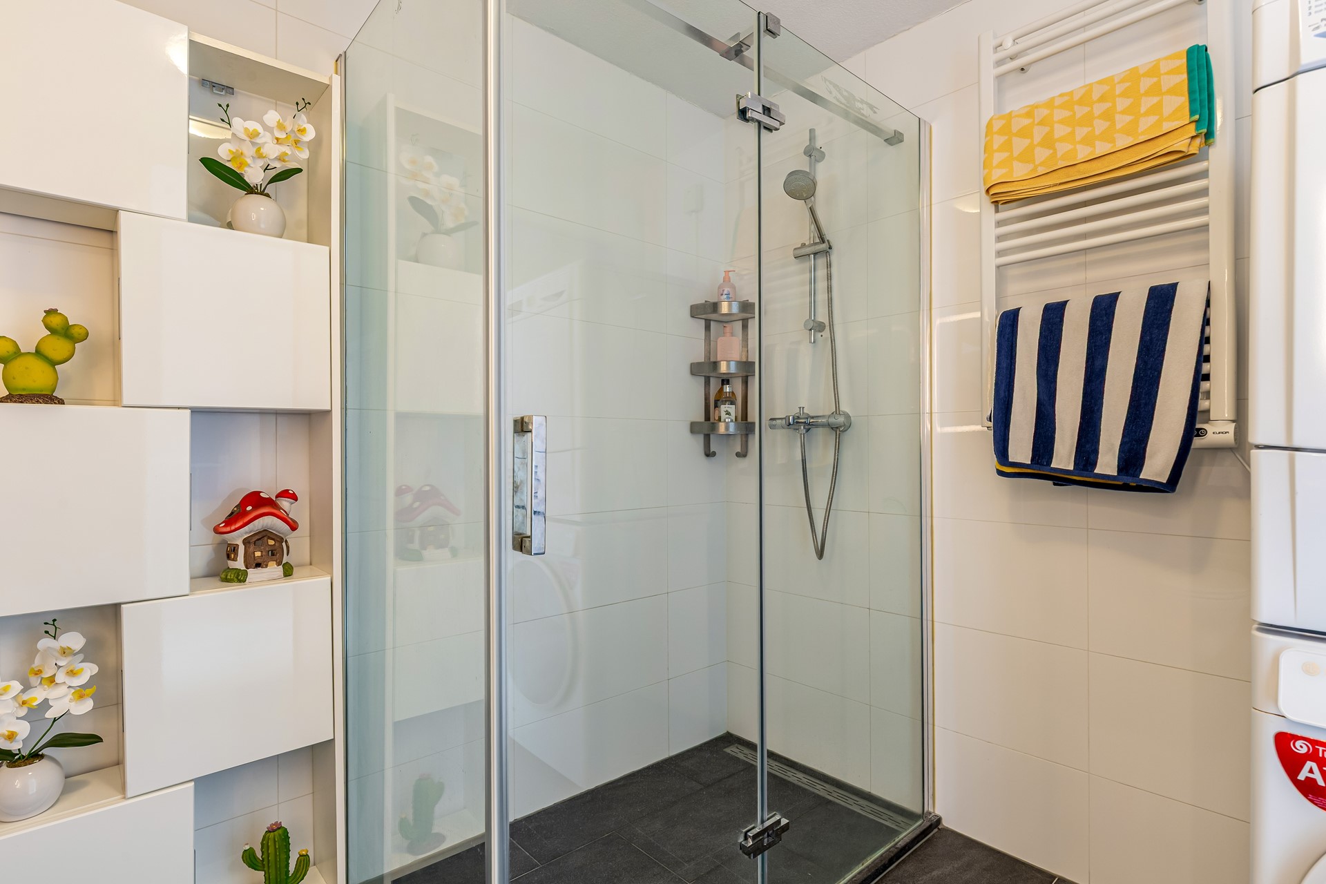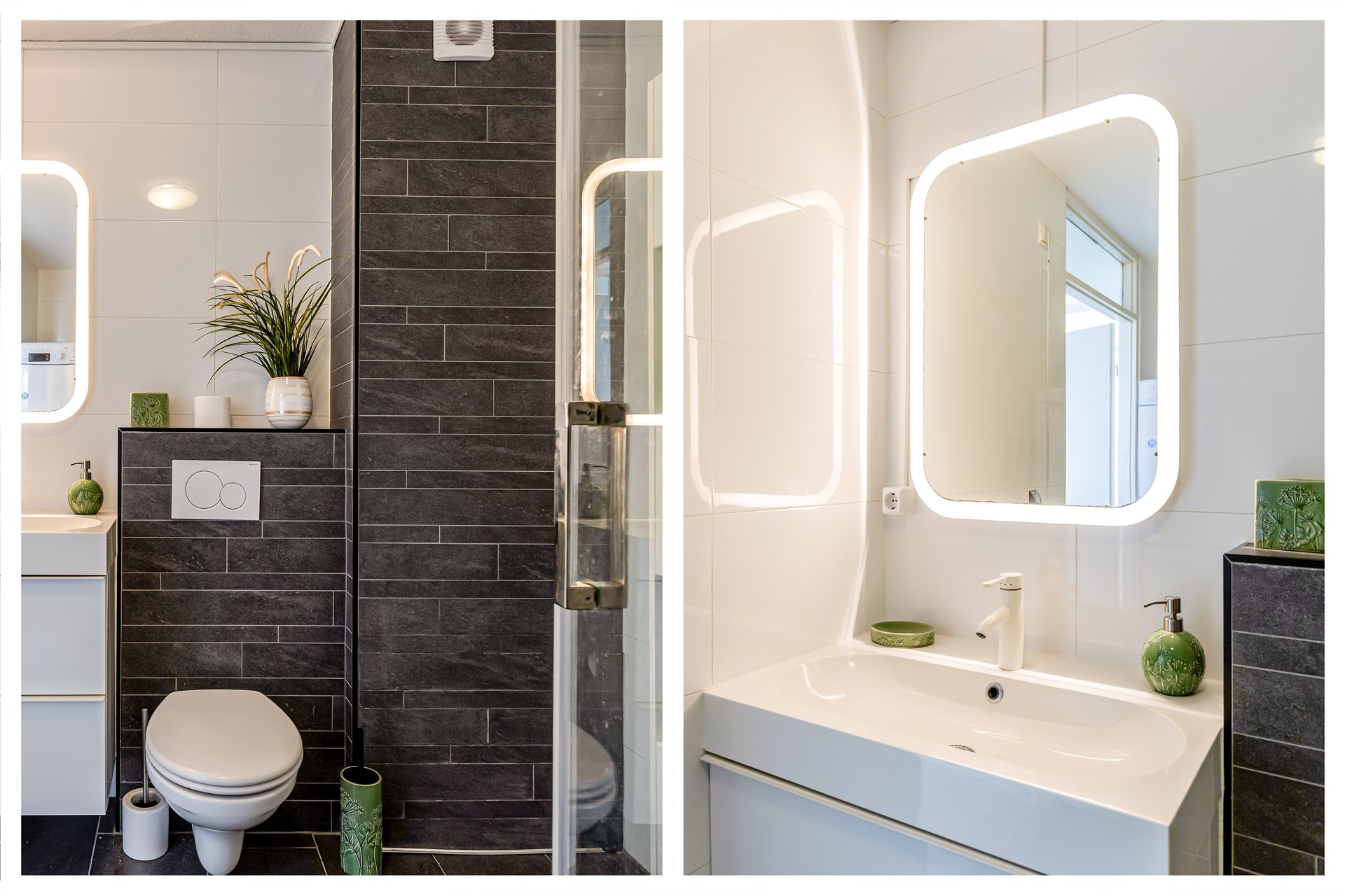 De badkamer is geheel van deze tijd en is voorzien van een wastafel met meubel, tweede toilet, douchecabine en designradiator. De badkamer is heerlijk ruim waardoor er voldoende ruimte is om met meer mensen tegelijk door de badkamer te lopen. De aansluitingen voor wasmachine en droger zijn ook in de badkamer gesitueerd.