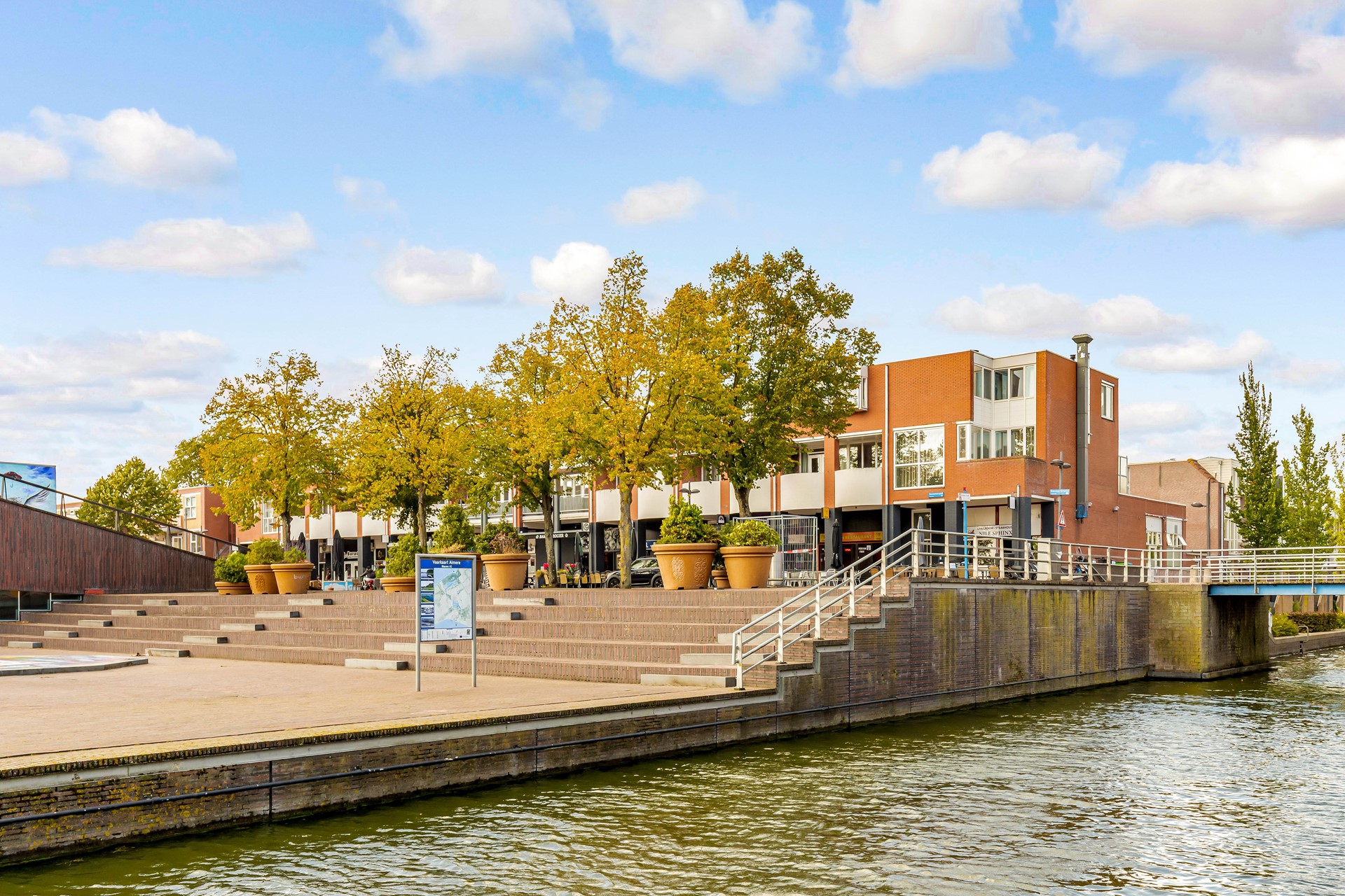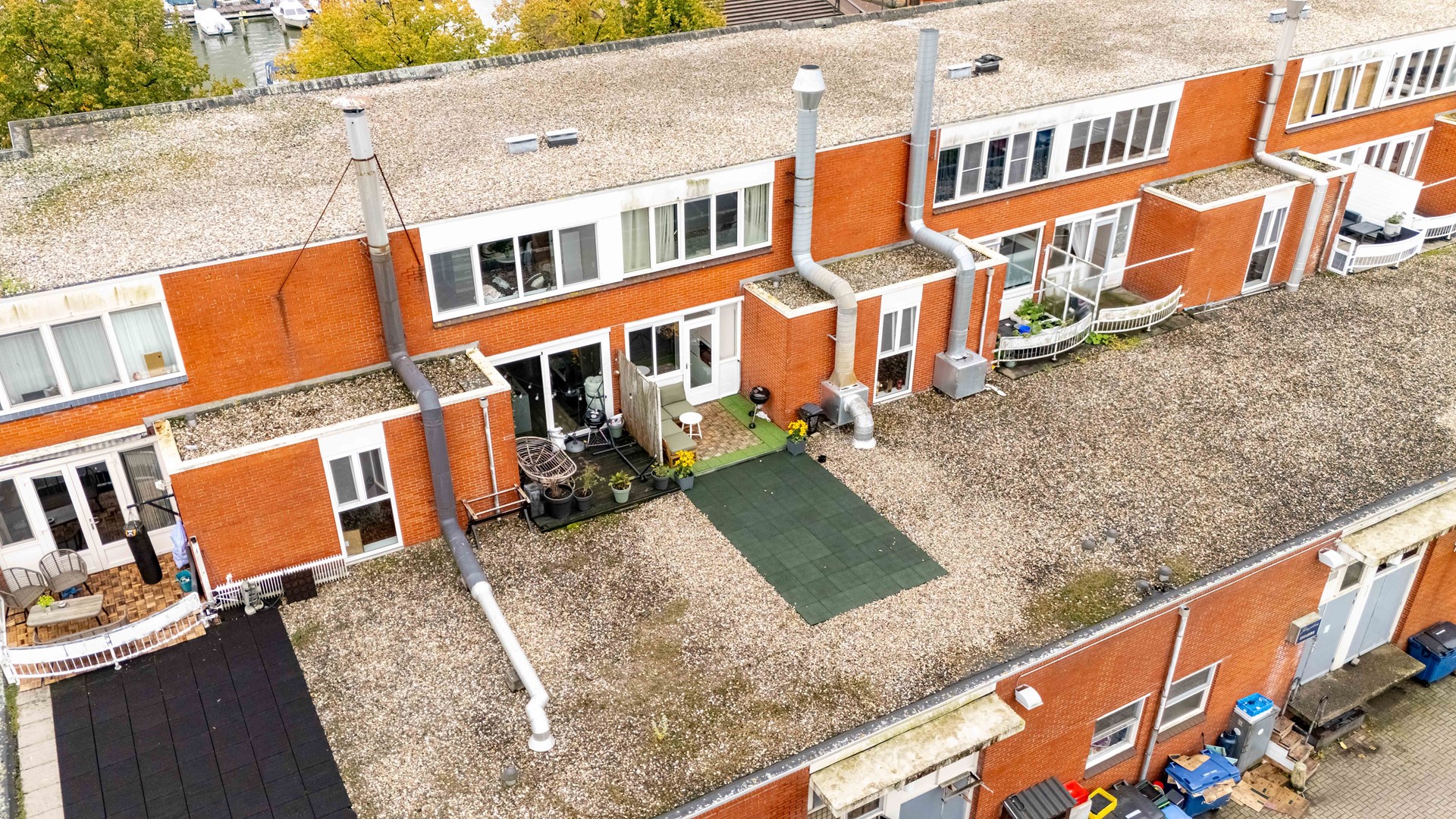 Vanuit de woonkamer is het grote overdekte balkon te bereiken. Deze is dermate ruim dat je hier een leuke zithoek kwijt kan en heerlijk kan genieten van het ochtend/middagzonnetje. Vanuit het balkon heb je leuk uitzicht over het haventje en de kleine terrasjes. Tussen de bomen door kijk je weg richting het Weerwater.