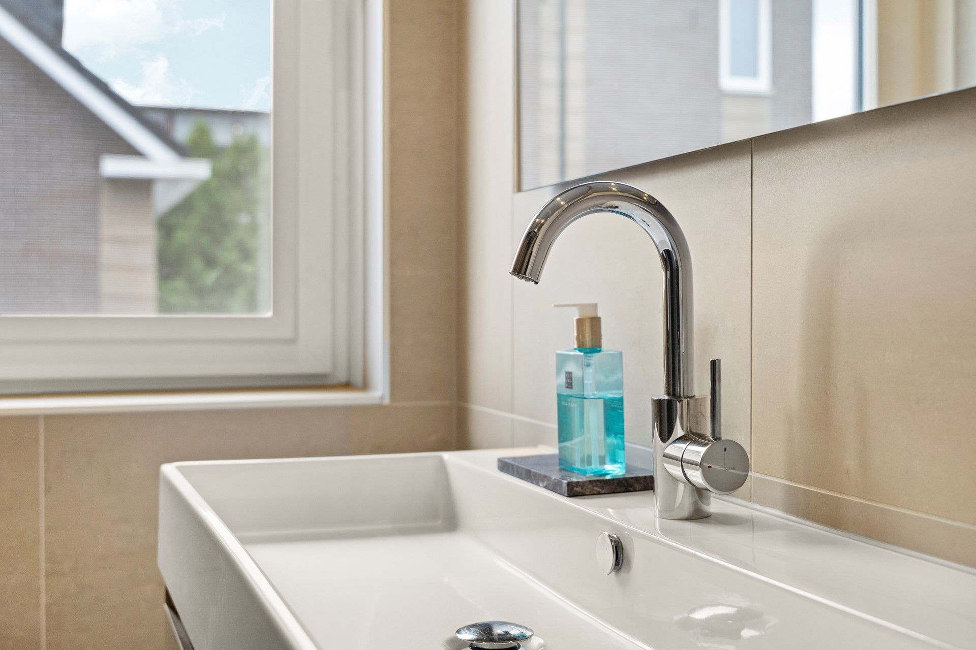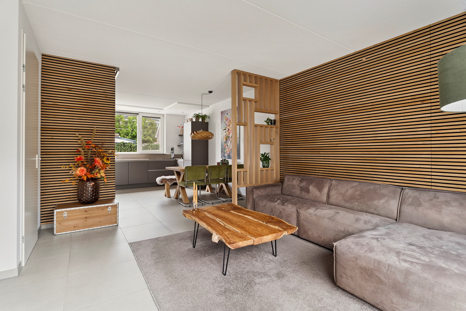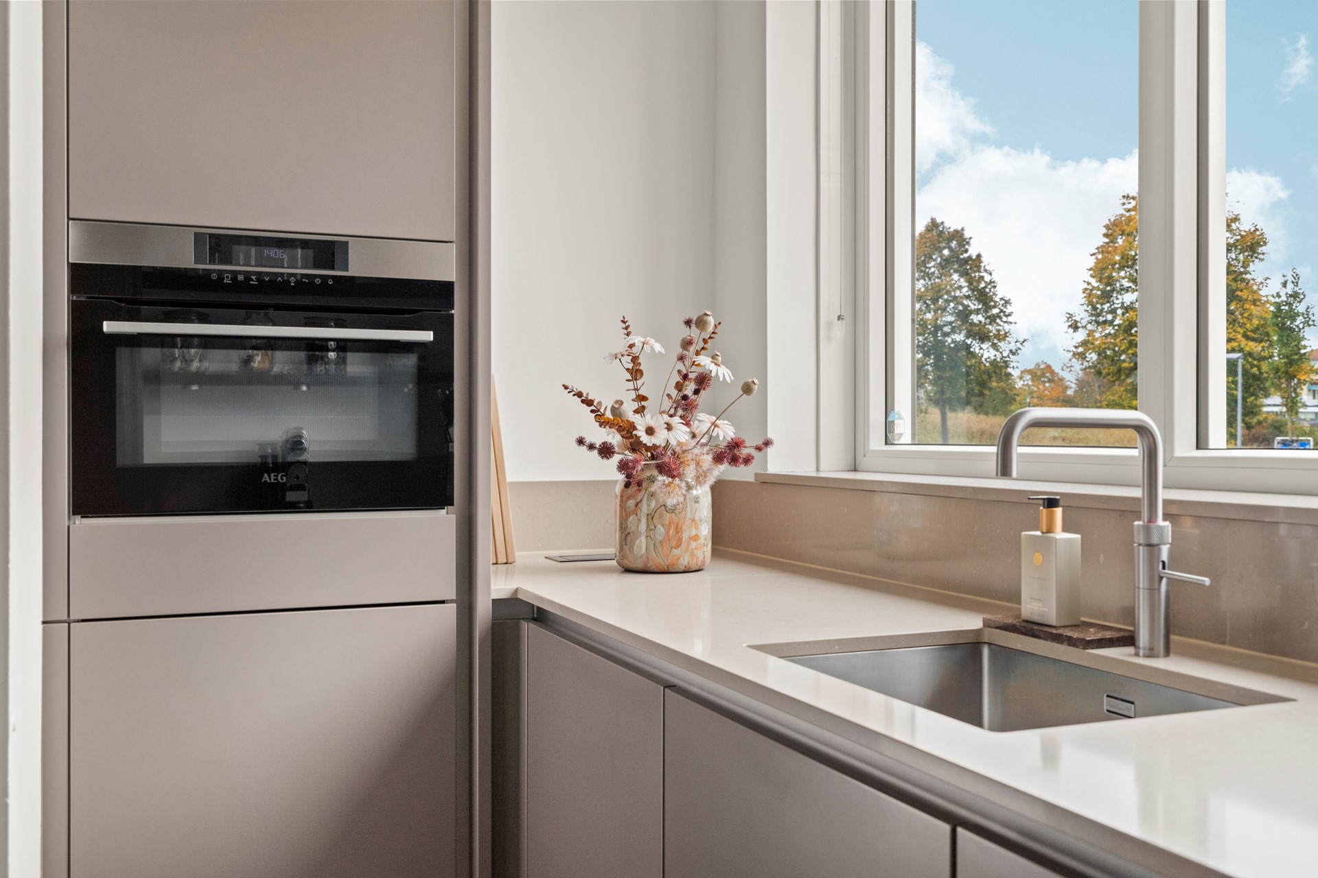 Via de verzorgde voortuin met eigen oprit kom je binnen in de hal met meterkast, modern toilet en trapopgang. De lichte woonkamer met grote schuifpui en airconditioning biedt direct uitzicht op de tuin. De gehele begane grond is voorzien van een hoogwaardige plavuizen vloerafwerking met vloerverwarming. Aan de voorzijde bevindt zich de open keuken (Nolte 2019), uitgevoerd in een U-opstelling met hoogwaardige inbouwapparatuur van AEG zoals een inductiekookplaat met afzuiging, een combi-oven, een koelvriescombinatie, quooker en vaatwasser. Dankzij de ruime opzet en moderne afwerking is deze keuken een heerlijke plek om te koken én samen te komen.