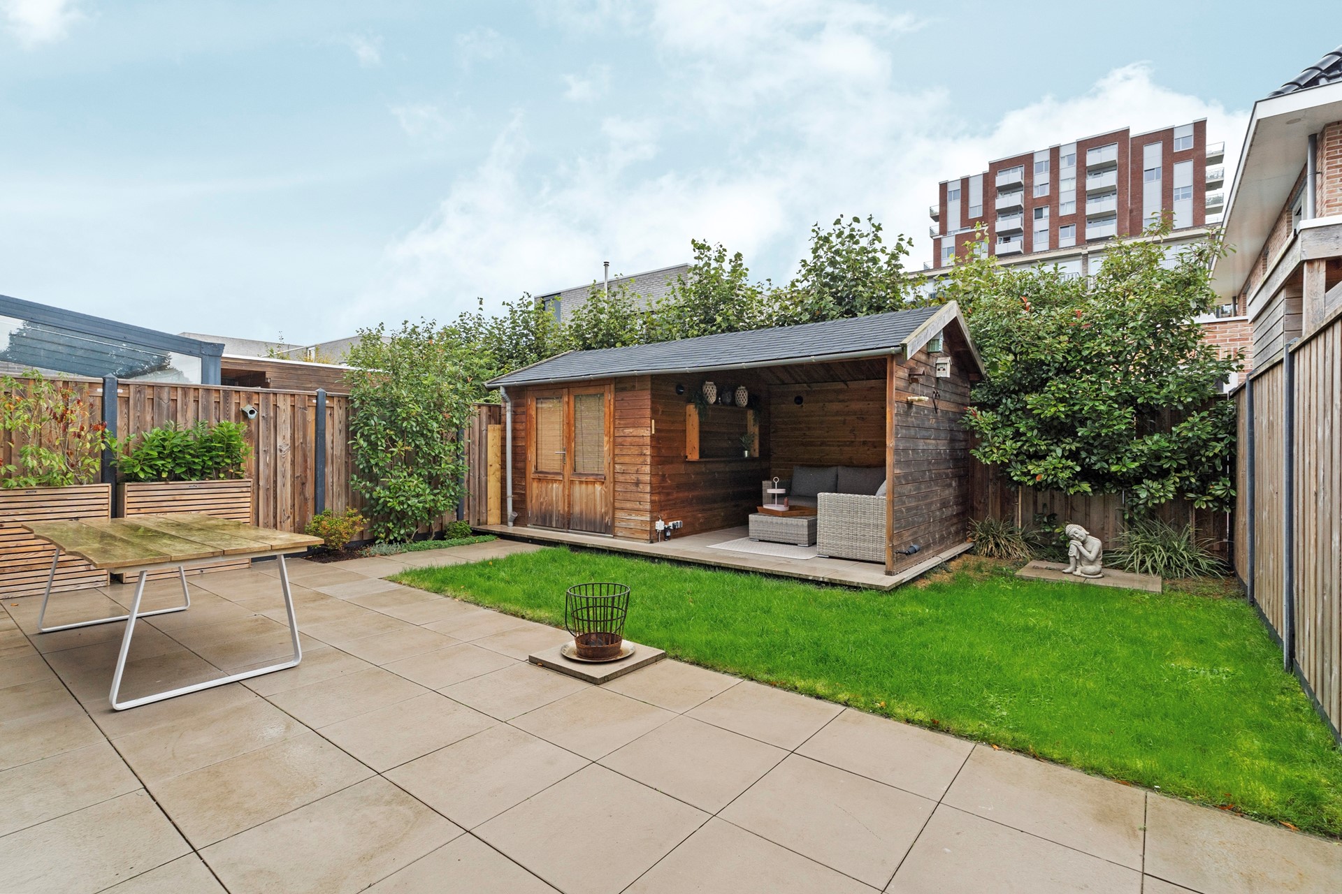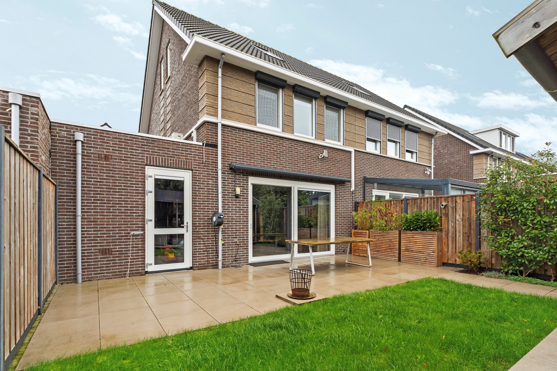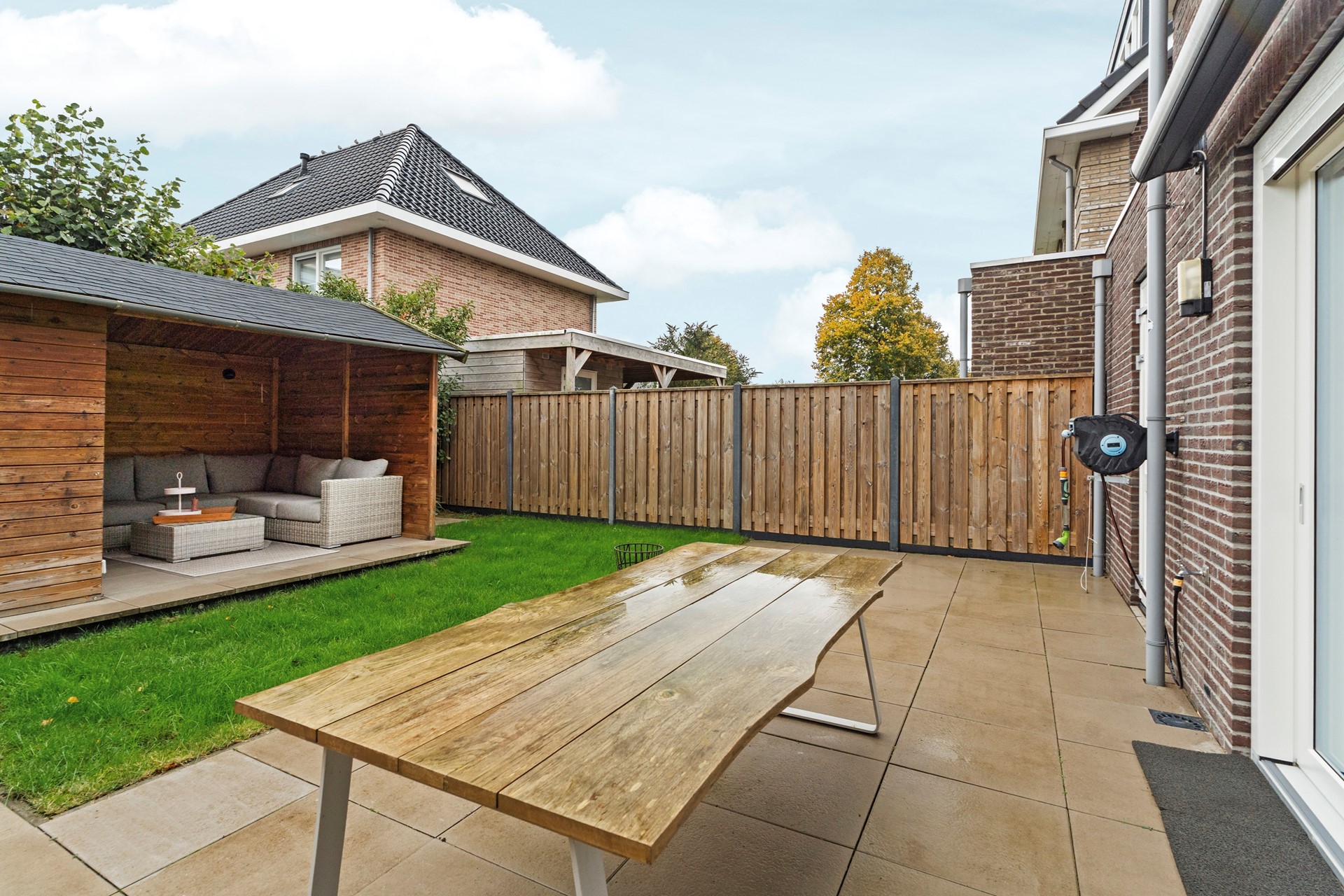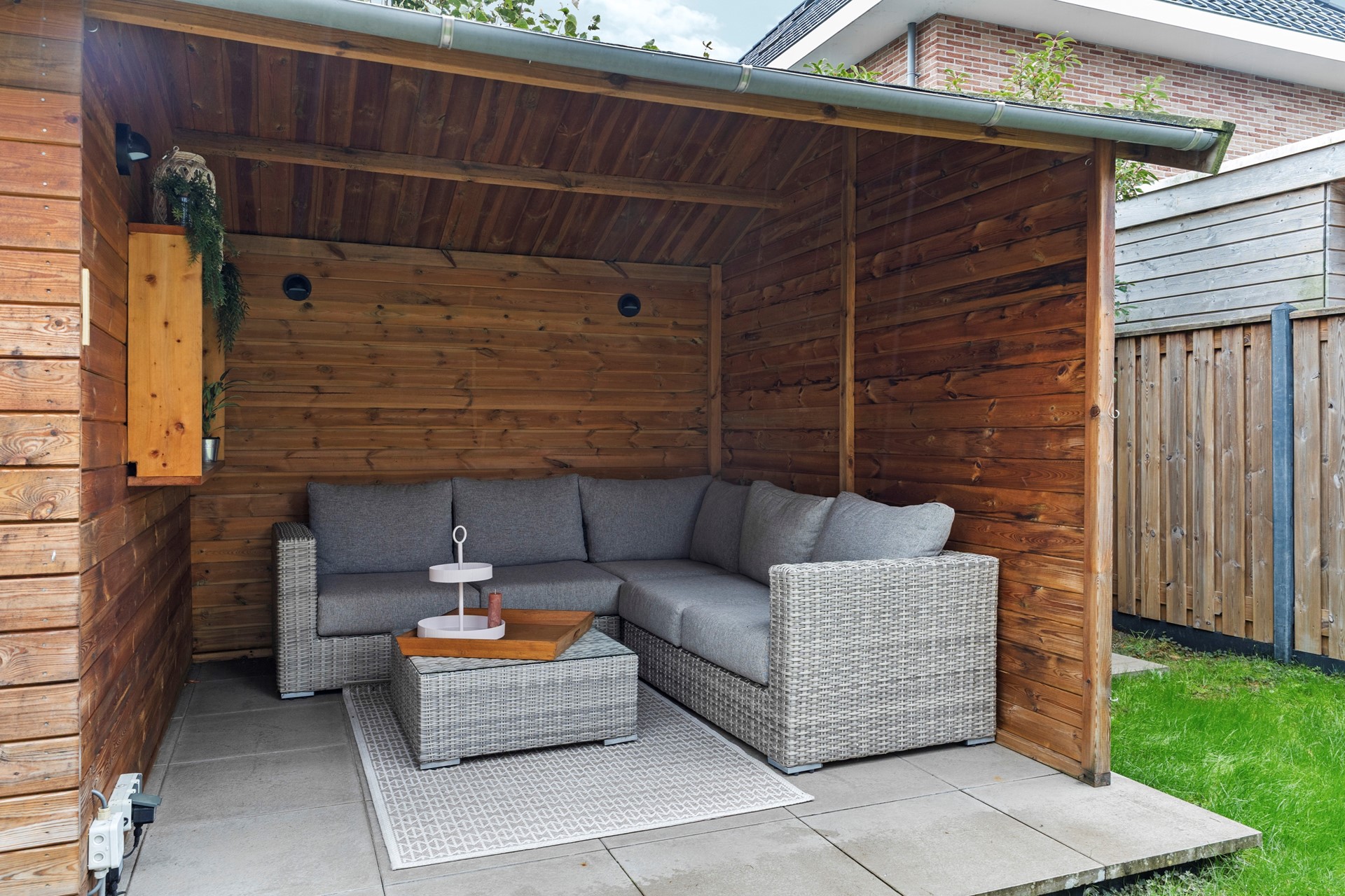De brede achtertuin op het noordoosten is een echte eyecatcher. Strak en onderhoudsvriendelijk aangelegd met sierbestrating, groenborders en een ruim tuinhuis dat is omgetoverd tot sfeervolle lounge met jacuzzi – de ideale plek om heerlijk te ontspannen na een lange dag. Bovendien is de tuin voorzien van een elektrisch zonnescherm en is er directe toegang tot de garage.