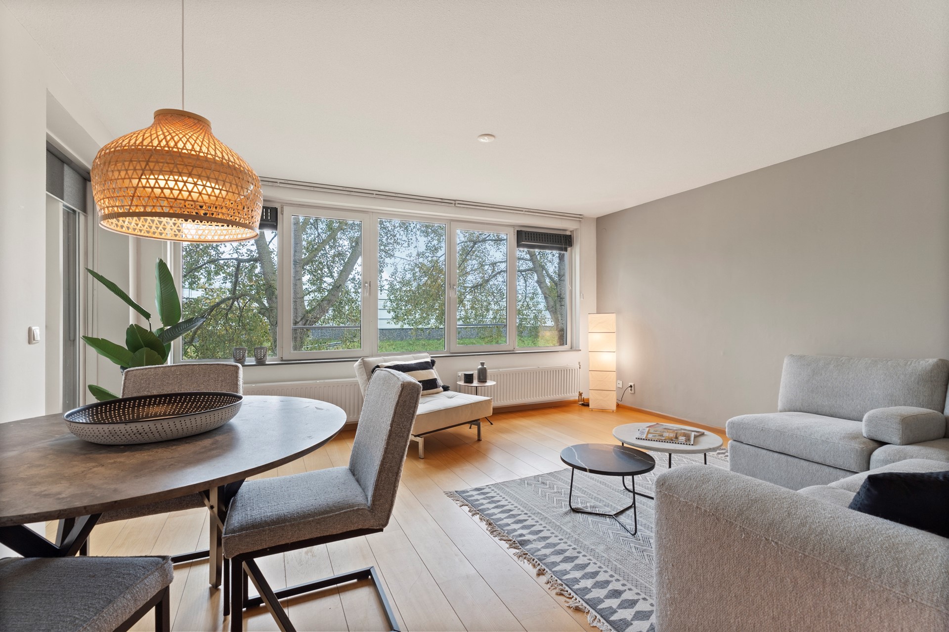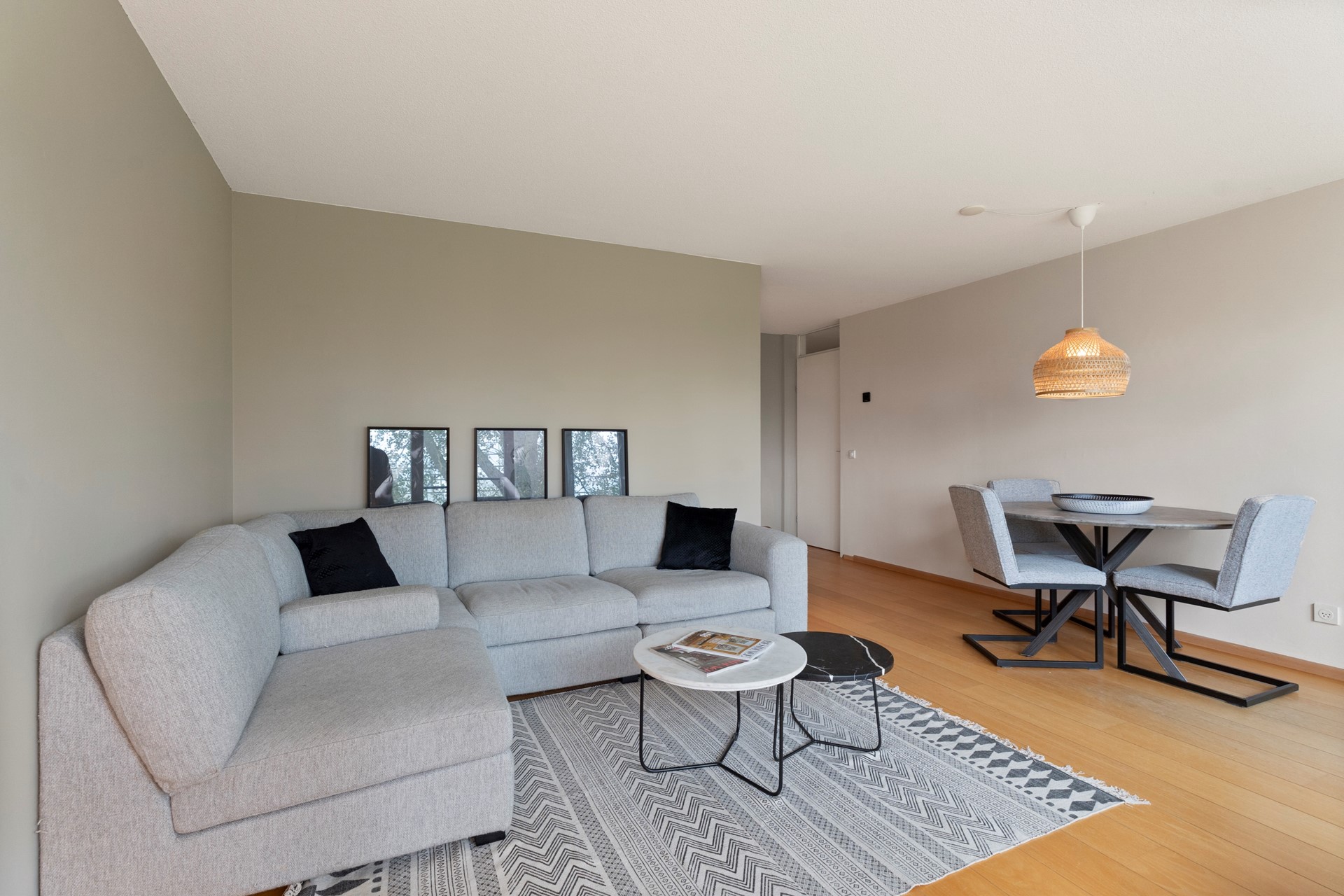 Lichte en verzorgde woonkamer met houten vloer en raampartijen, die voor veel daglicht zorgen. Het balkon is bereikbaar vanuit de woonkamer en de slaapkamer en is gelegen op het zuidoosten met uitzicht op brede groenstrook.