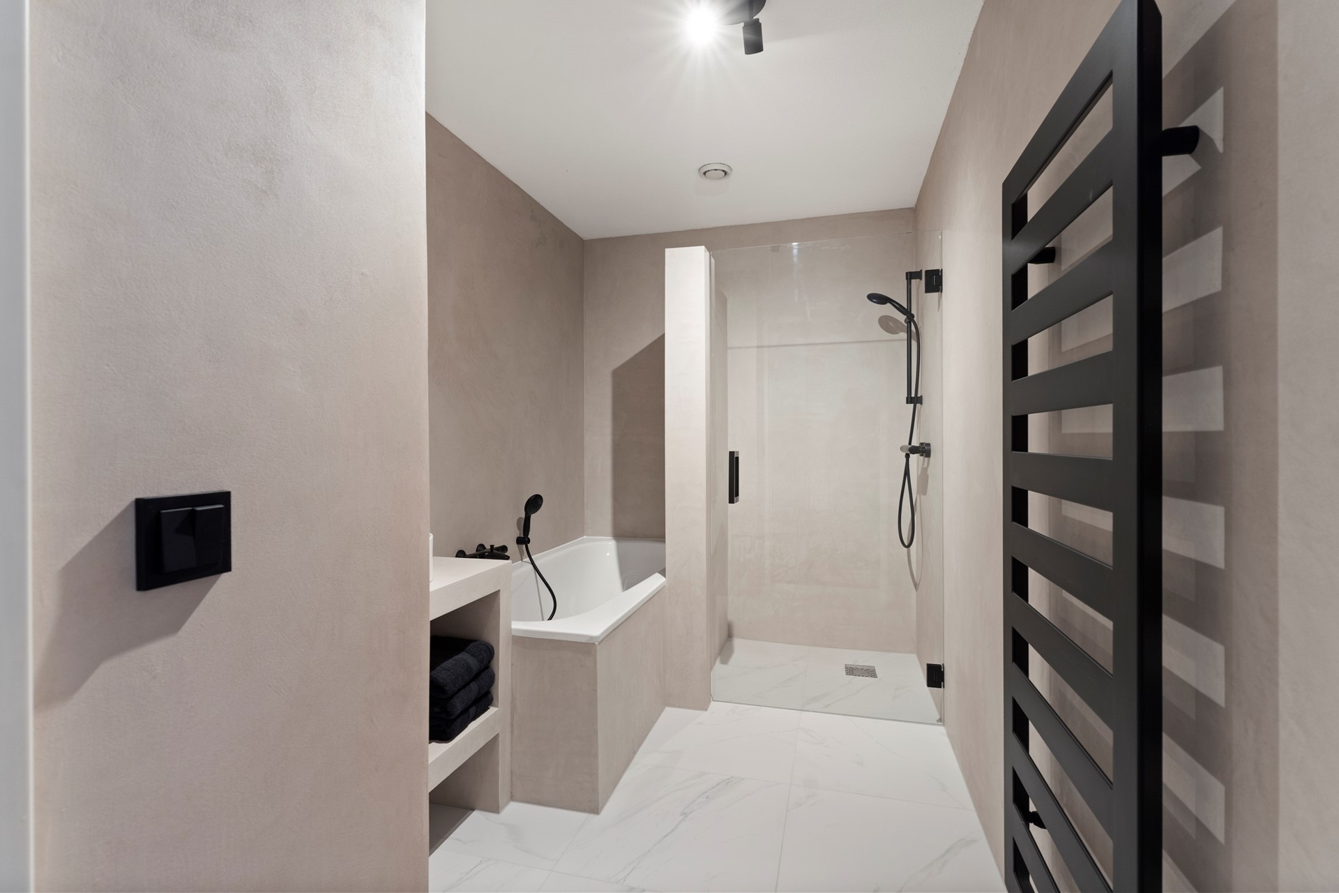 Recent gerenoveerde toiletruimte en separate badkamer, afgewerkt met Italiaans stucwerk, vloertegels; toilet ingedeeld met vrijhangend closet en fonteintje, badkamer met ligbad, douchecabine en wastafelmeubel.