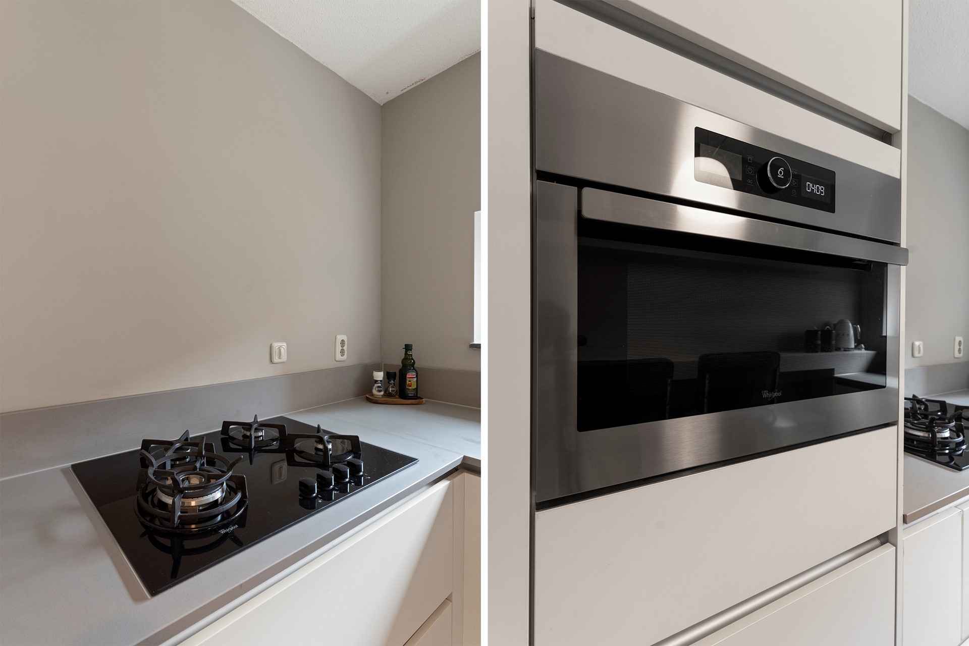 Inbouwkeuken met moderne apparatuur (2022), zoals kookplaat, afzuigkap, combi-magnetron, vaatwasser en koelkast.