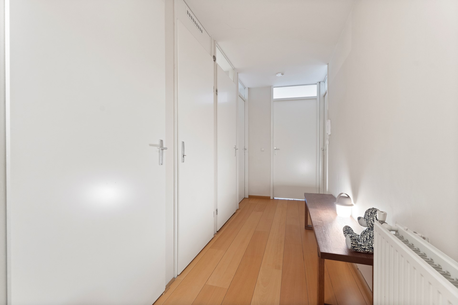 Ruime hal met houten vloer; meterkast en toegang tot alle vertrekken.