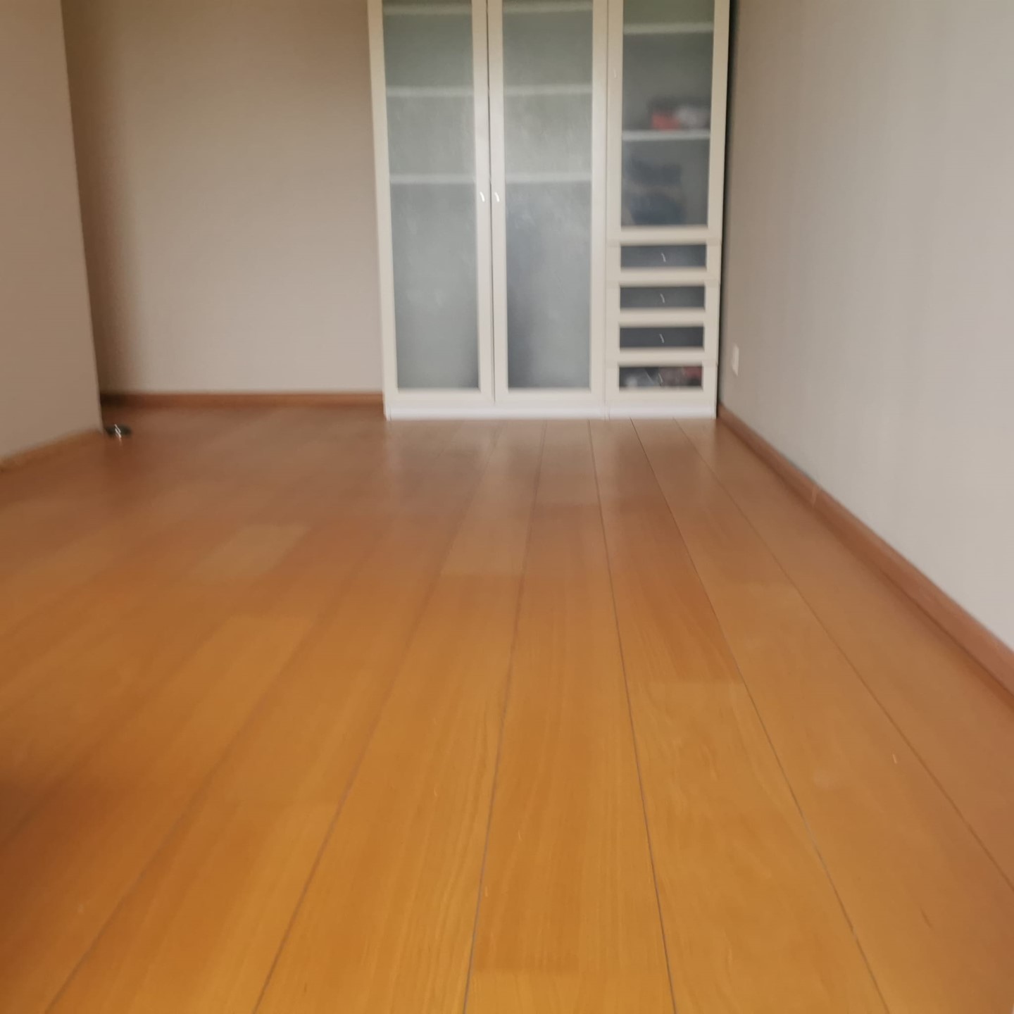Bright and well-maintained living room with wooden flooring and windows, providing plenty of natural light. The southeast-facing balcony is accessible from both the living room and the bedroom, overlooking a wide green area.