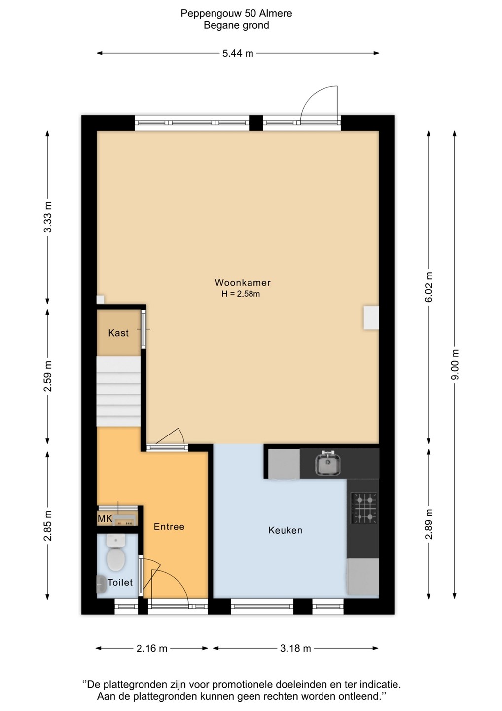 Entree met hal, toilet, trapopgang en toegang tot de woonkamer. De tuingerichte woonkamer is ruim en beschikt over een praktische trapkast. De open keuken bevindt zich aan de voorzijde van de woning en is voorzien van een 4-pits gasfornuis en losse apparatuur, waaronder een vaatwasser en koel-vriescombinatie. De achtertuin is bereikbaar via de woonkamer en ligt op het zuidoosten.