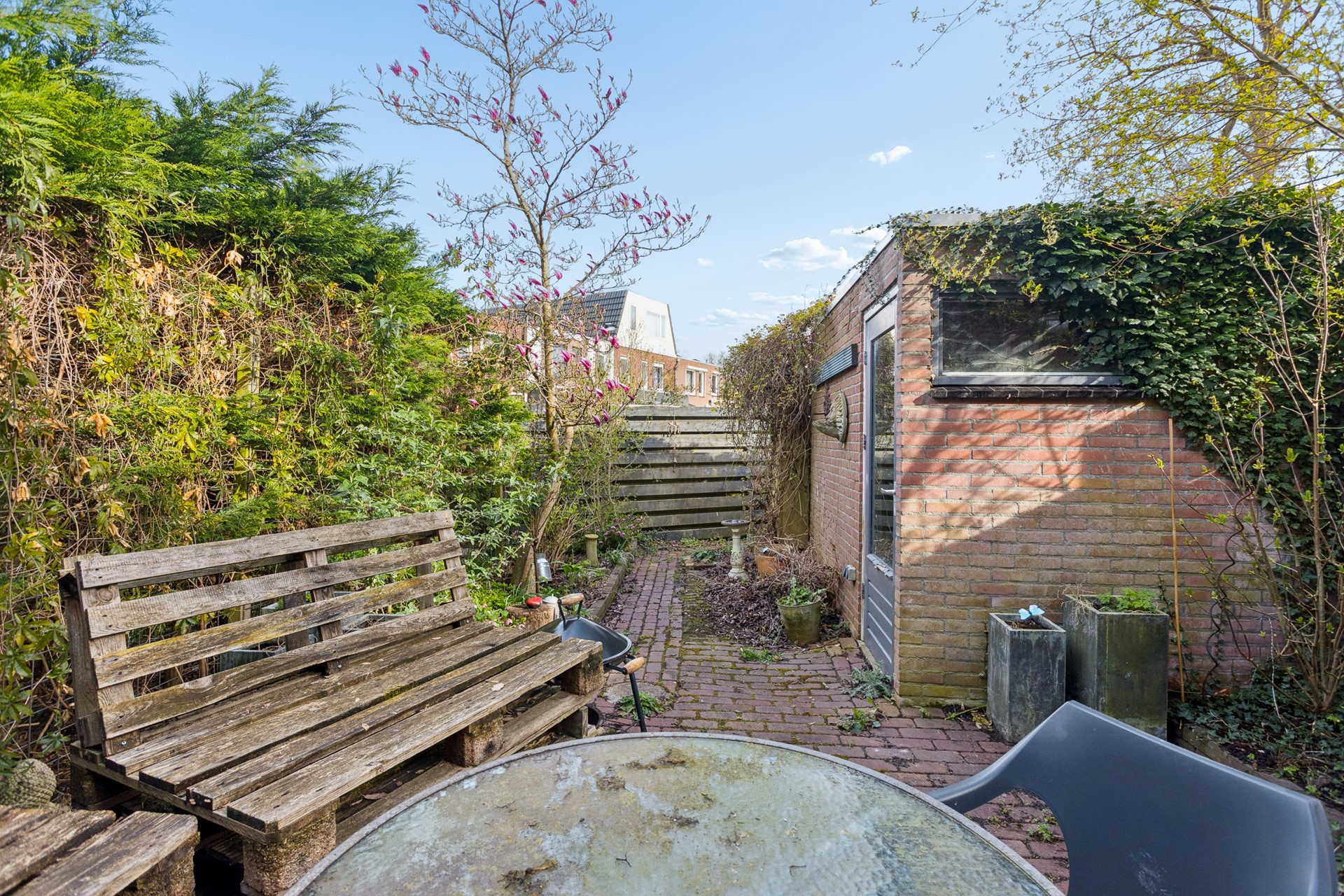 ● Achtertuin op het zuidoosten, stenen berging en achterom