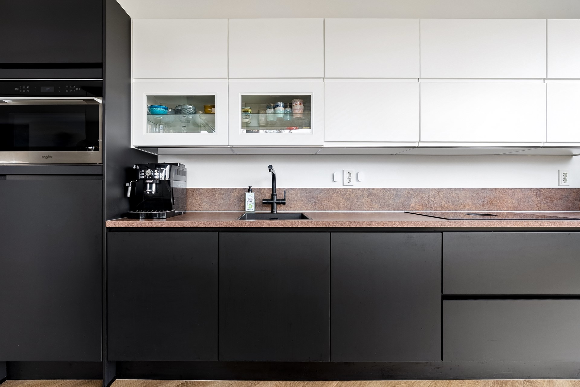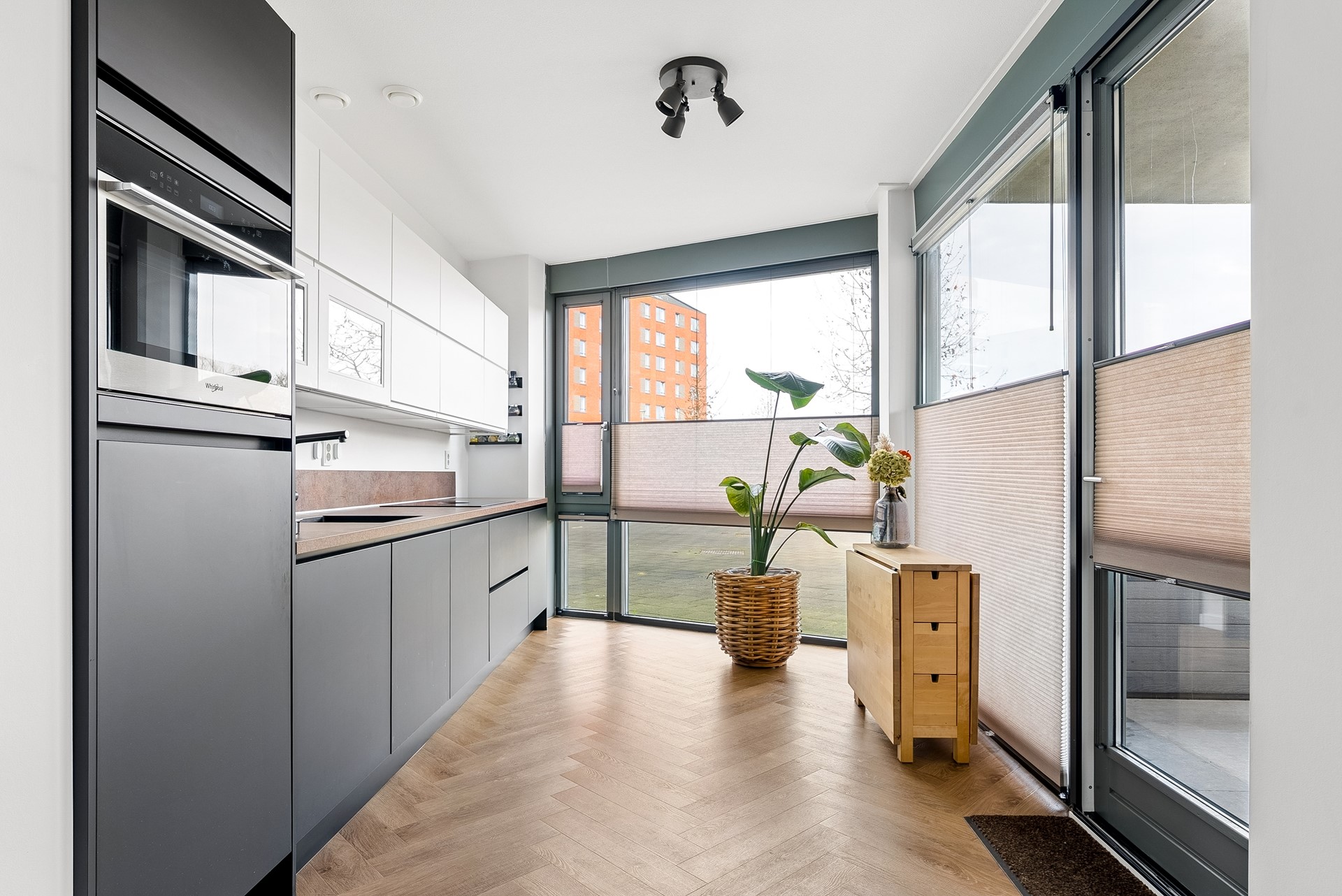 De strakke keuken is van alle moderne gemakken voorzien. In de keuken is de volgende inbouwapparatuur inbegrepen: koelkast met vriesvak, vaatwasser, combimagnetron, kokend waterkraan en inductiekookplaat met ingebouwde afzuigkap.