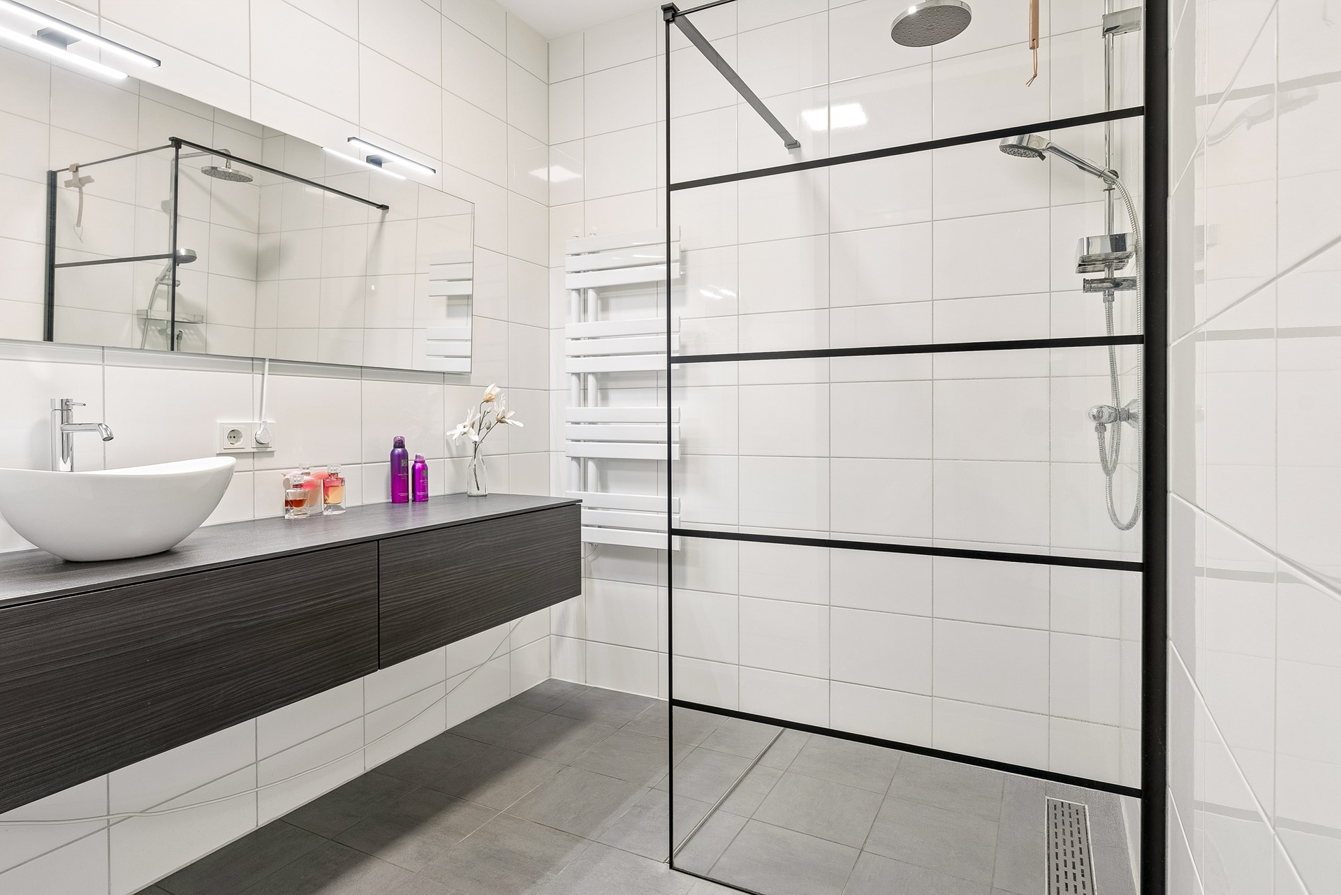 De badkamer is voorzien van een inloopdouche, wastafel met groot wastafelmeubel en een designradiator. Er is gekozen voor een prachtig stoer maar neutrale afwerking. De badkamer is voorzien van vloerverwarming. Het toilet is separaat gelegen en bereikbaar vanuit de hal. Ideaal, dan hoeft bezoek niet door de badkamer. Vanuit de hal is ook een fijne bergkast bereikbaar, hier zijn tevens de wasmachine-/drogeraansluitingen gesitueerd.