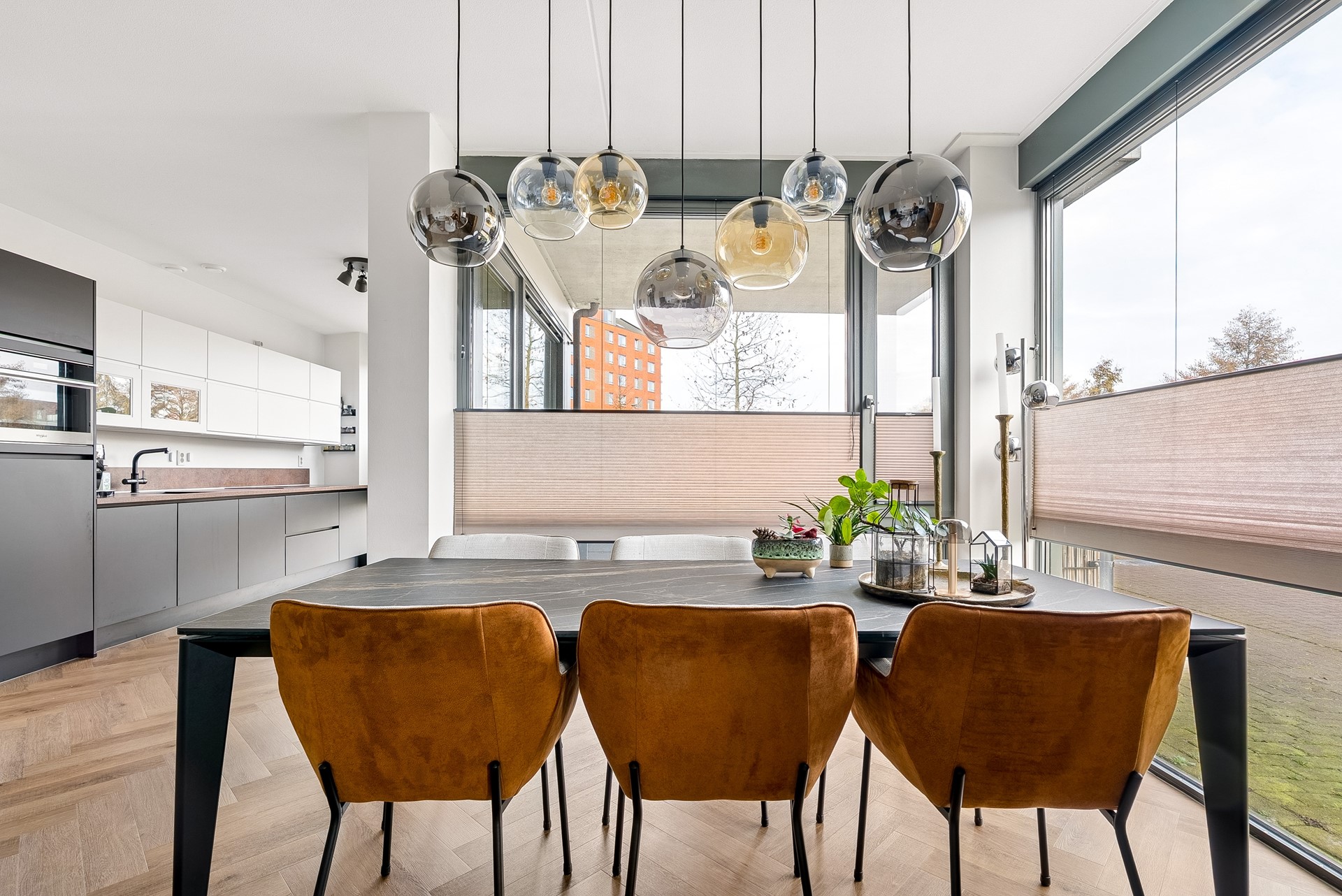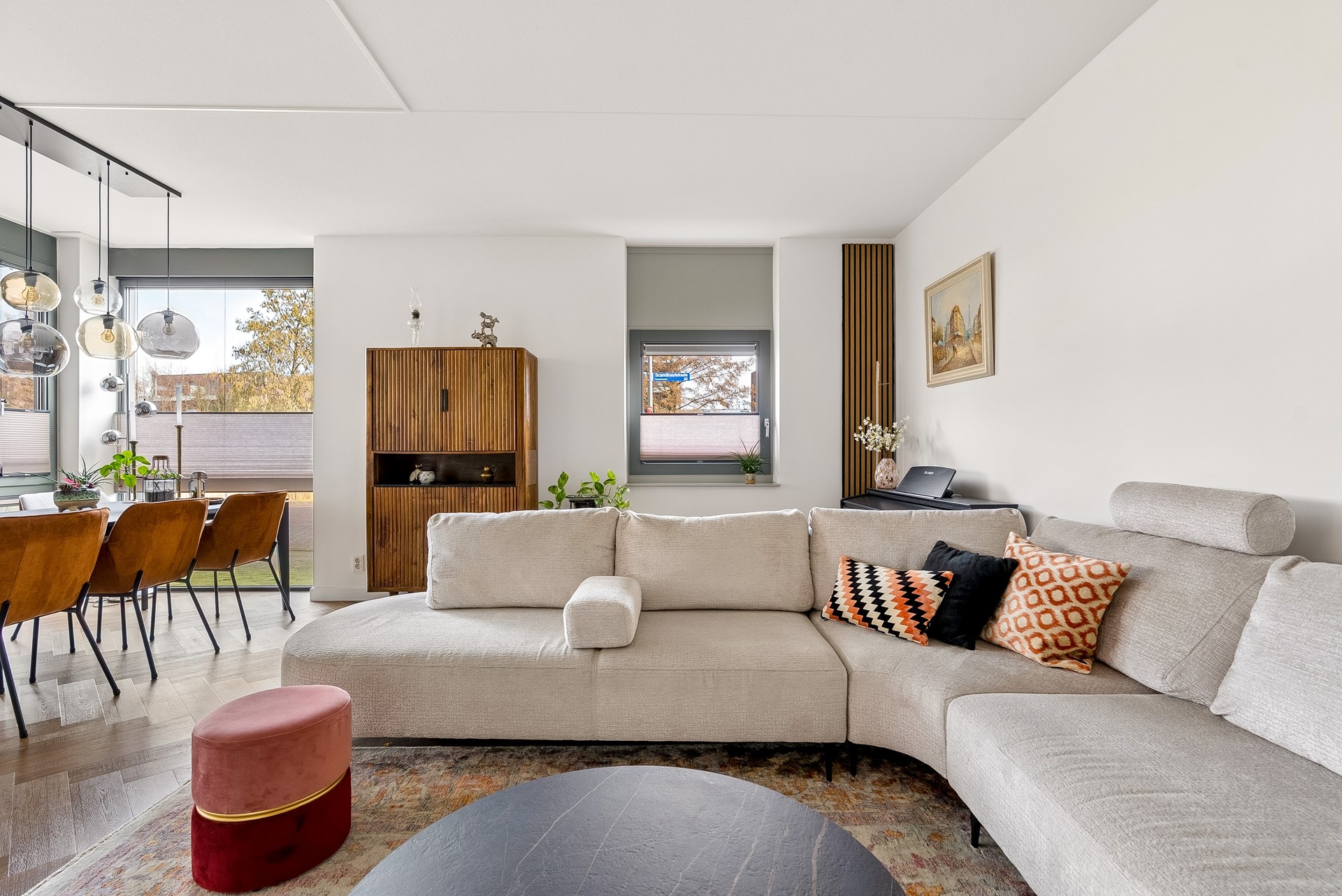 De woonkamer biedt voldoende ruimte voor een gezellige zithoek en een eettafel, perfect voor sociaal samenzijn met vrienden en familie. De vele grote raampartijen zorgen dat er veel licht de woning kan binnentreden en dat je een leuk uitzicht hebt naar buiten.
