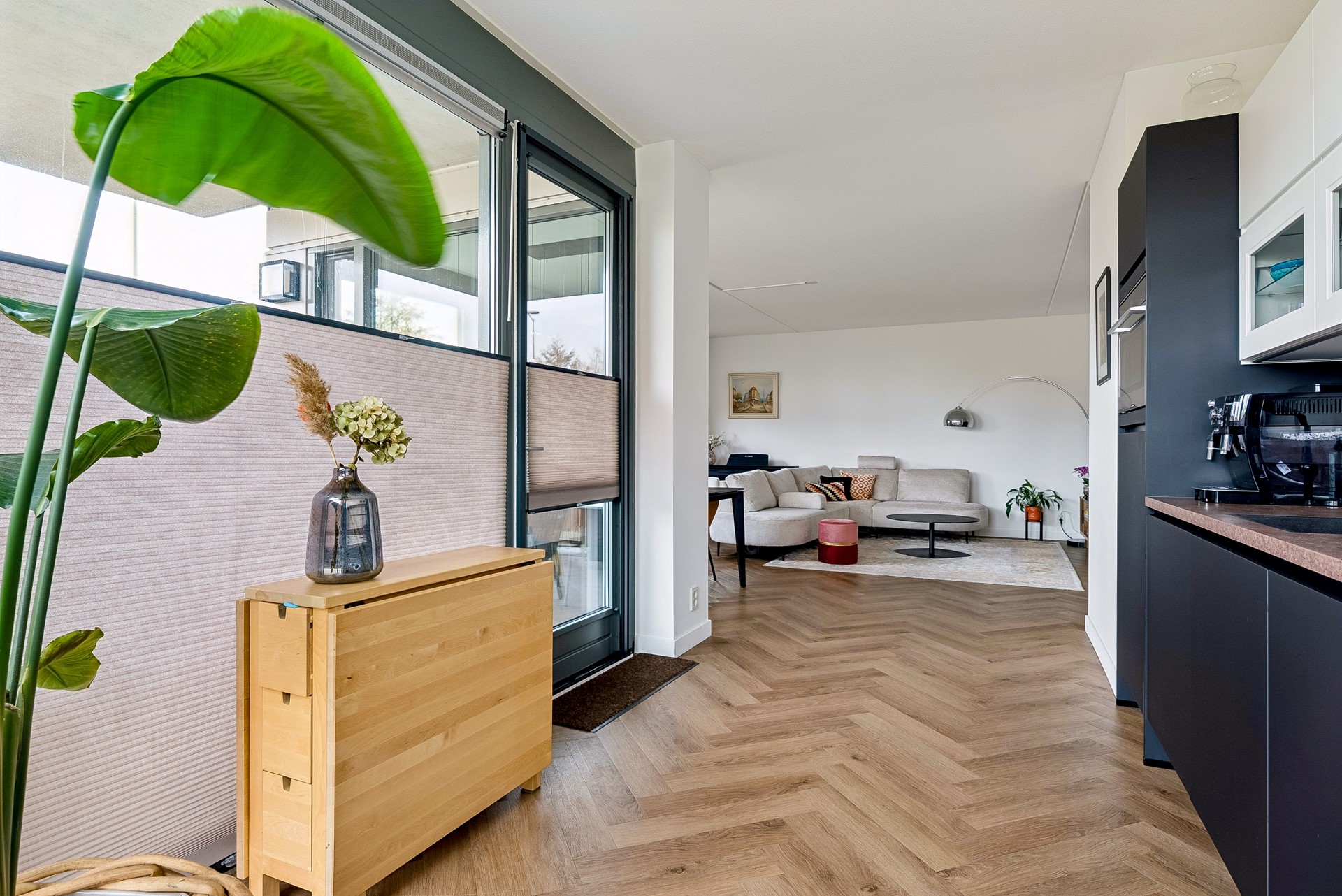 Het appartement is tevens gelegen op de begane grond. Het appartement beschikt over een speelse en unieke indeling, met een lichte woonkamer die zorgt voor een sfeervolle ambiance. Het gehele appartement is voorzien van een keurige visgraat PVC vloer met vloerverwarming en een strakke wandafwerking.