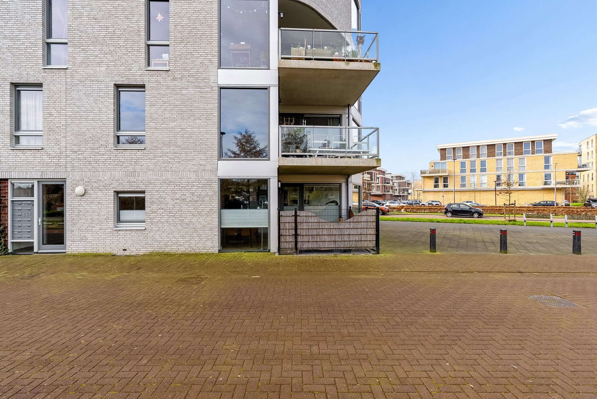 Op de begane grond bevindt zich de hoofdentree met brievenbussen en bellentableau (met camera). De hoofdentree geeft toegang tot de lift en de trapopgang naar de diverse verdiepingen. Aan de achterkant kan je ook de centrale hal verlaten, hier bereik je de privé parkeerplaatsen behorend bij de appartementen en de bergingen. Dit terrein is volledig afgesloten met een roldeur, dit geeft een erg veilig gevoel.
