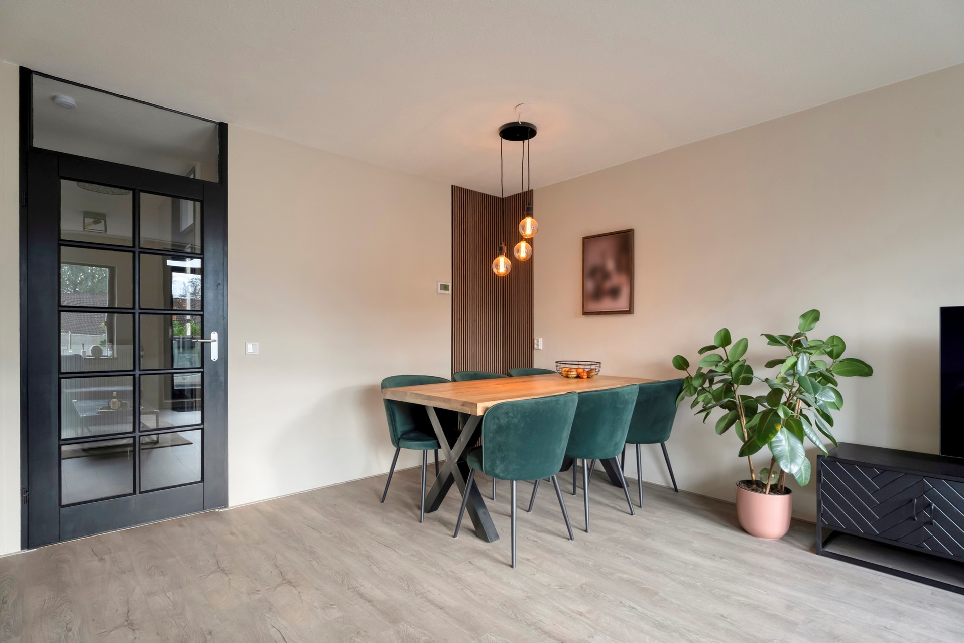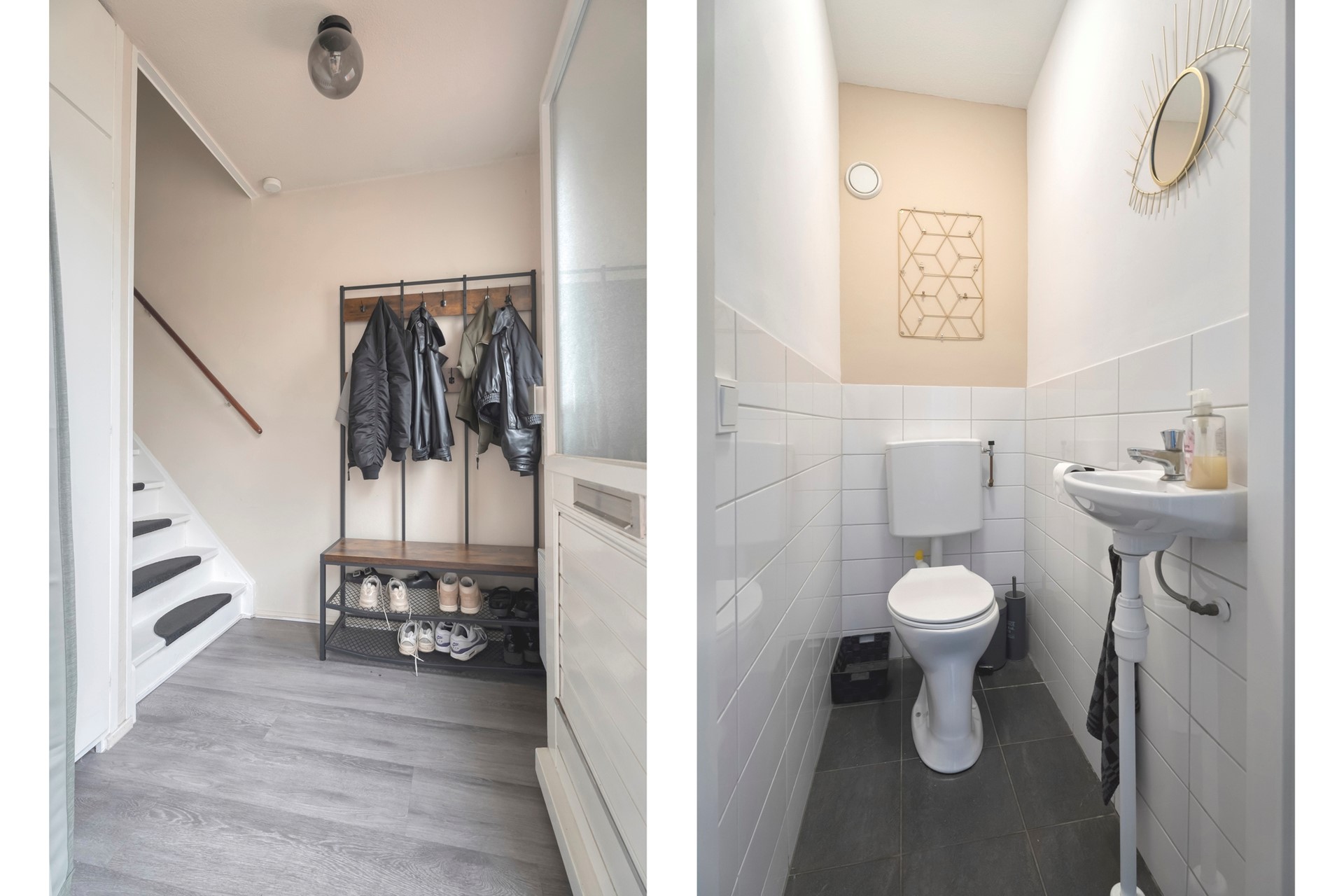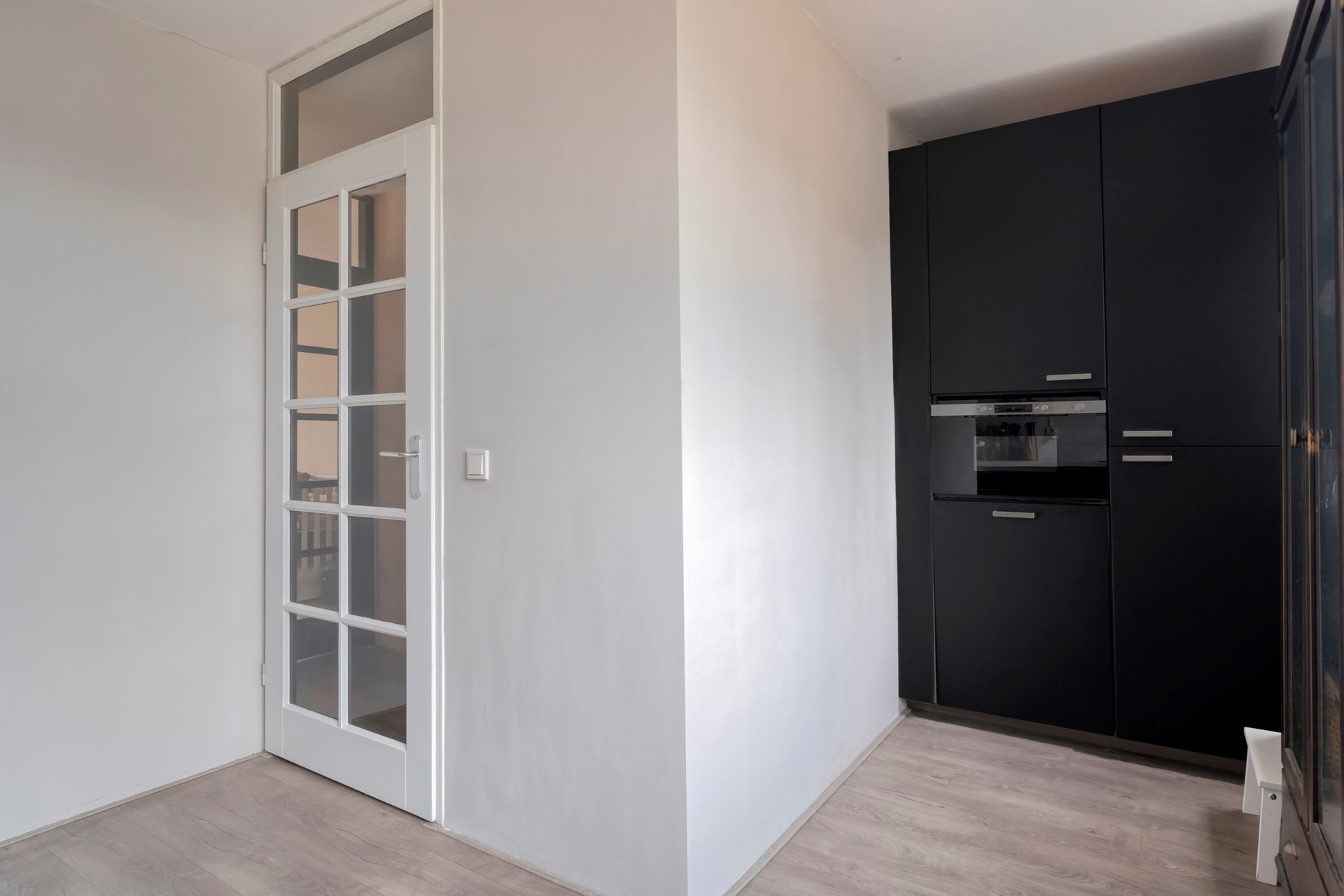 Vanaf de trapopgang kom je uit op een centrale overloop, die toegang biedt tot de keuken, het toilet en de woonkamer. De overloop voelt licht en open door de directe verbinding met de woonruimte.