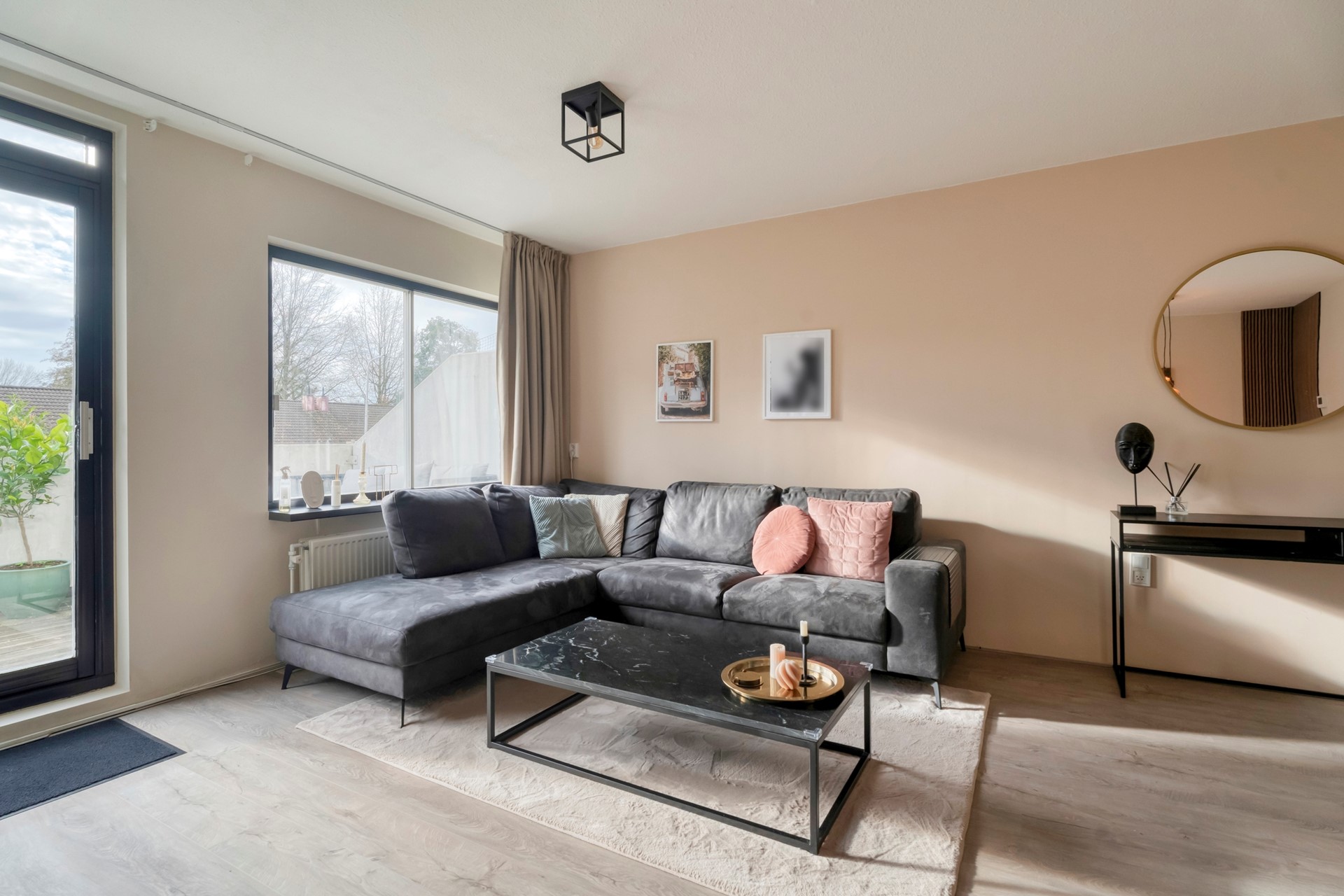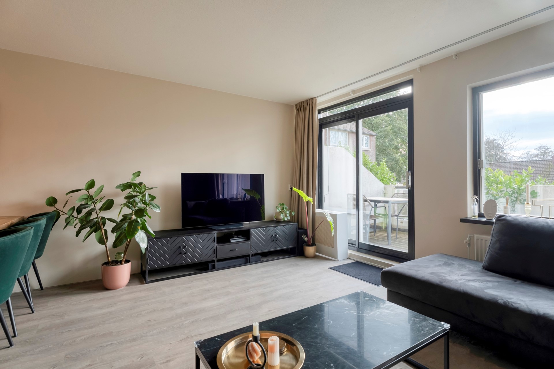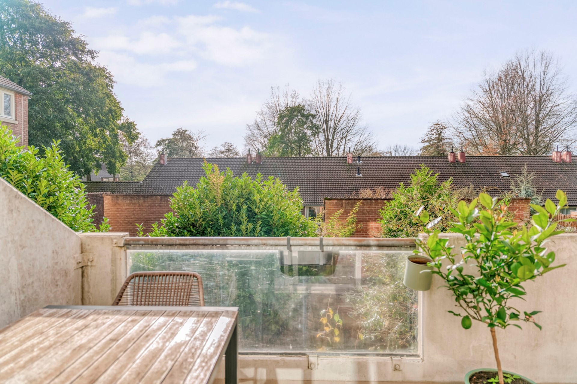 Met uitzicht op de groene omgeving vormt dit balkon een verlengstuk van de woonkamer en een waardevolle toevoeging aan de leefruimte.
