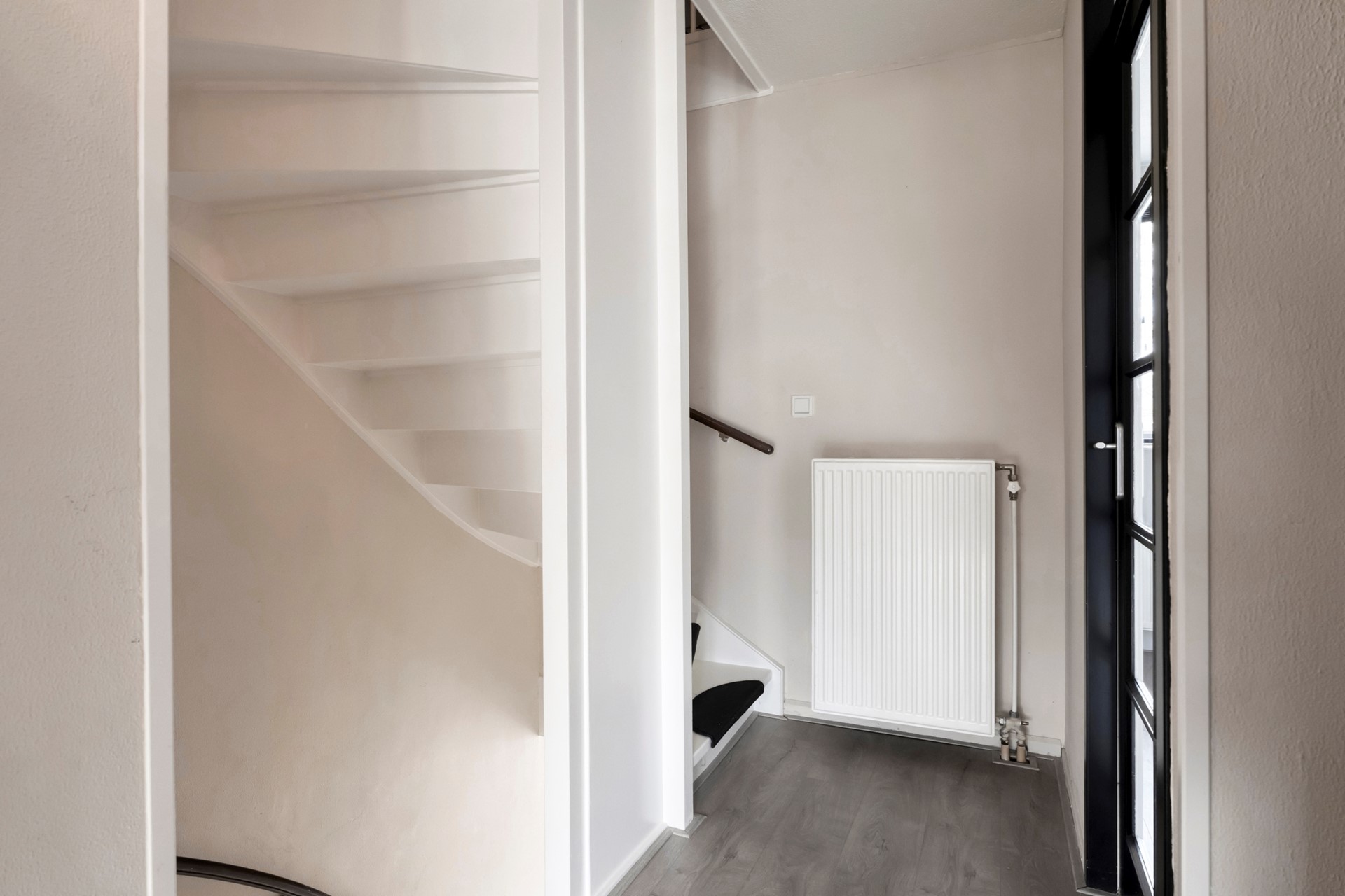 De hal biedt voldoende ruimte om jassen en schoenen op te bergen en heeft dankzij de raampartijen een prettige lichtinval. Vanuit de hal leidt een vaste trap je direct naar de bovenliggende woonverdieping, waar de belangrijkste leefruimtes zijn gesitueerd.