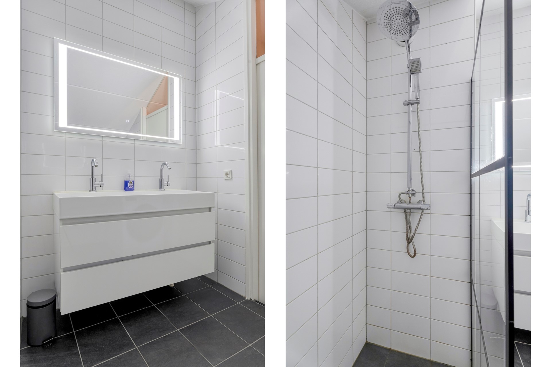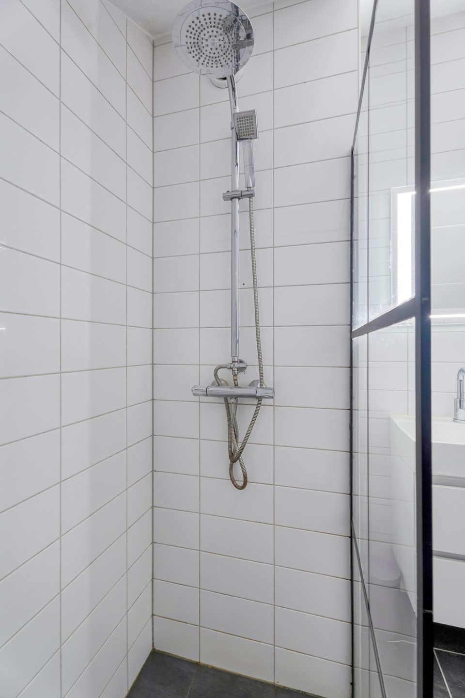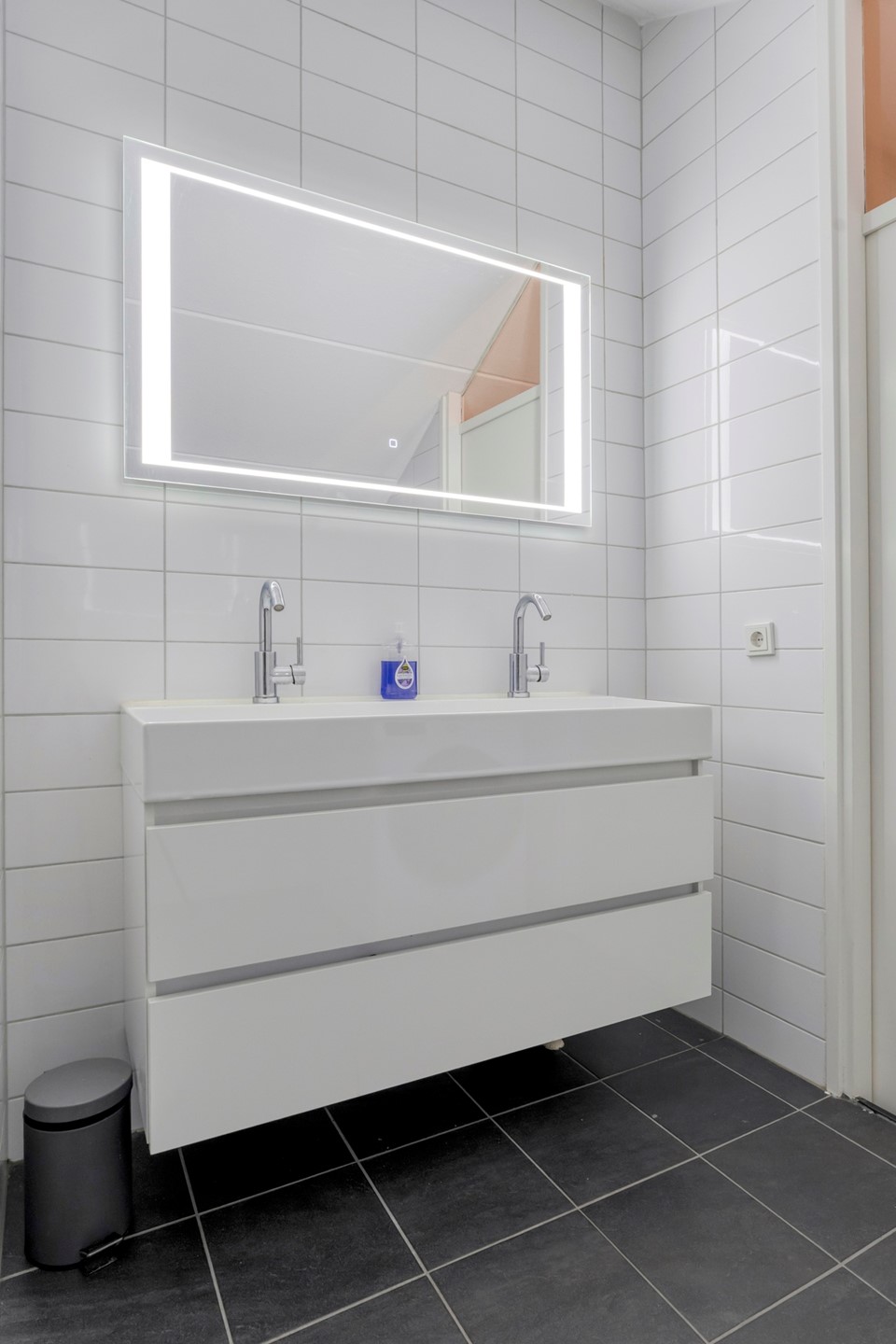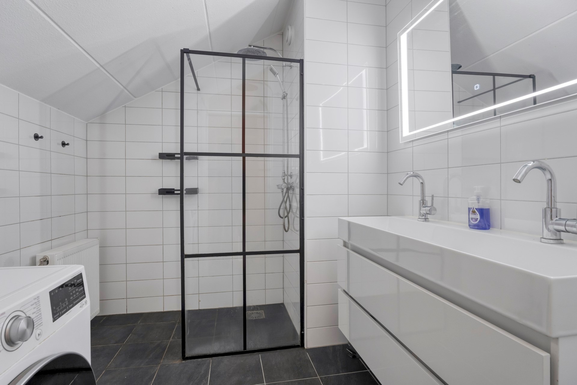 De badkamer ligt centraal op de verdieping en is ingericht met een wastafelmeubel, douche en wasmachineaansluiting.