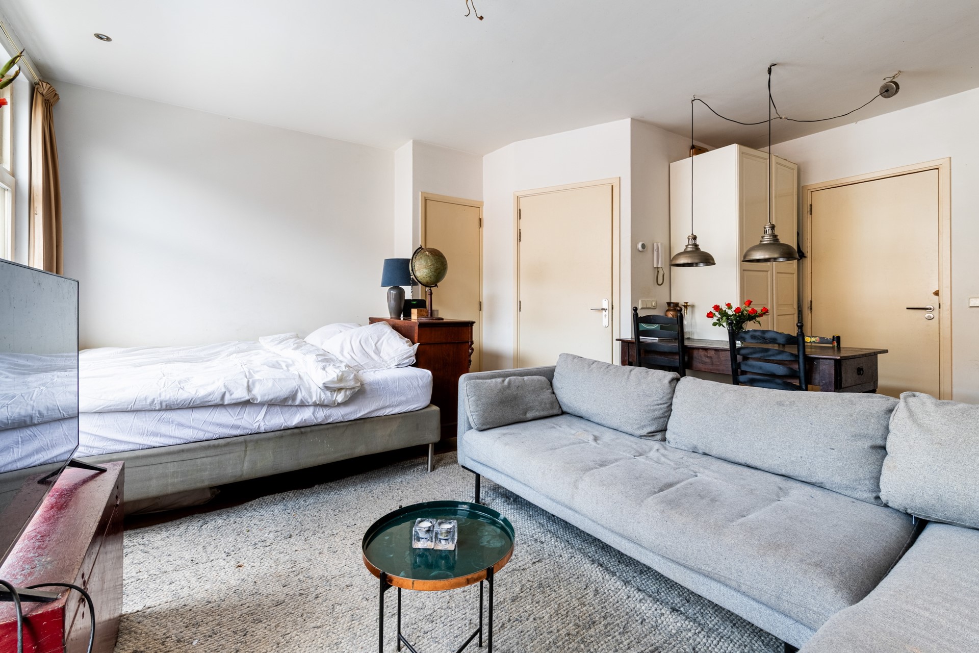 Upon entering, you step directly into the living/sleeping area, which is pleasantly bright thanks to the large windows. The studio is cleverly laid out, allowing for the creation of various living areas.