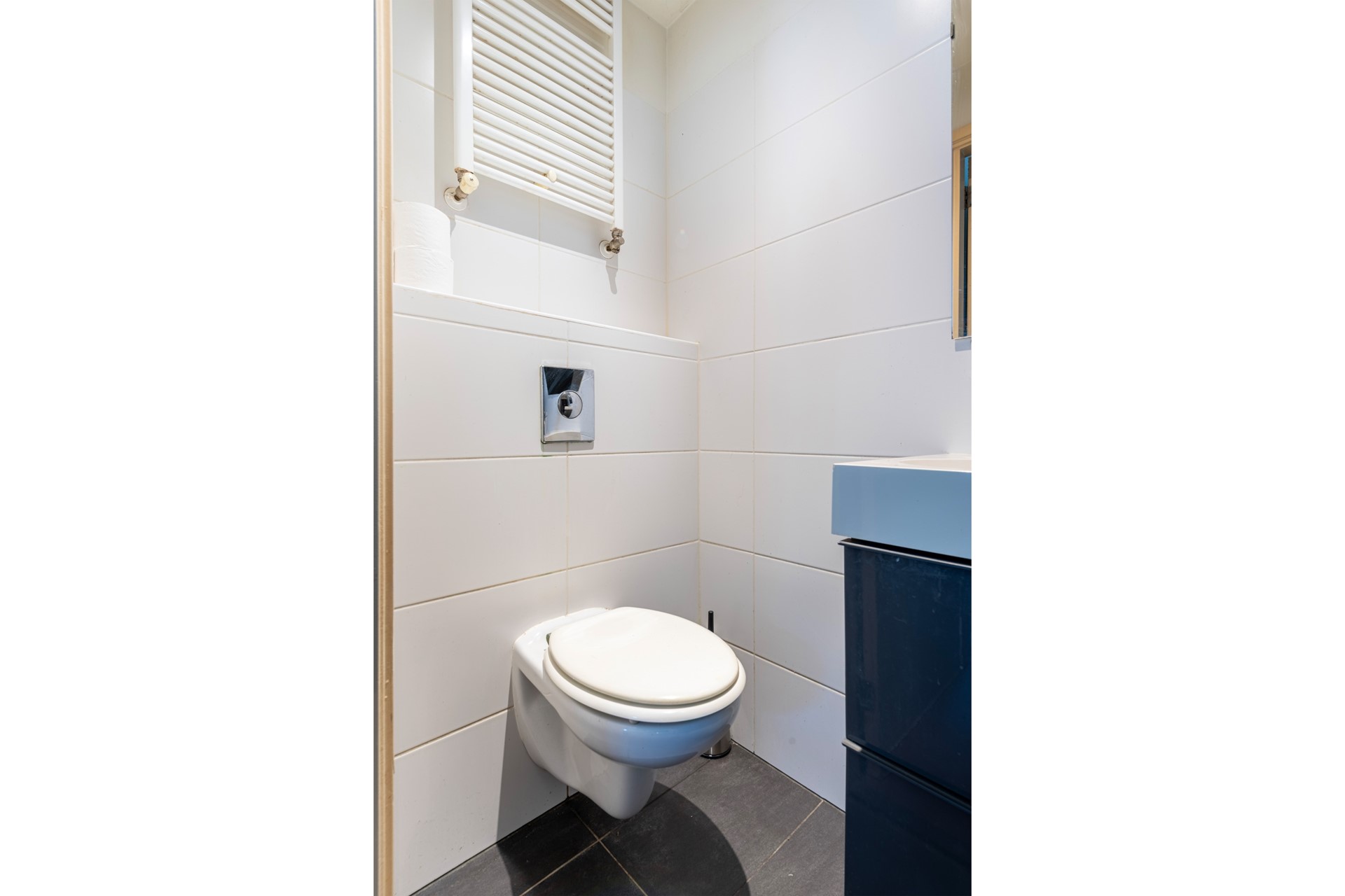 De badkamer is separaat en voorzien van een douche, wastafel en toilet.