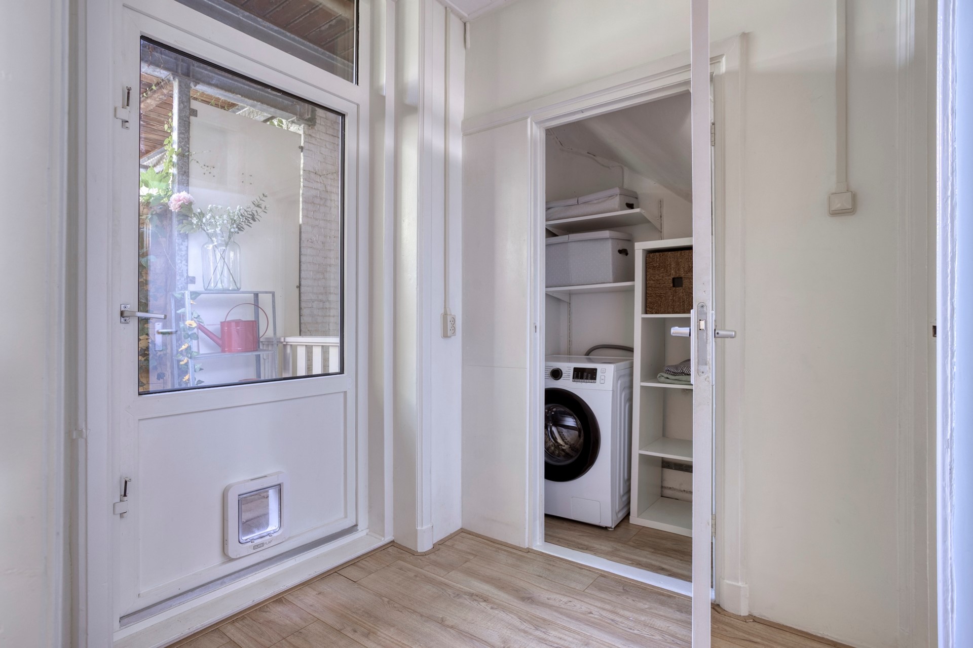 Geen wasmachine in de badkamer – wel zo fijn! In de hal bevindt zich een aparte ruimte met aansluitingen voor wasmachine en droger, én extra opbergruimte.