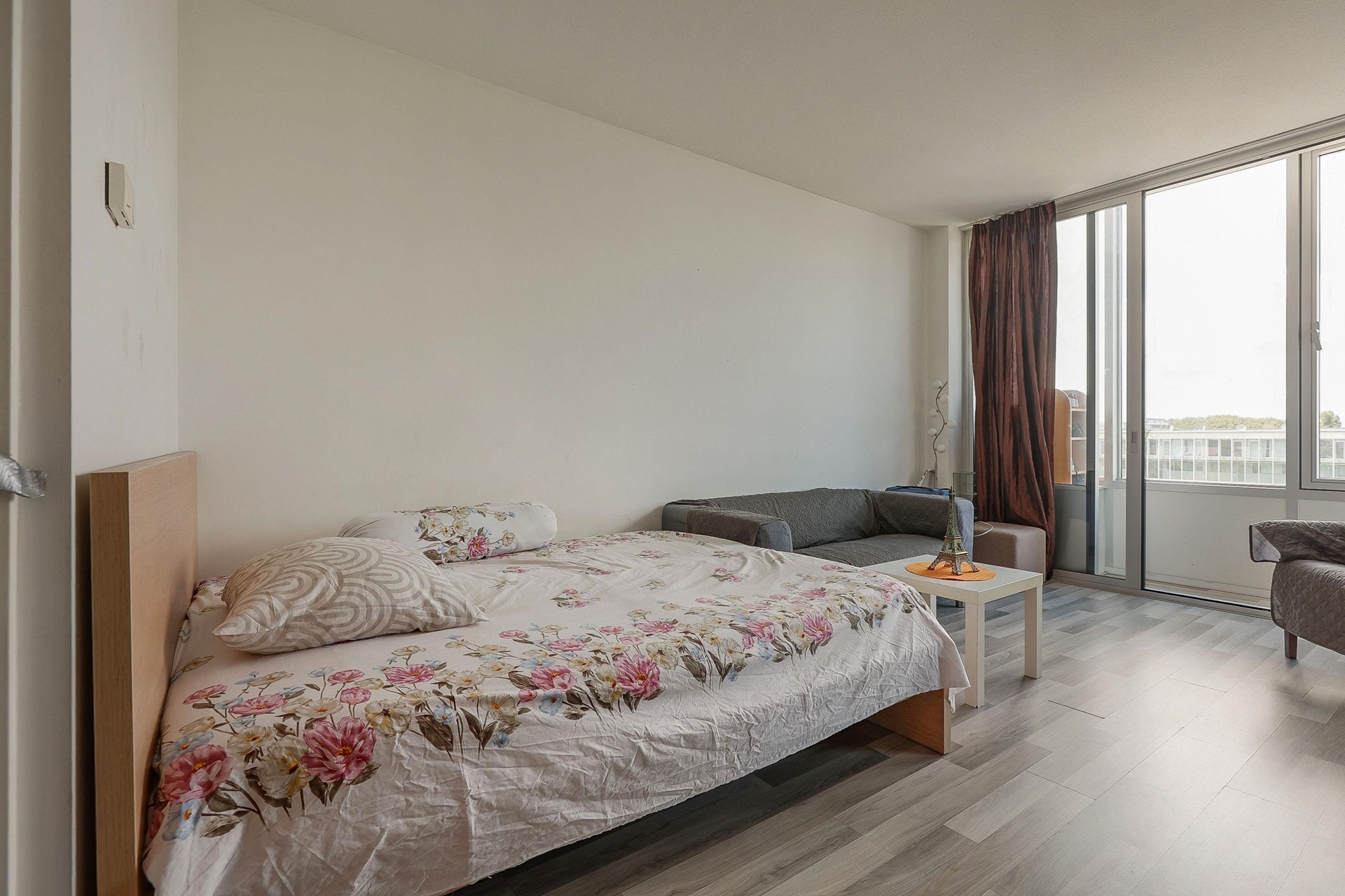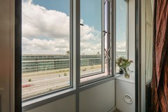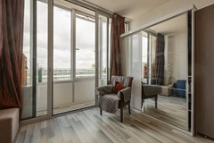 De woonkamer is licht en sfeervol, met een fraai uitzicht op het westen. De ruimte is afgewerkt met lichte wanden en een warme laminaatvloer, en biedt voldoende plek voor een comfortabele zithoek om te ontspannen na een lange dag.