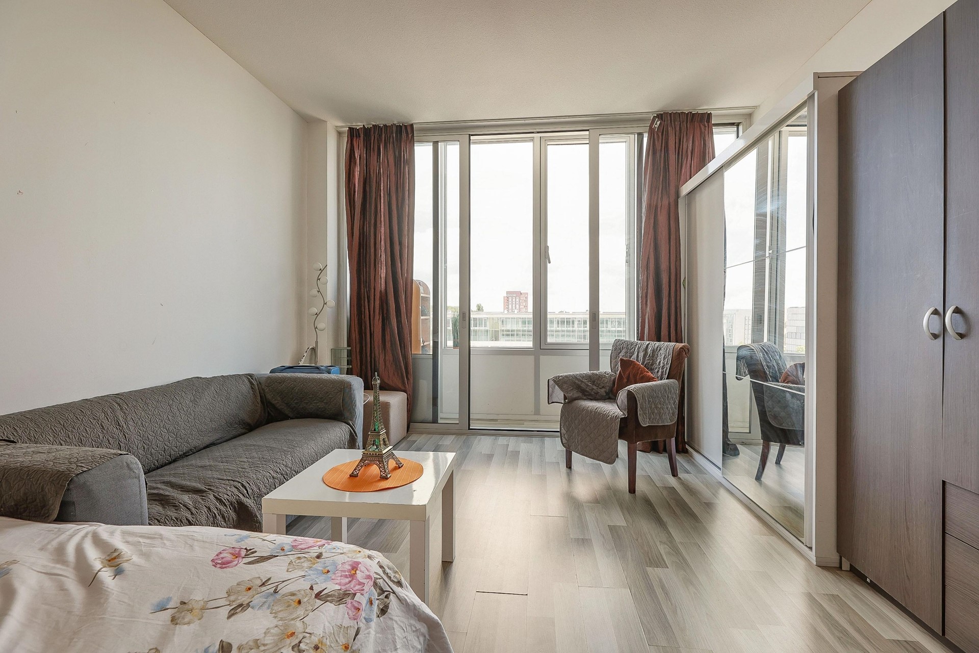 The living area is bright and inviting, with western-facing views. It features light-colored walls and warm laminate flooring, with enough space for a comfortable seating area to relax after a busy day.