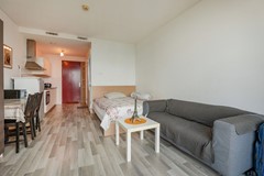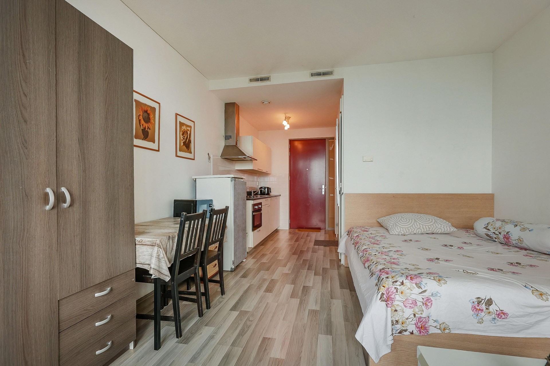 At the entrance, you'll walk directly into the kitchen, designed in a straight-line layout with ample cabinet space. It includes a combi-oven, 4-burner ceramic hob, and extraction hood. There is also space for a small dining table — perfect for enjoying meals with friends.