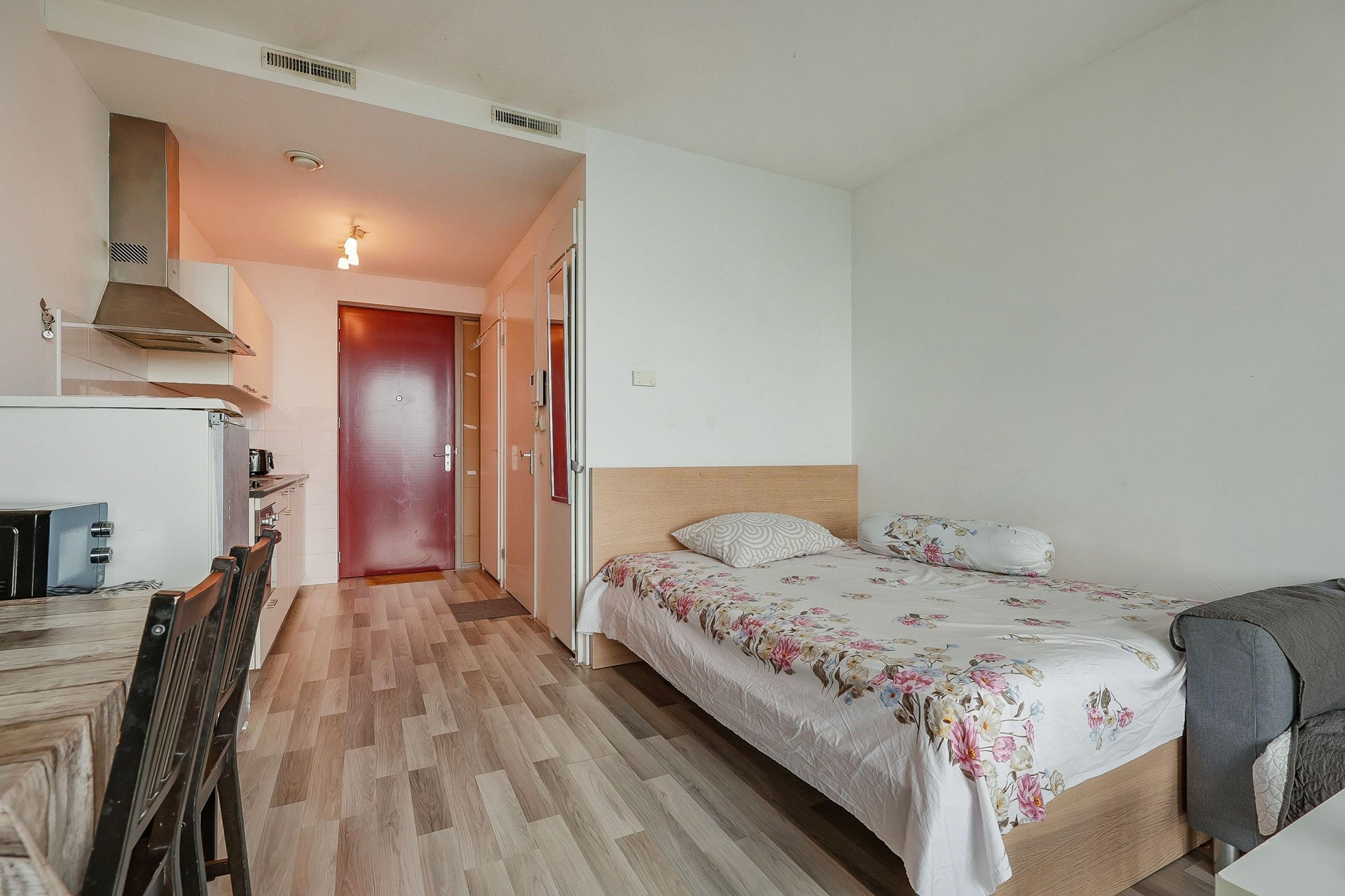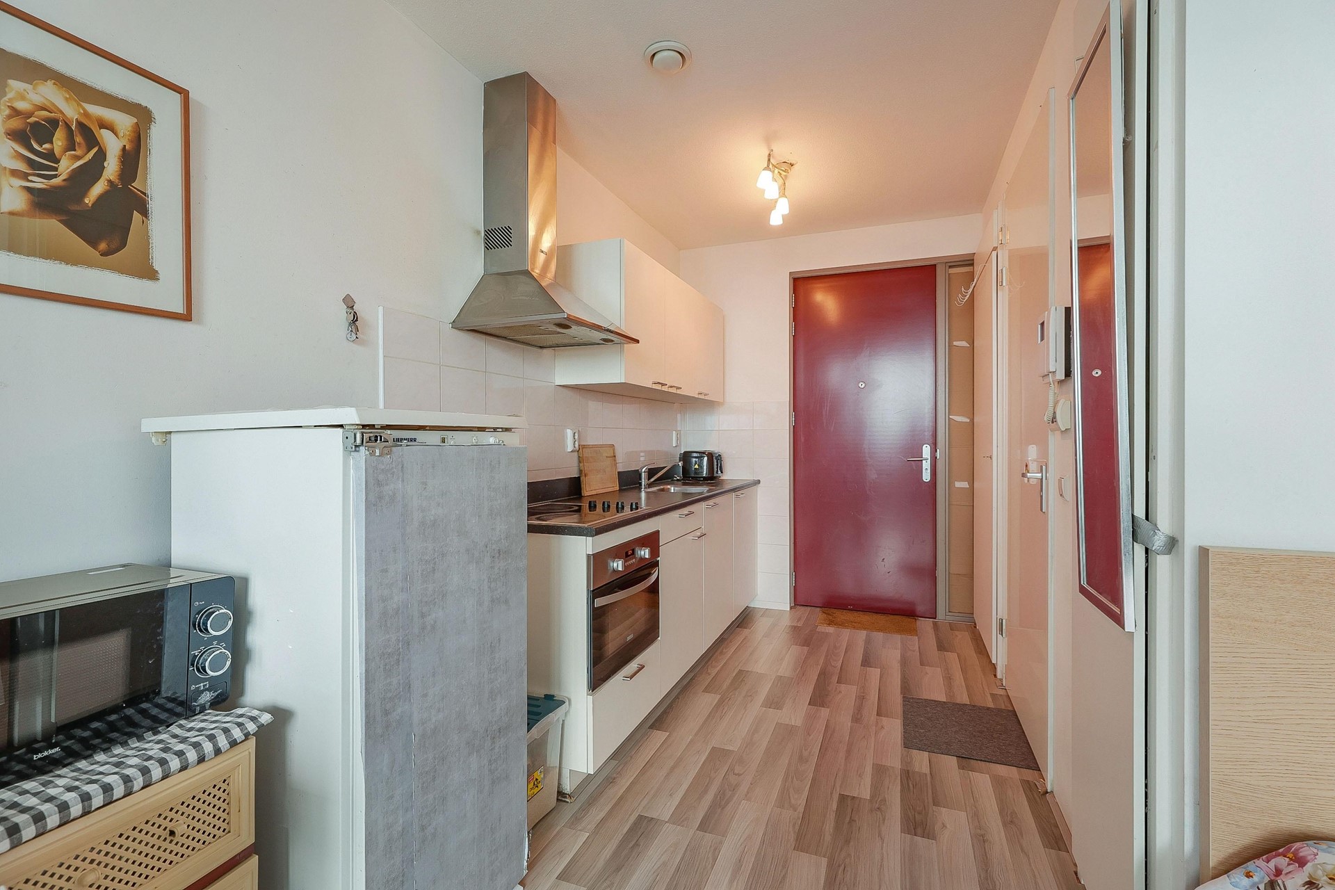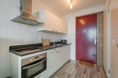Bij binnenkomst loop je direct de functionele keuken binnen, geplaatst in een rechte opstelling en voorzien van voldoende kastruimte. De keuken beschikt over een combi-oven, 4-pits keramische kookplaat en afzuigkap. Daarnaast is er ruimte voor een kleine eettafel — perfect om te dineren met vrienden.