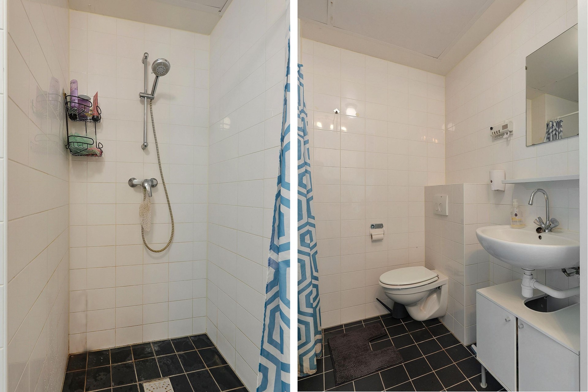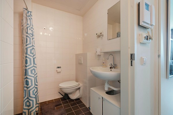 Via de keuken bereik je de badkamer, die volledig is betegeld in een lichte kleurstelling en een verzorgde indruk maakt. De ruimte is praktisch ingedeeld met een inloopdouche, wastafel en toilet.