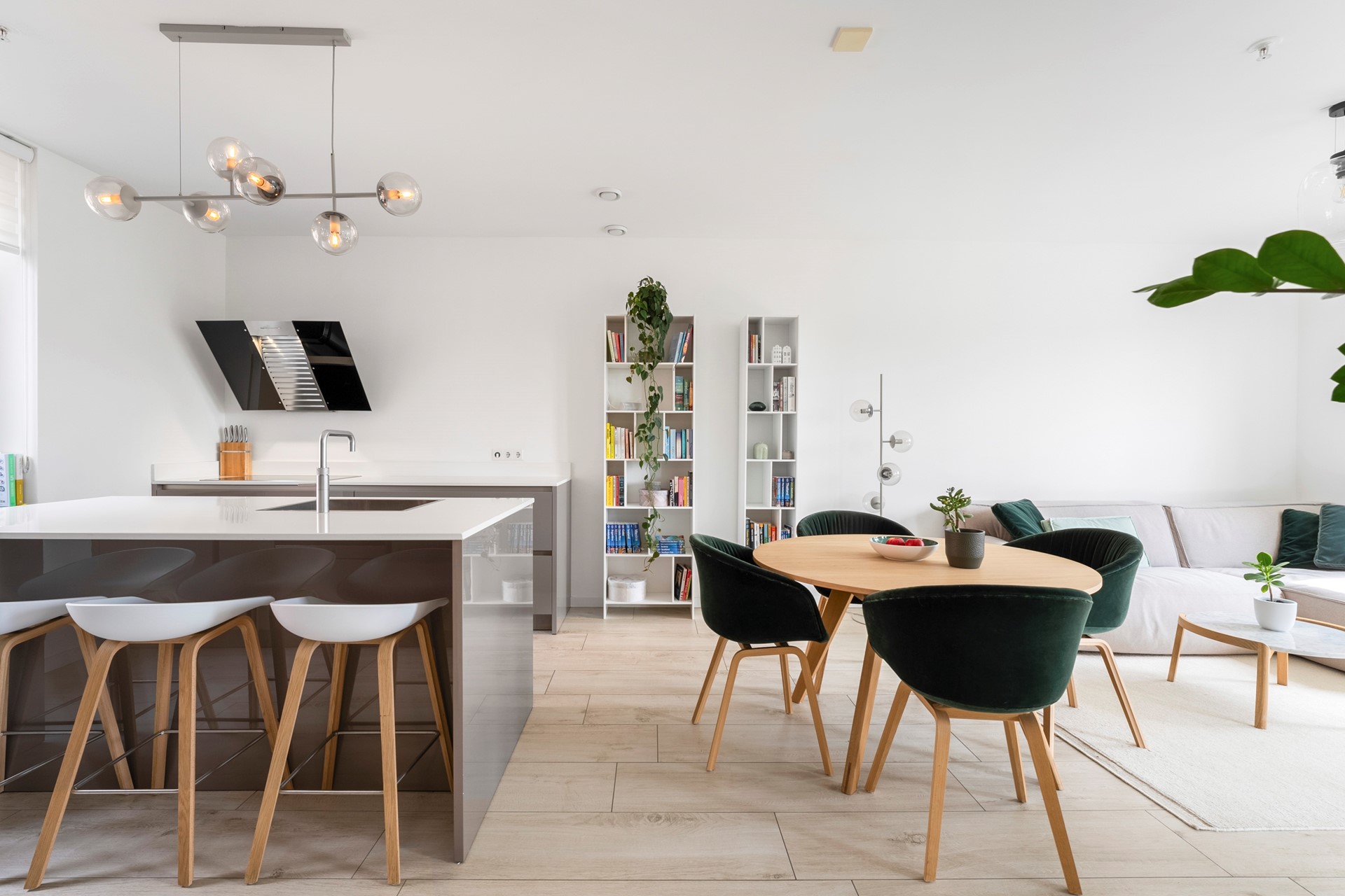 Vanuit de entree bereik je de lichte en ruime woonkamer met open keuken. Dankzij de ligging op het zuiden en de grote ramen geniet je hier de hele dag van zon en een schitterend uitzicht. De moderne keuken is van alle gemakken voorzien en vormt het hart van de woning – ideaal om gasten te ontvangen of uitgebreid te koken.