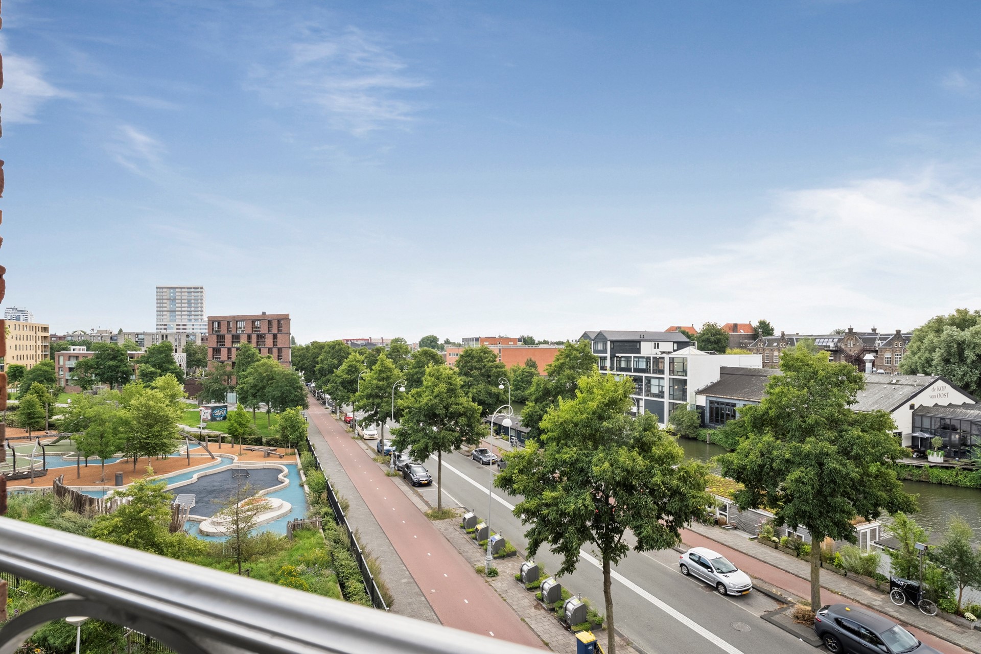 Vanuit de woonkamer stap je het balkon op, waar je een prachtig panorama hebt over het water, de Gooyer molen en de levendige omgeving van de Brouwerij ’t IJ.