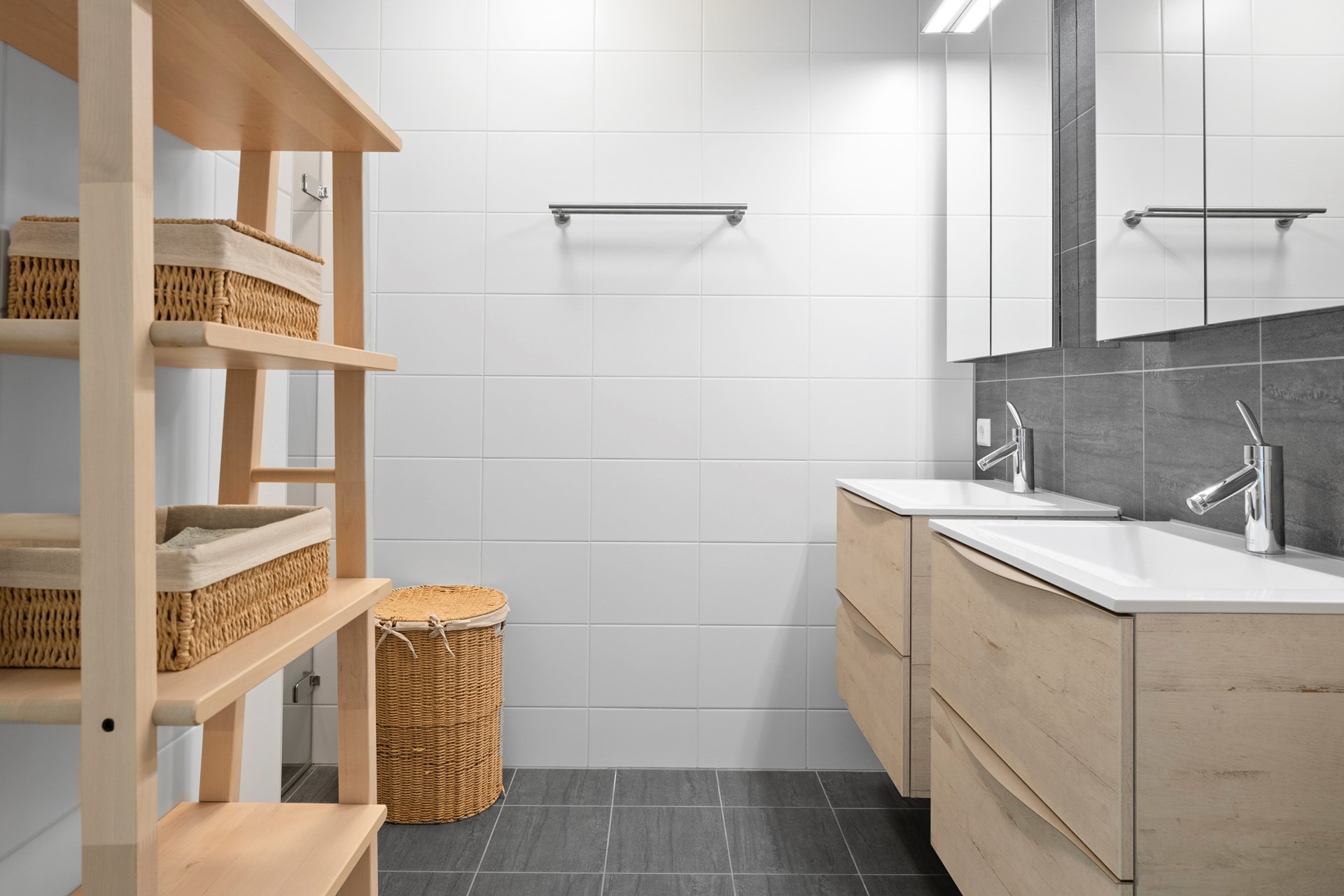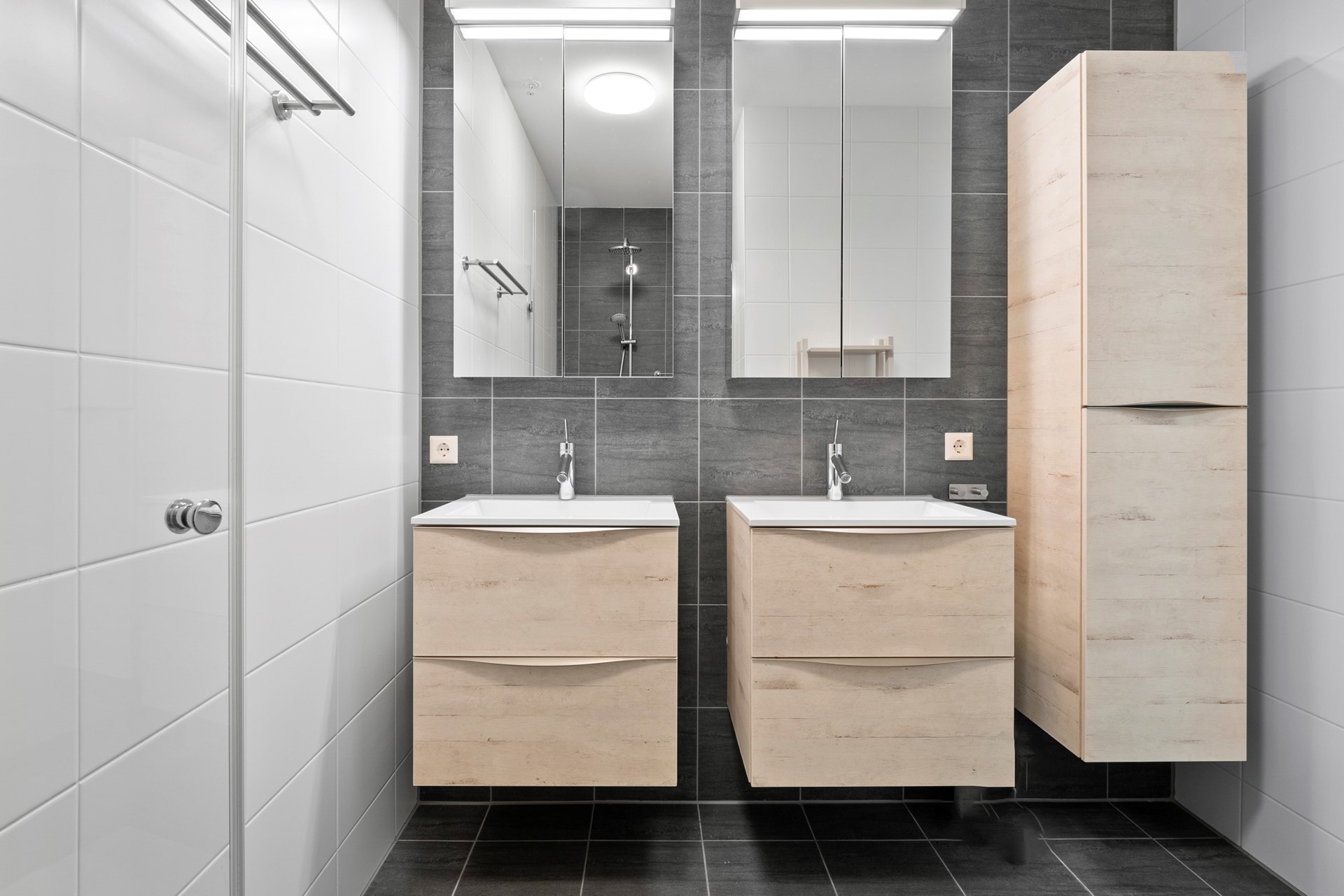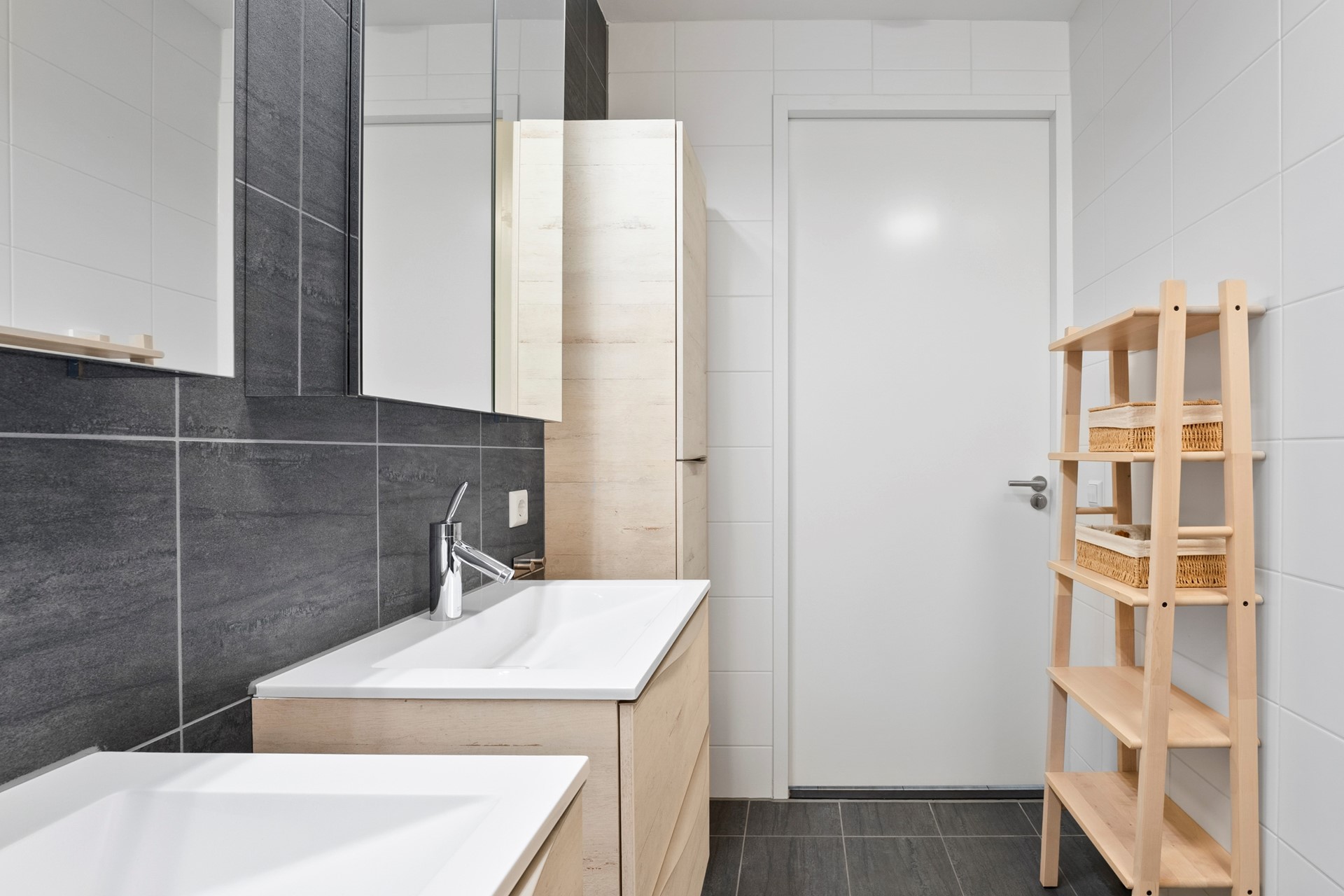 Het appartement beschikt over twee goed bemeten slaapkamers, een moderne badkamer met inloopdouche en dubbele wastafel, een separaat toilet en een praktische technische ruimte.