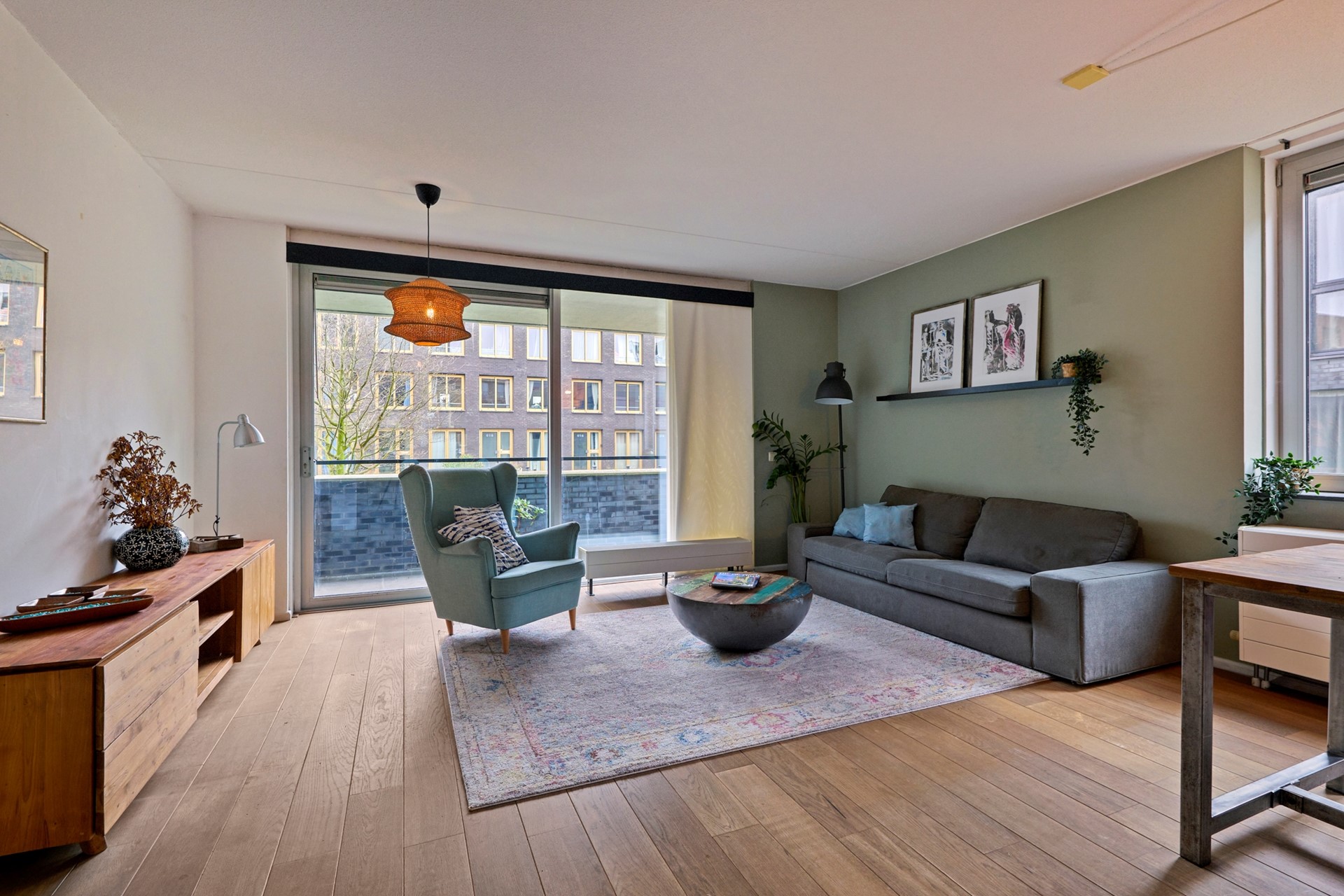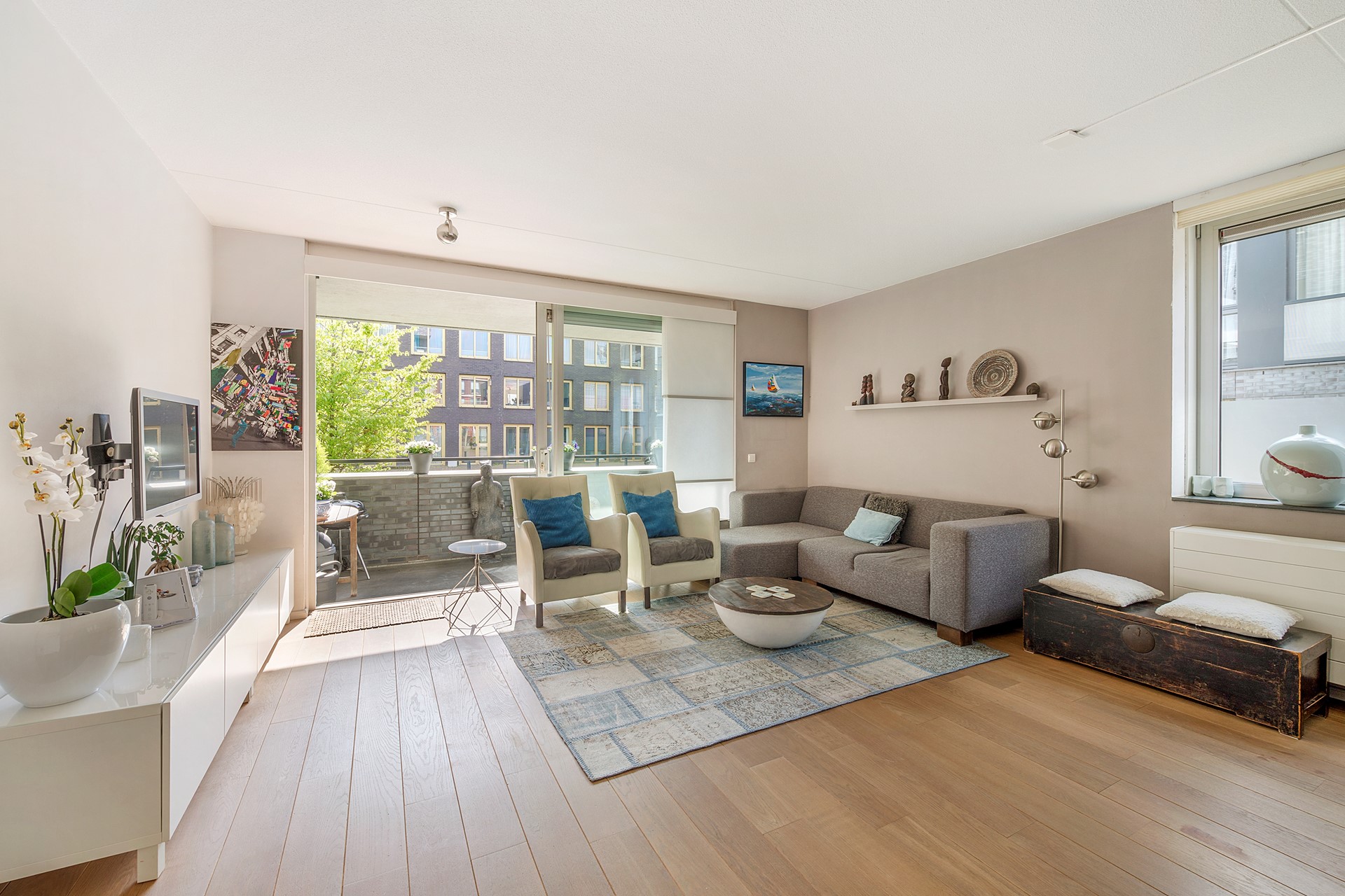 Aansluitend bevindt zich het royale balkon van circa 10 m² op het zuidwesten, grenzend aan een goed onderhouden binnentuin. Een groene, beschutte plek waar u in al vanaf het voorjaar comfortabel buiten kunt zitten.