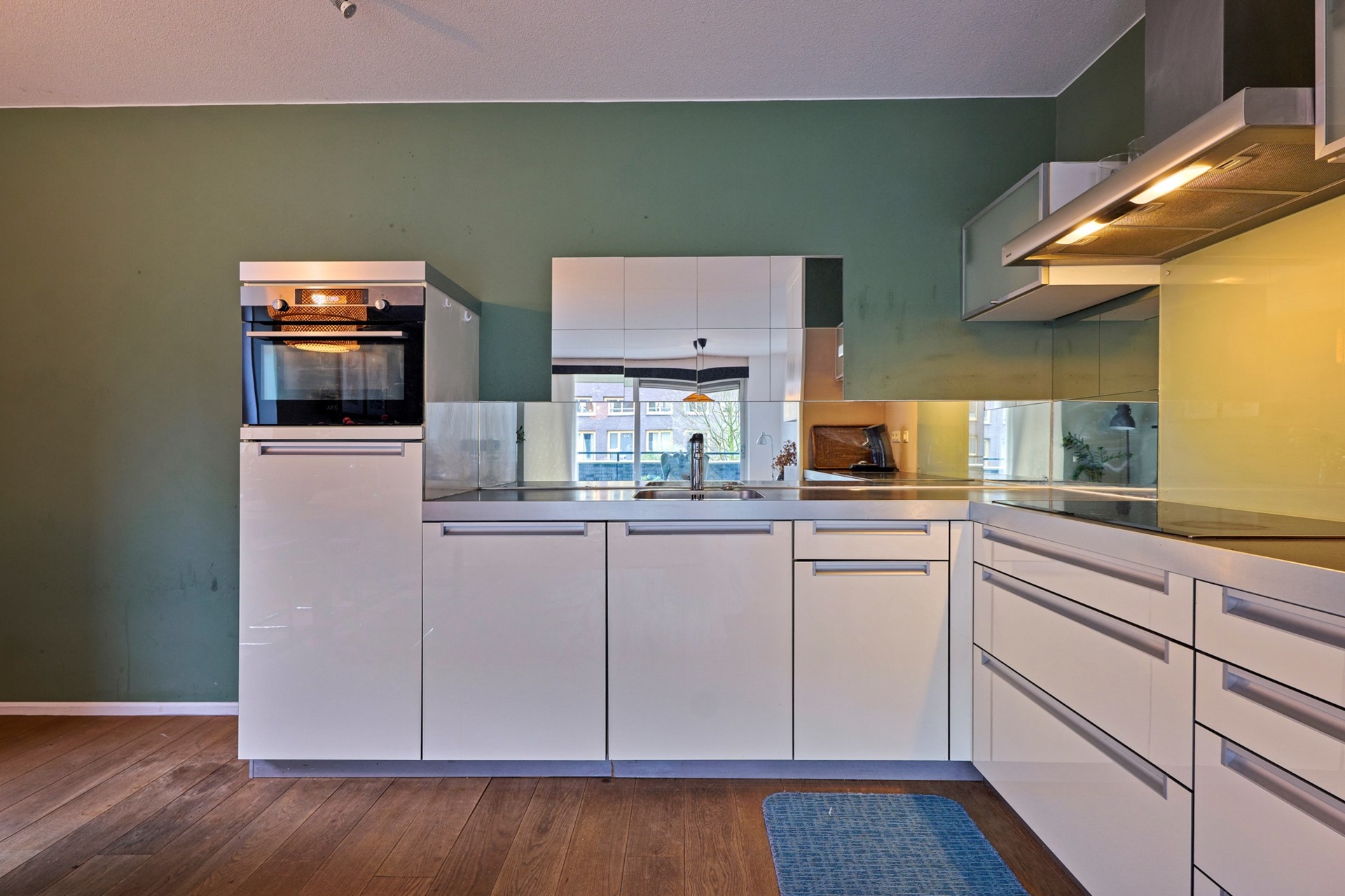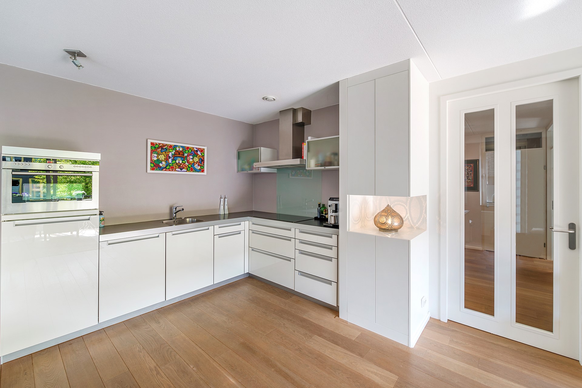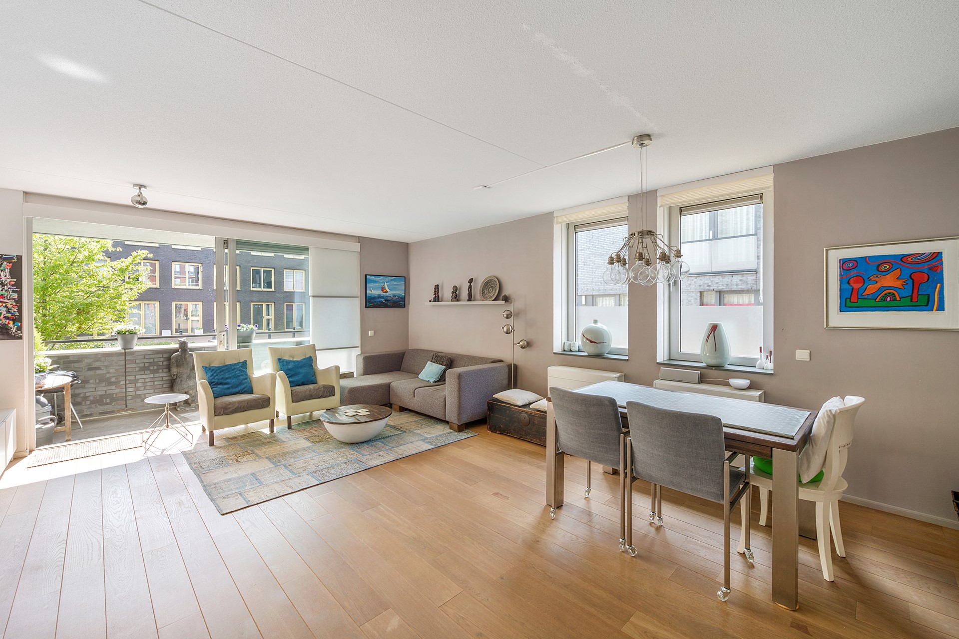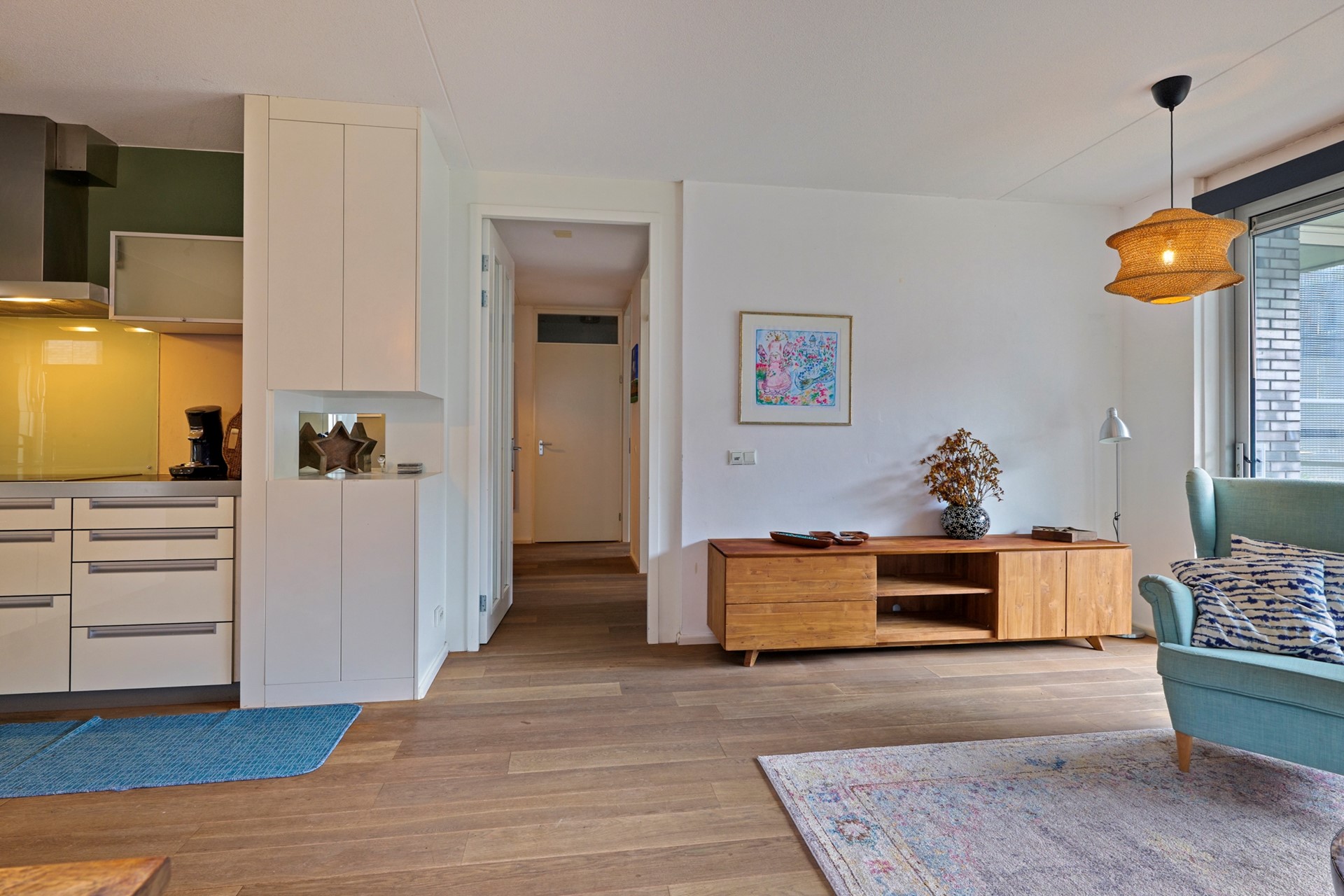 Binnen is het appartement praktisch ingedeeld en verzorgd afgewerkt. De drempelloze eikenhouten vloer loopt door het gehele appartement en geeft een rustige, warme uitstraling. De brede raampartijen en slimme indeling versterken het open karakter van de woonkamer.