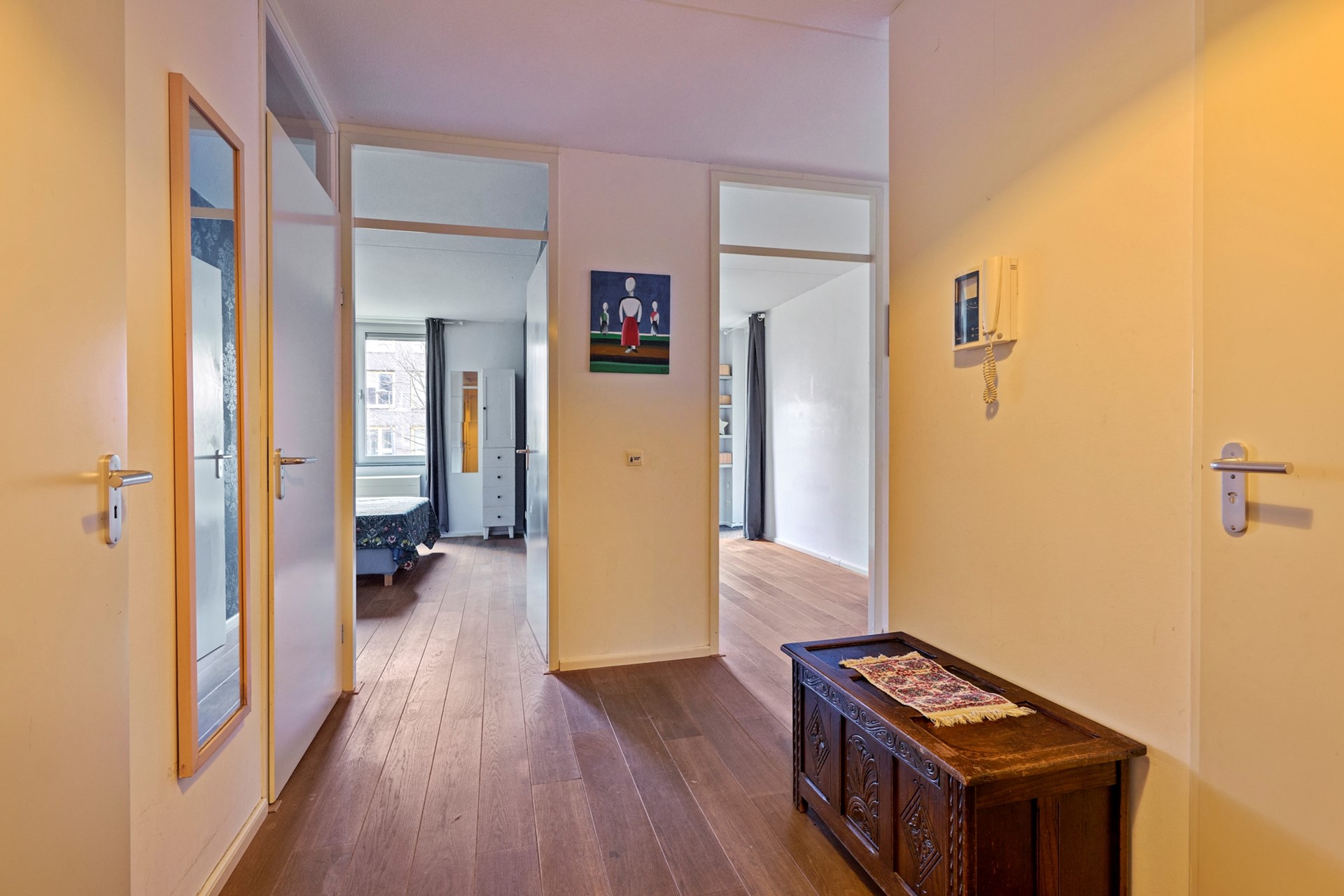 The lay-out: a central, well-maintained entrance with a spacious high hall. From here, both the apartment and the elevator to the parking garage and upper floors are accessible.
