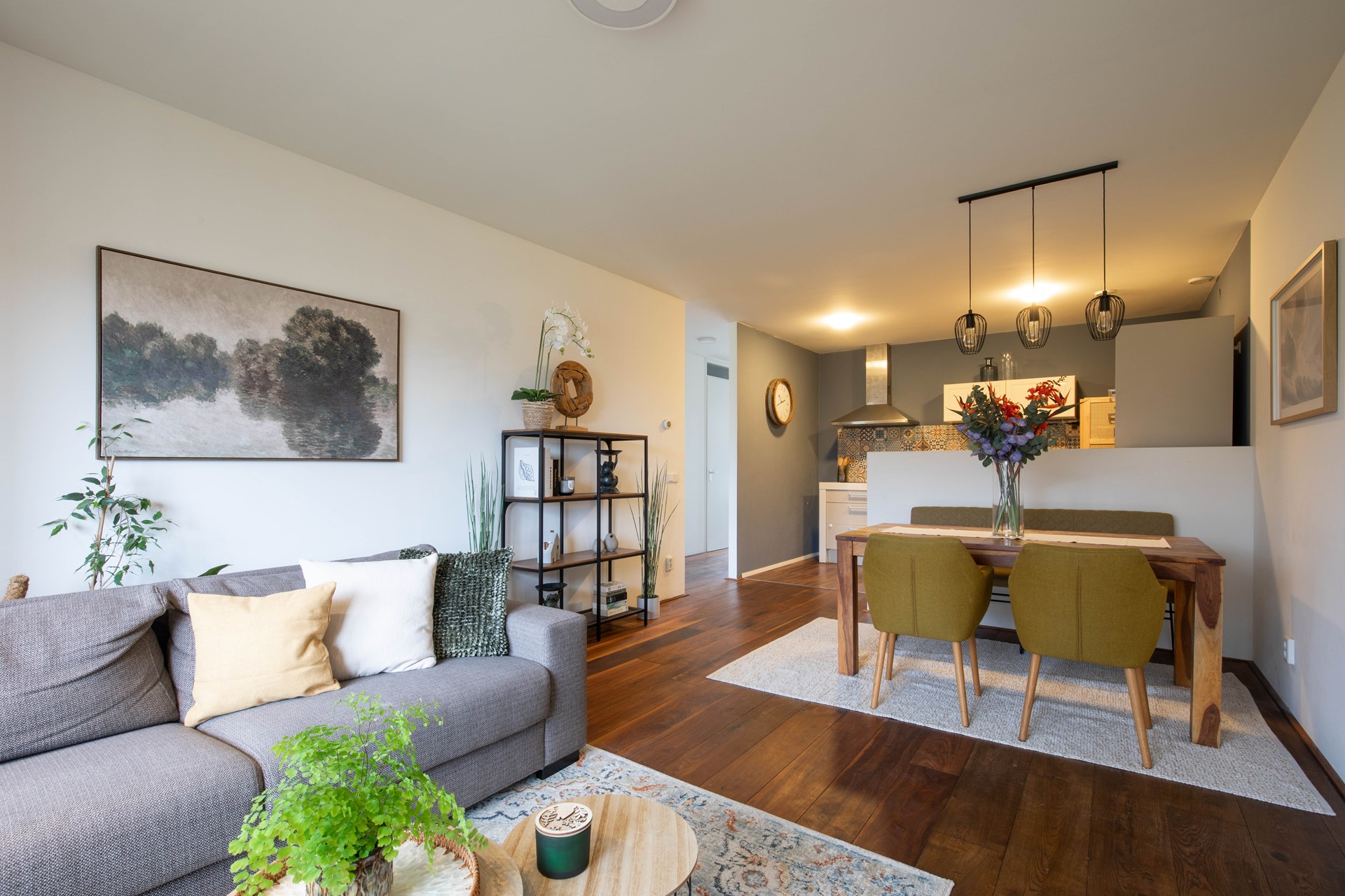 De woonkamer biedt ruimte voor een royale zithoek en eethoek. De eikenhouten vloer zorgt voor warmte en een rustige uitstraling.