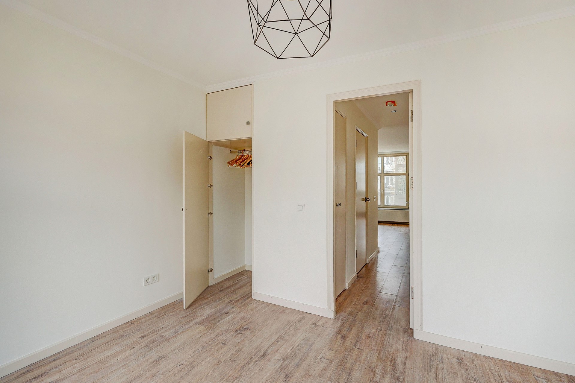 De ruime slaapkamer aan de voorzijde van de woning biedt voldoende plek voor een tweepersoonsbed en een bezit over een inbouwkast. Grote ramen die uitkijken op de straat zorgen voor extra licht en ventilatie.