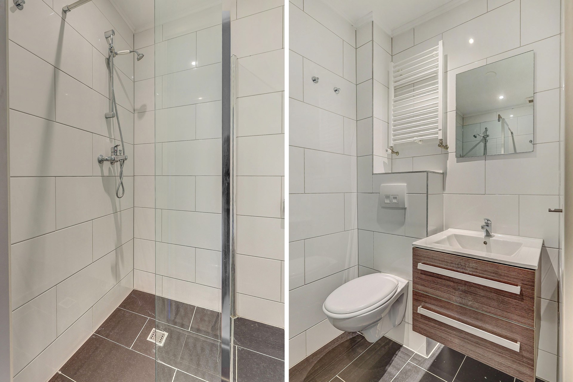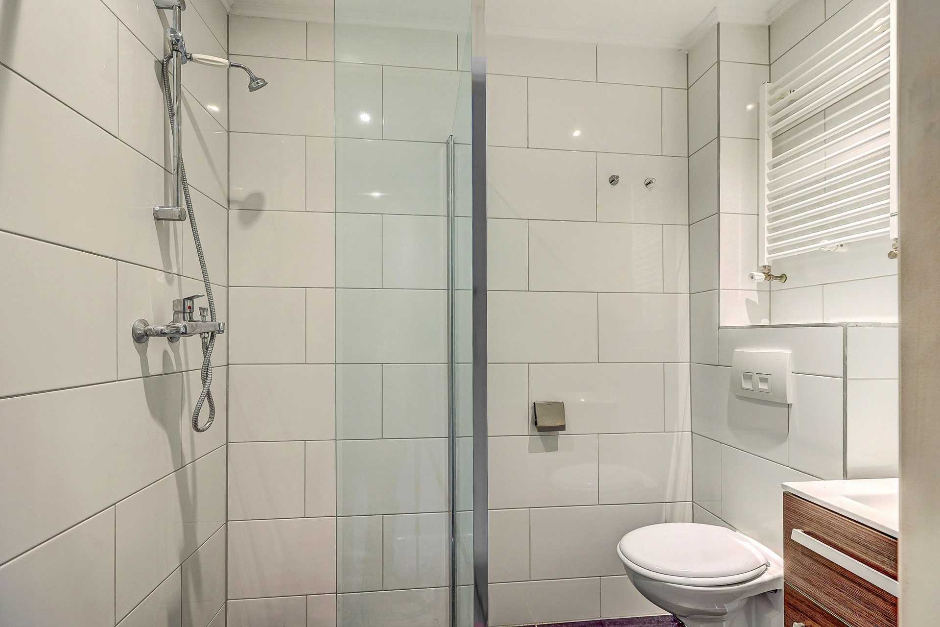 De badkamer is efficiënt ingedeeld en beschikt over een douche, wastafel en toilet. In de gang is er ook een extra ruimte voor een wasmachineaansluiting.