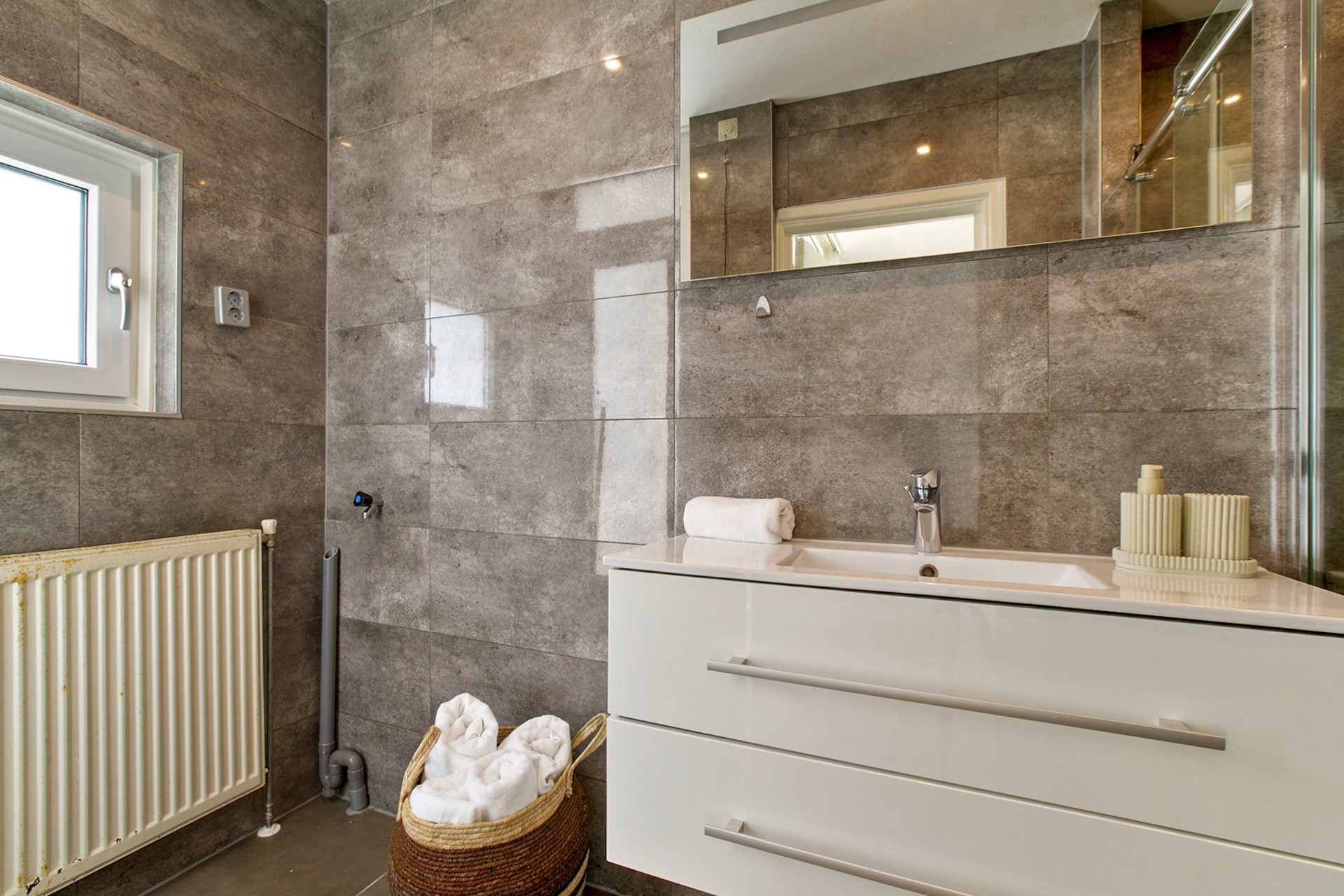 De badkamer is modern en functioneel, voorzien van een douche en wastafel, en biedt directe toegang tot het tweede balkon. Het separate toilet zorgt voor extra comfort in het dagelijks gebruik.